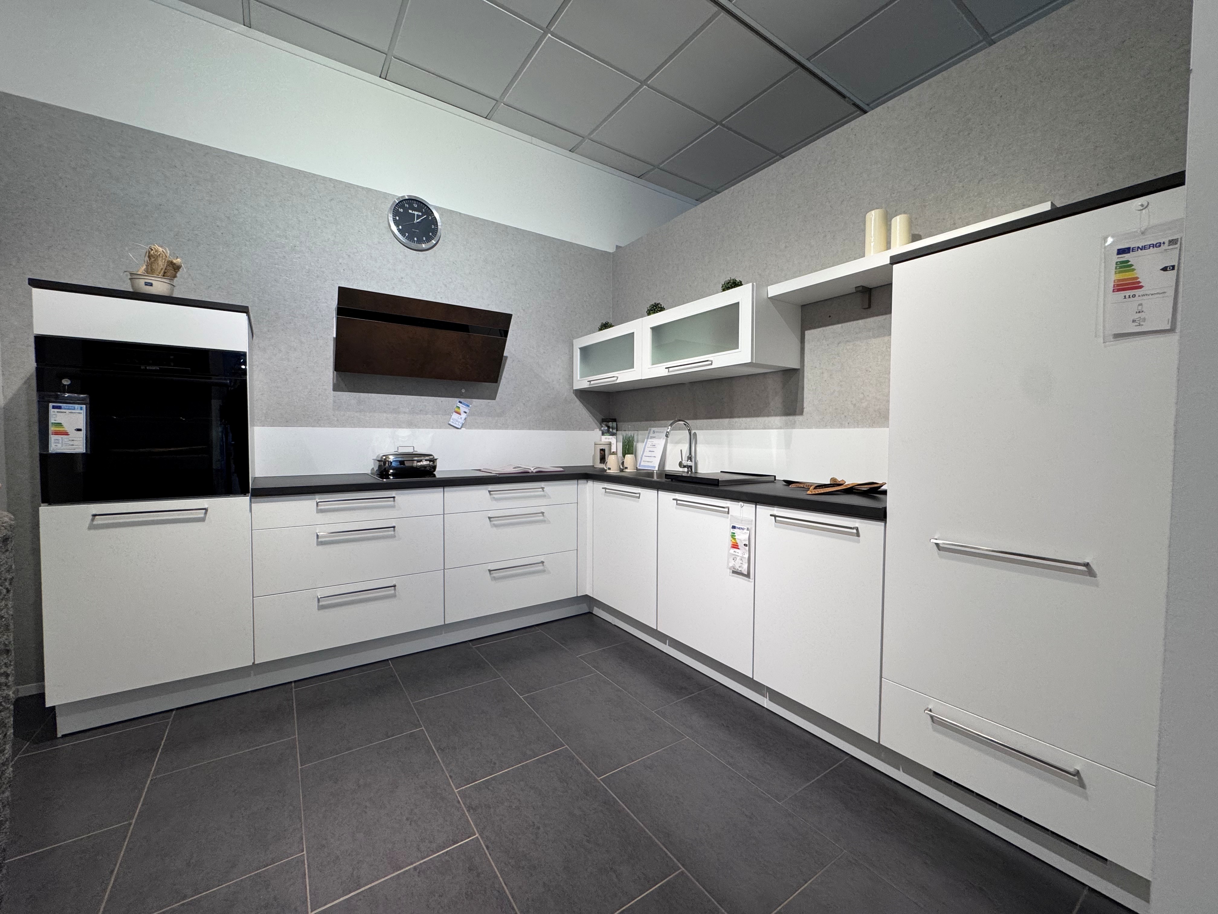 Moderne L-Küche in Alpinweiß mit edler Schwarzbeton Nb.-Arbeitsplatte. Hochwertige Ausstattung: Pyrolyse-Backofen für mühelose Reinigung, Kühlschrank mit zwei 0°-Fächern für maximale Frische. Stilvolles Design trifft auf Funktionalität – perfekt für Ihre Küche!