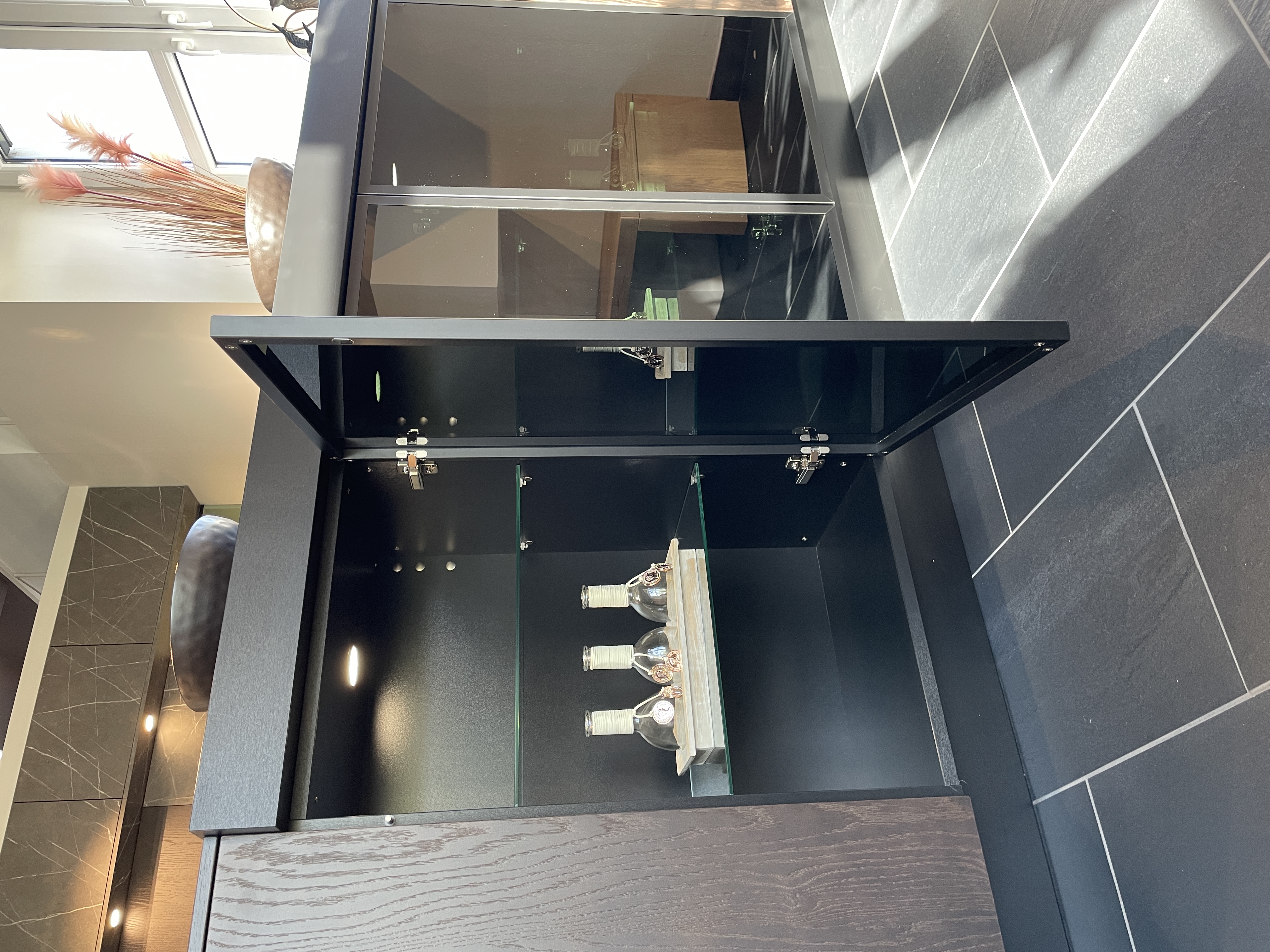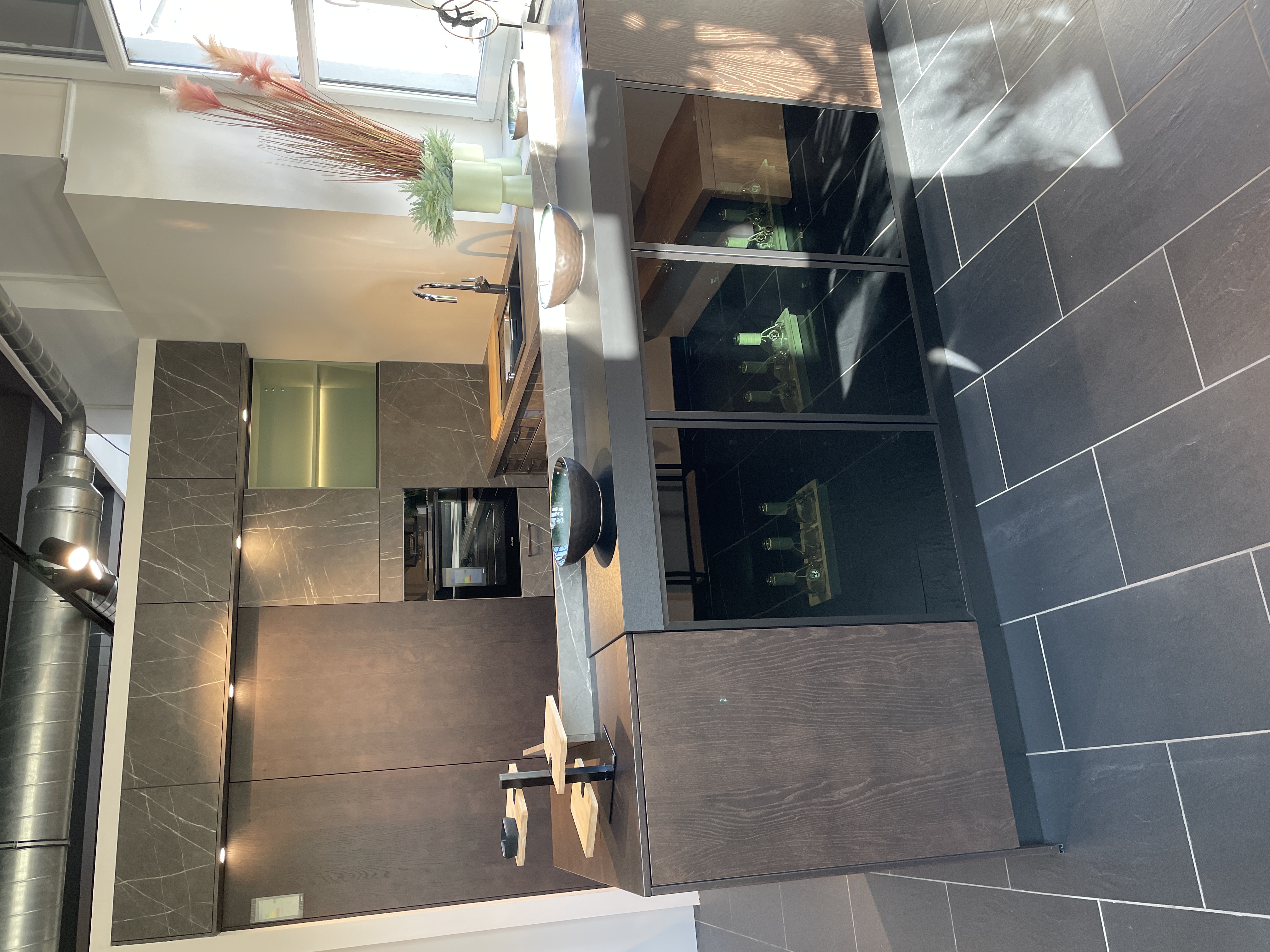 Das Kochfeld ist für ein modernes DownAir-System vorbereitet und bietet maximale Freiheit bei der Planung. Hinter dem Kochbereich setzt eine graue Glasrückwand mit elegantem Schilf-Motiv einen stilvollen Akzent, der Design und Leichtigkeit perfekt verbindet. Auf der Rückseite des Kochfeldes sorgen hochwertige Glasvitrinen für Transparenz und eine außergewöhnliche Tiefenwirkung im Raum.