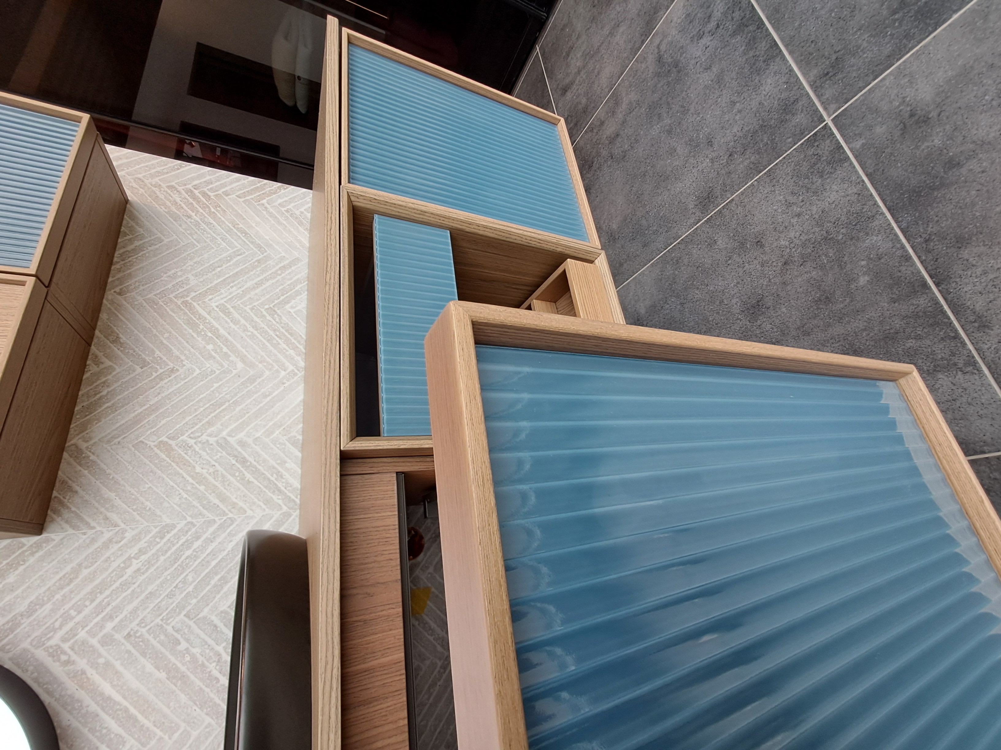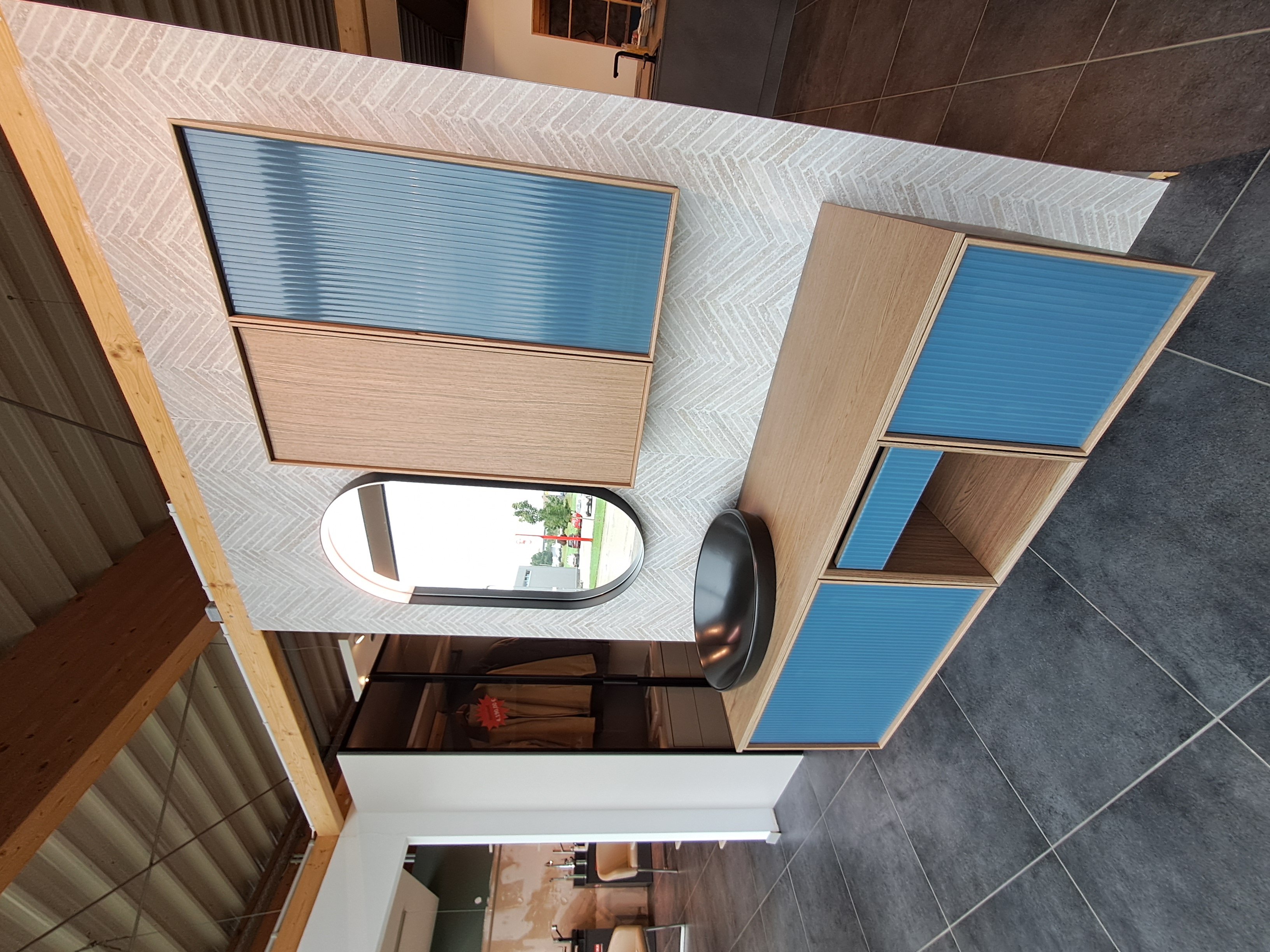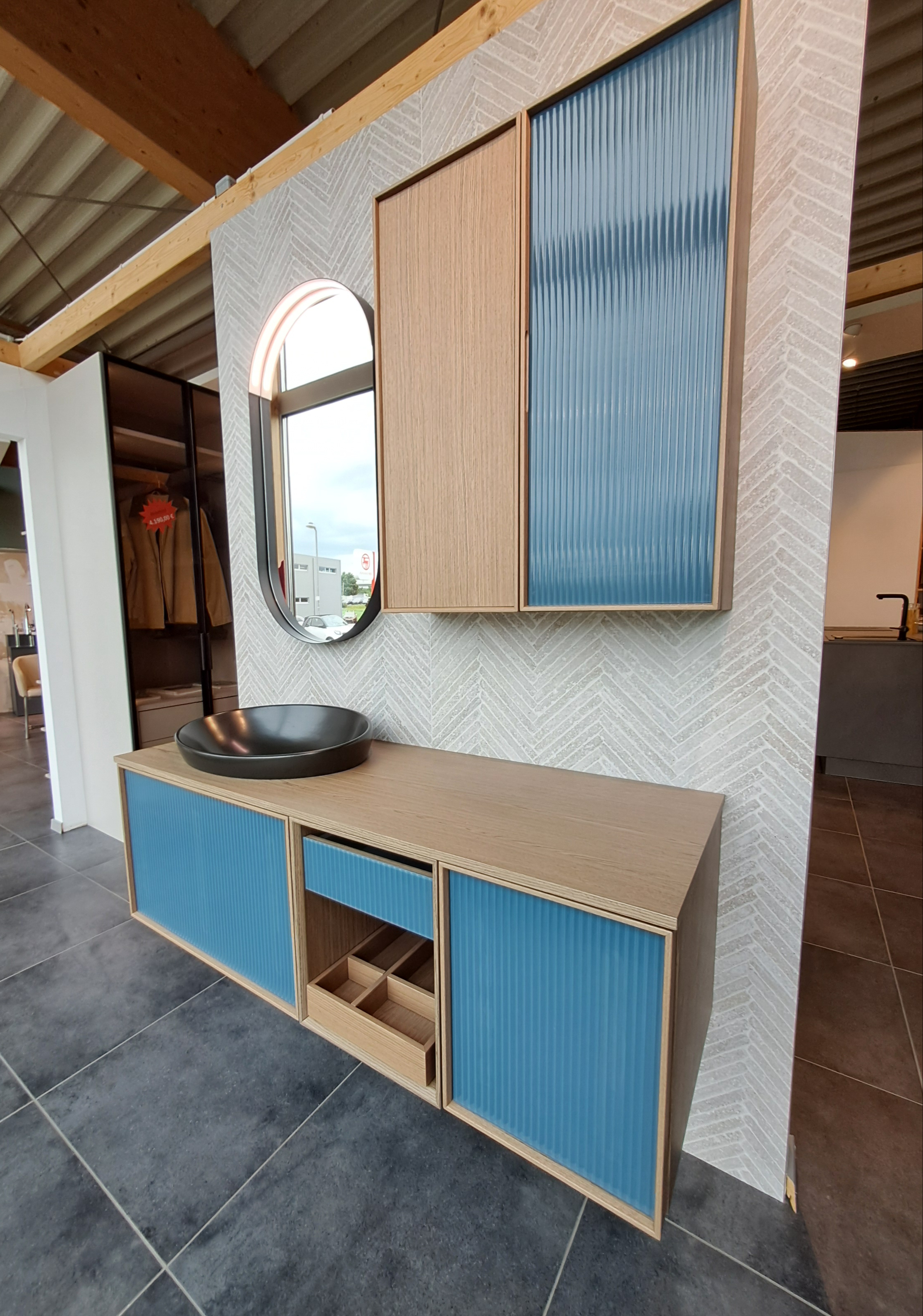 Badmöbel aus der Kollektion Mobiltesino SUPERLUCE DEVORÉ in Holzfurnier Noce Canaletto und teilweise Glasfront Plissé Azzurrette