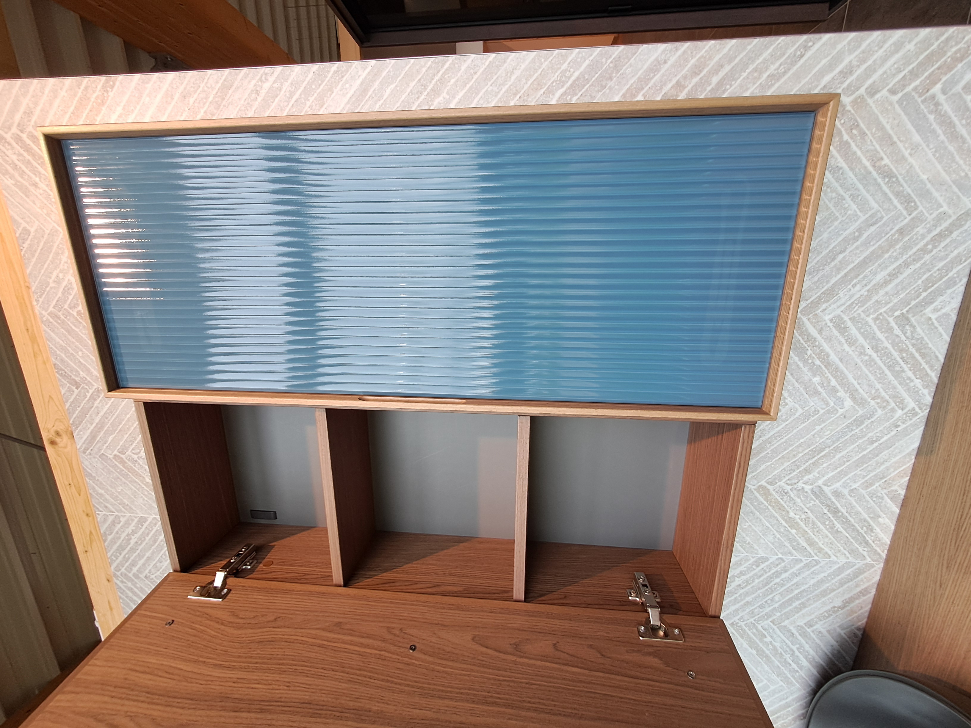 - einem Hängeschrank mit Holzfurniertür und einem Hängeschrank mit Glastür (zusammen 70 cm breit x 20 cm tief x 90 cm hoch)