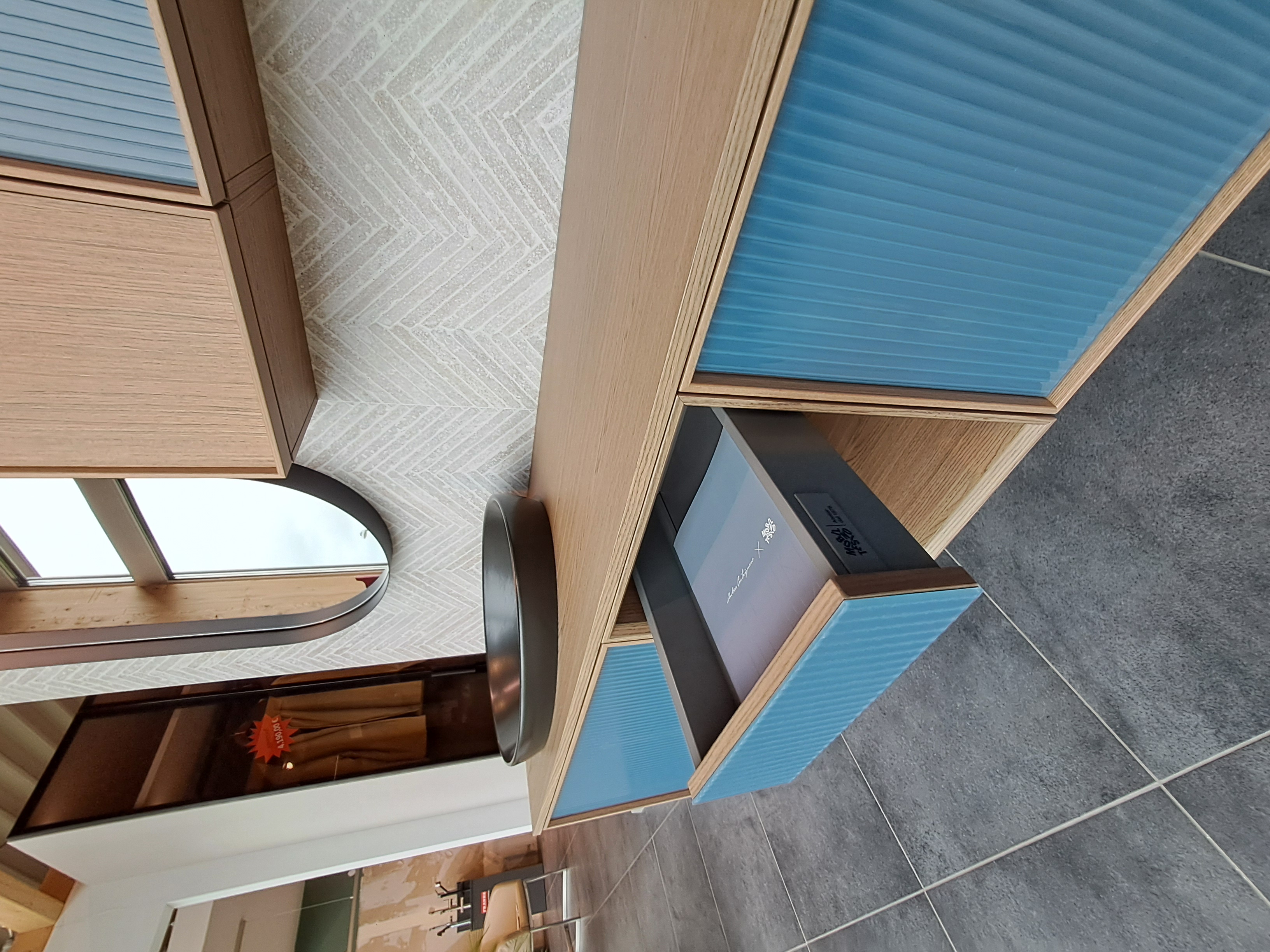 | FRONTFARBE | Holzfurnier Noce Canaletto und teilweise Glasfront Plissé Azzurrette |
