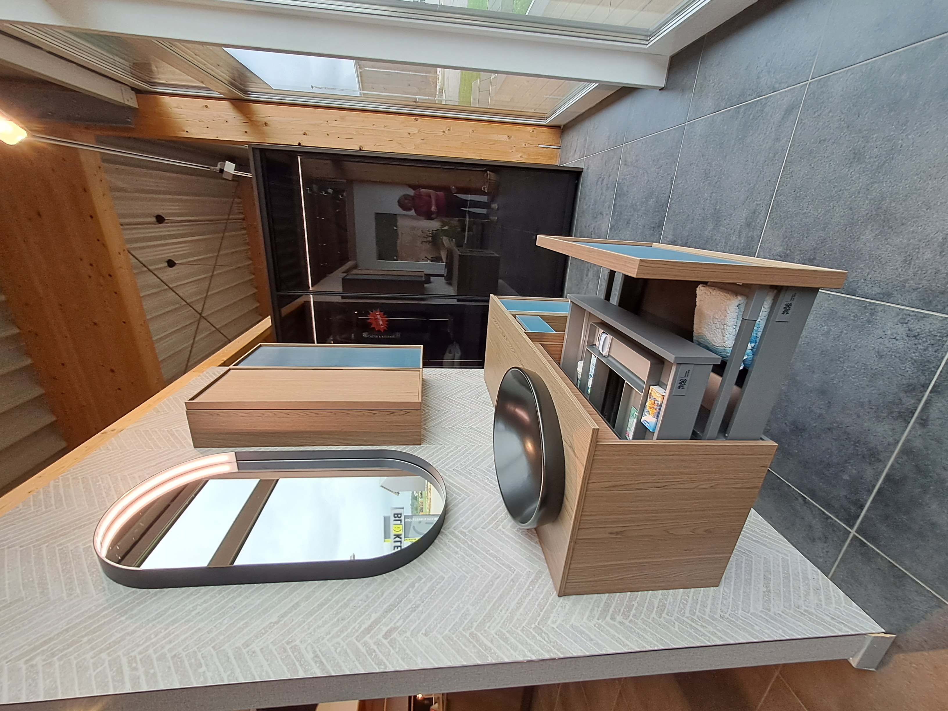 - einem Waschtischunterschrank mit 1 Auszug und einer innenliegenden Schublade mit Innenbeleuchtung (140 cm breit x 51 cm tief und 47 cm hoch)