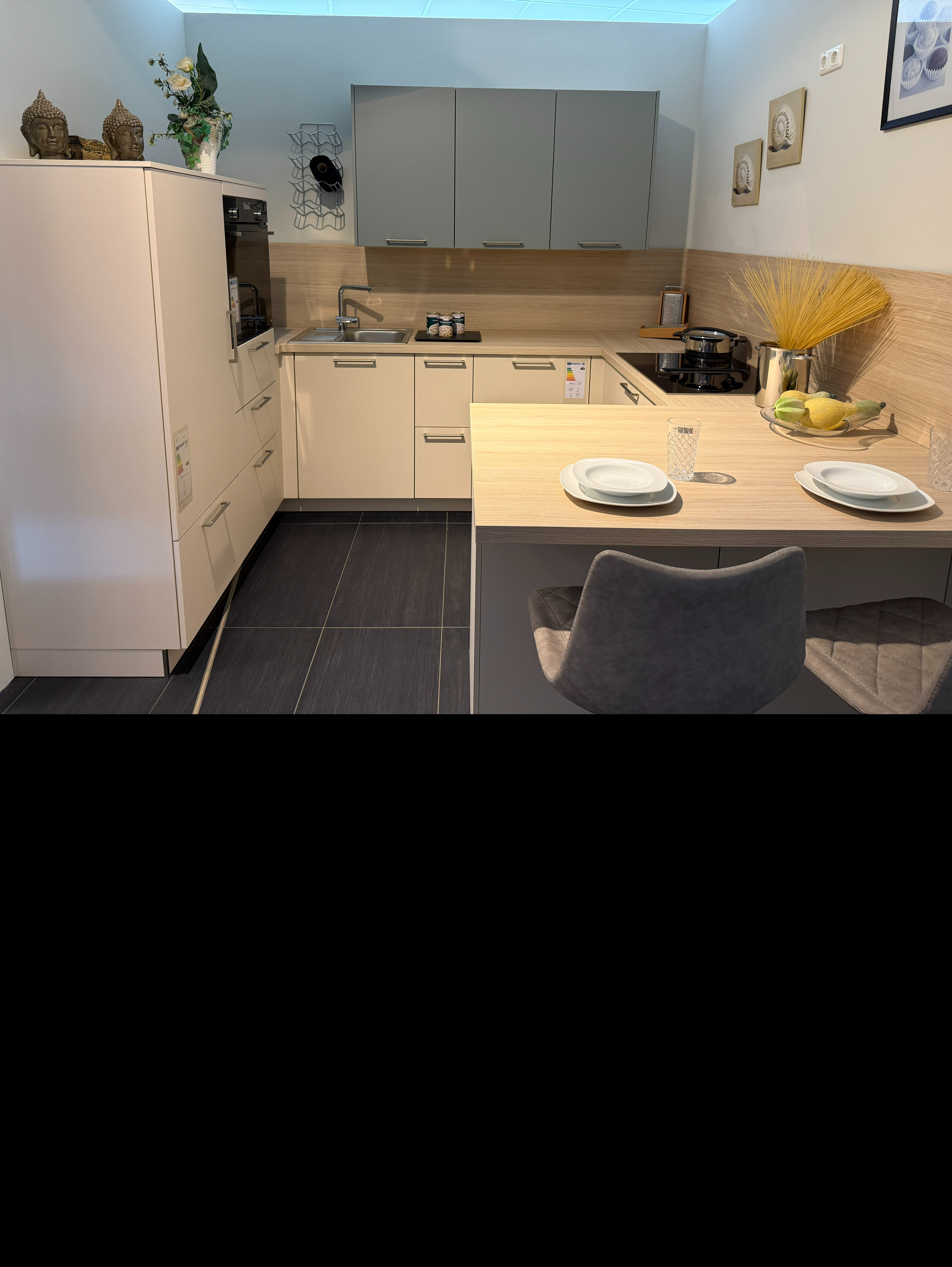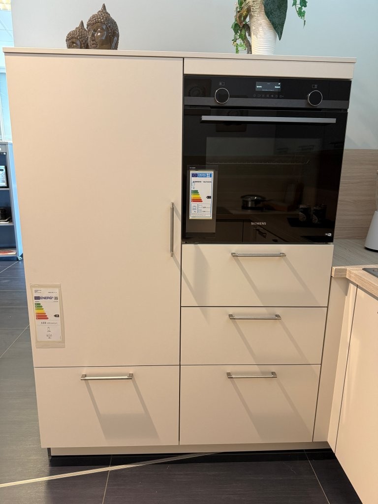 Diese stilvolle Küche vereint modernes Design mit praktischer Funktionalität! Die edlen Fronten in Crema Magnolie harmonieren perfekt mit den Hängeschränken im trendigen Eukalyptus-Farbton. Die integrierte Sitzinsel lädt zum Frühstücken, Plaudern oder gemütlichen Kochen ein – ideal für di...