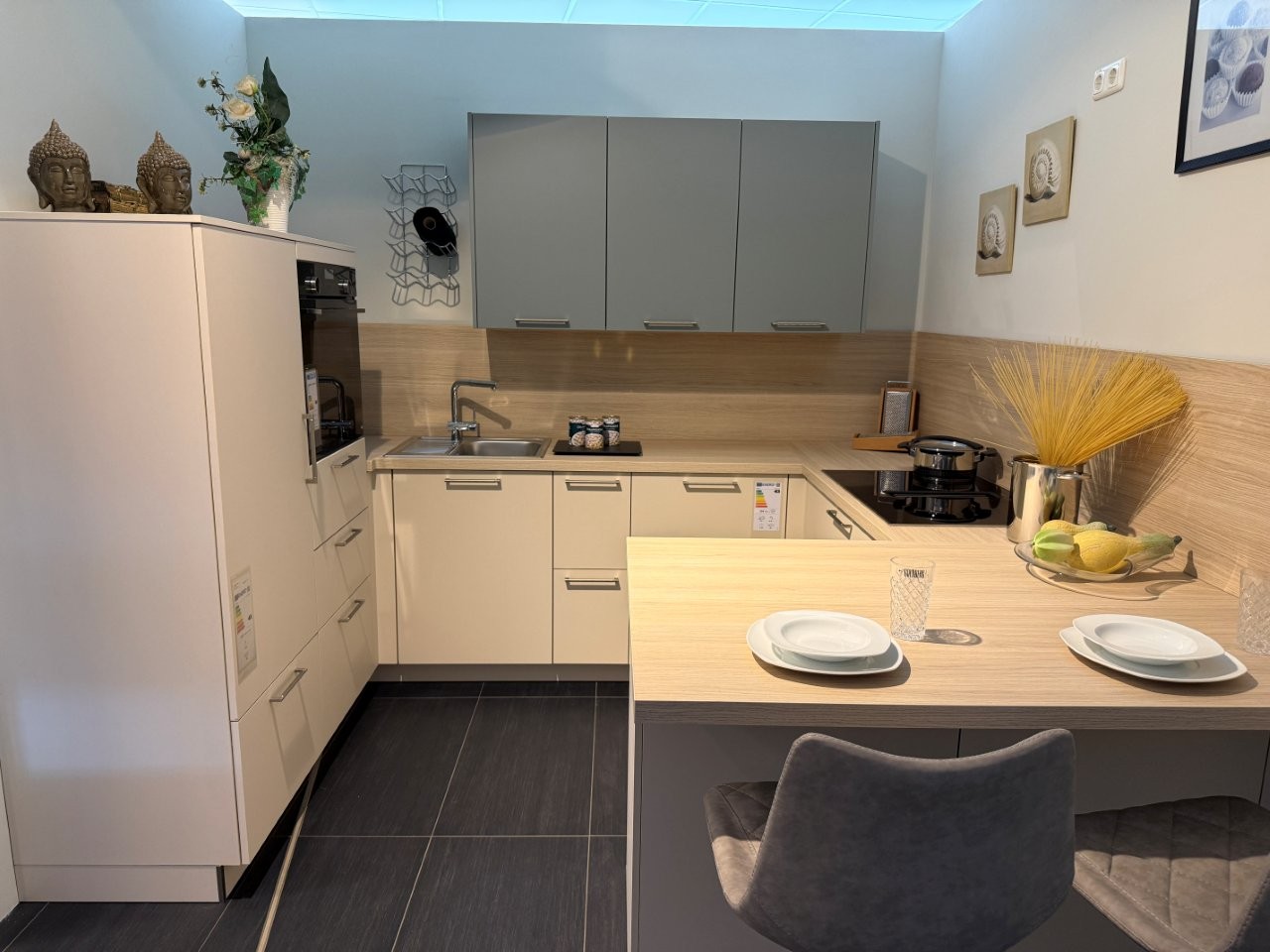 Diese stilvolle Küche vereint modernes Design mit praktischer Funktionalität! Die edlen Fronten in Crema Magnolie harmonieren perfekt mit den Hängeschränken im trendigen Eukalyptus-Farbton. Die integrierte Sitzinsel lädt zum Frühstücken, Plaudern oder gemütlichen Kochen ein – ideal für die moderne Wohnküche!