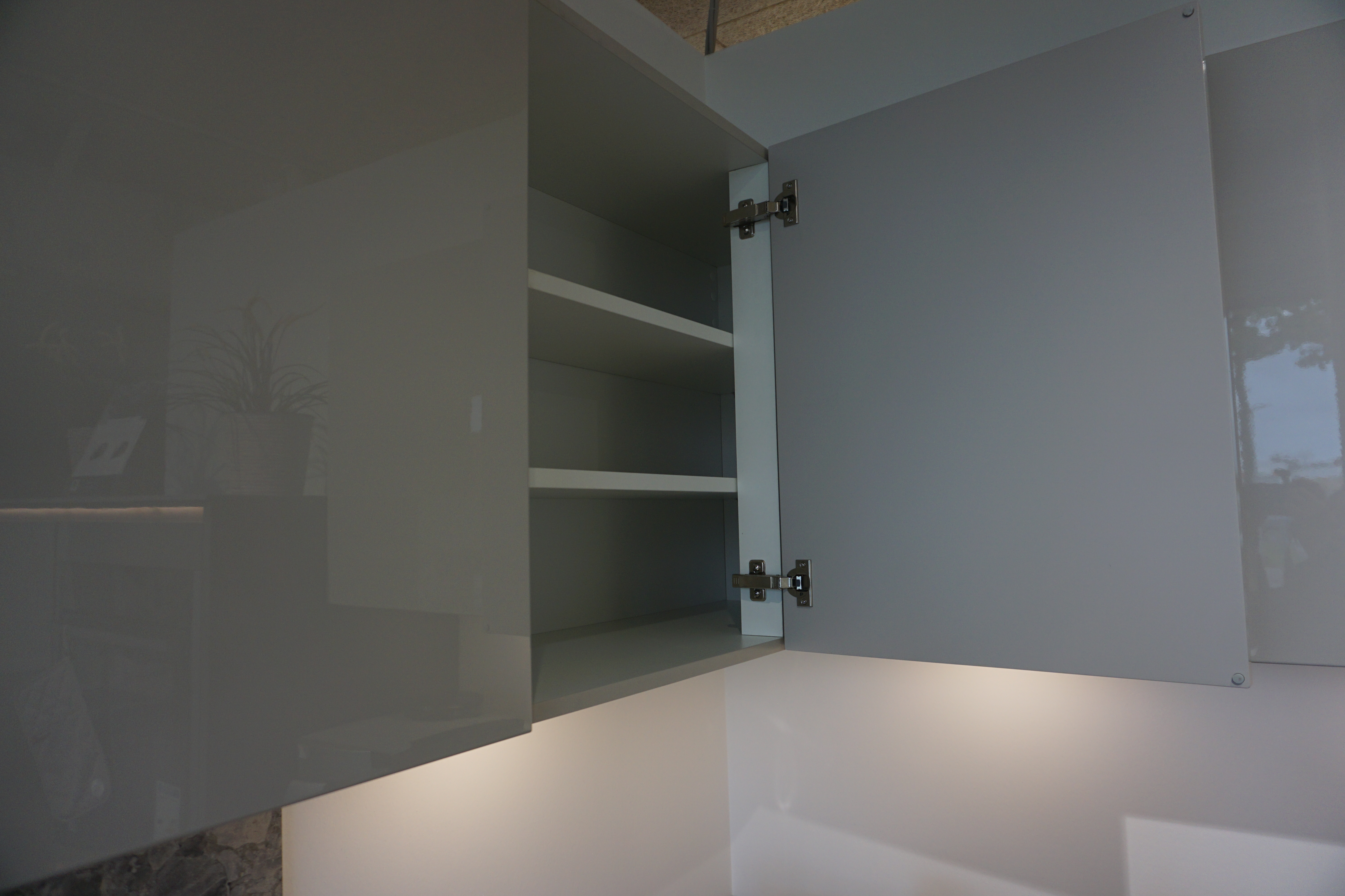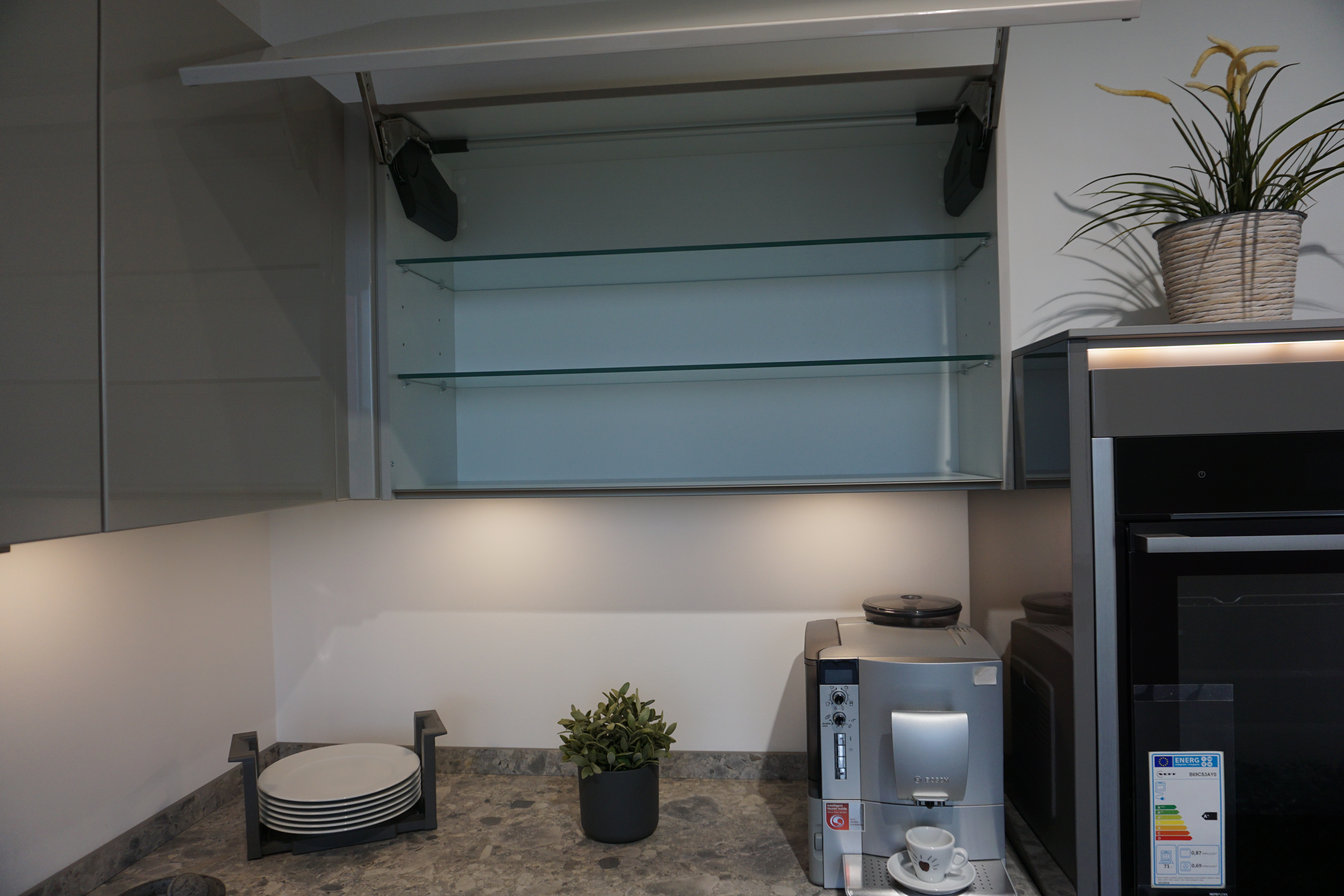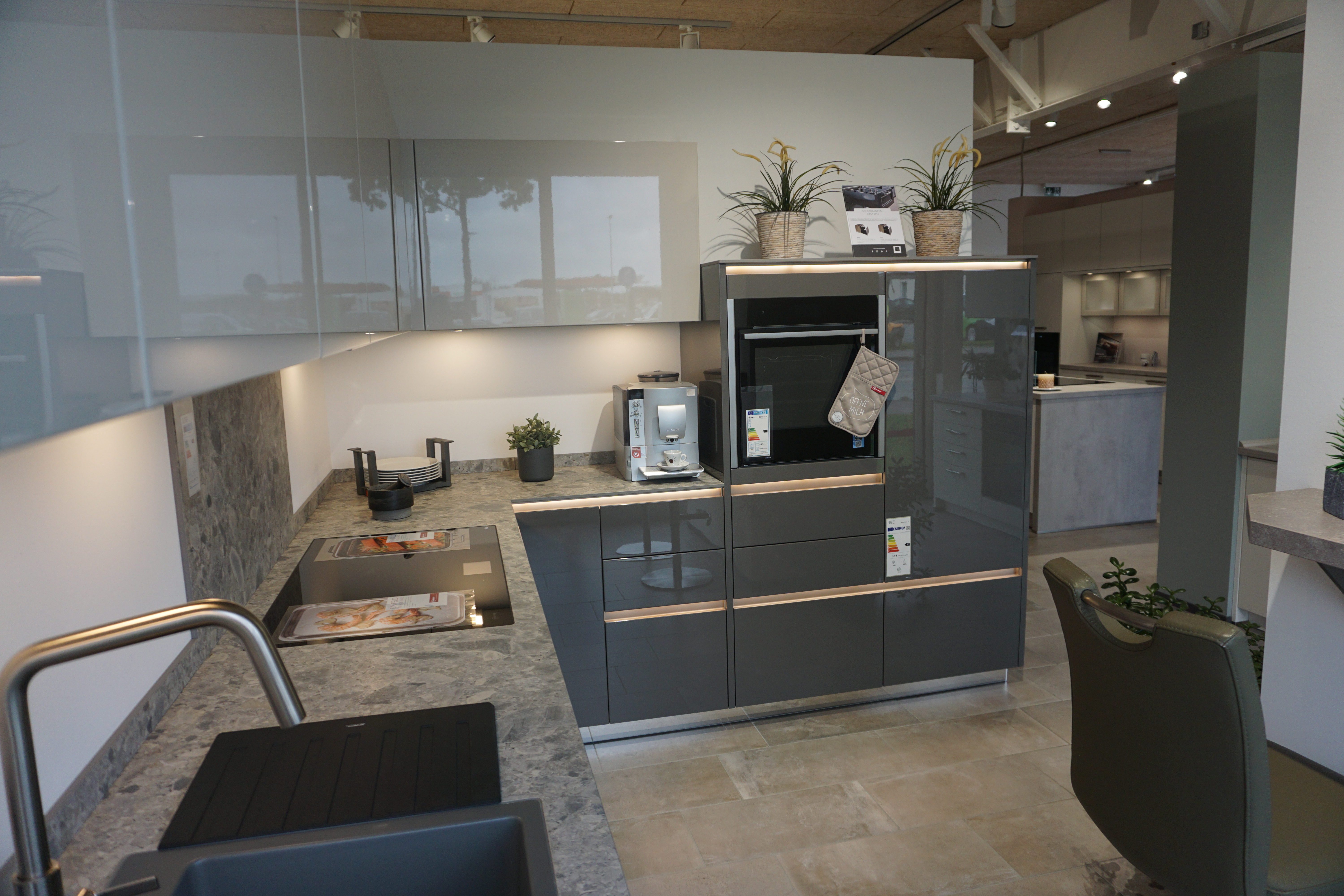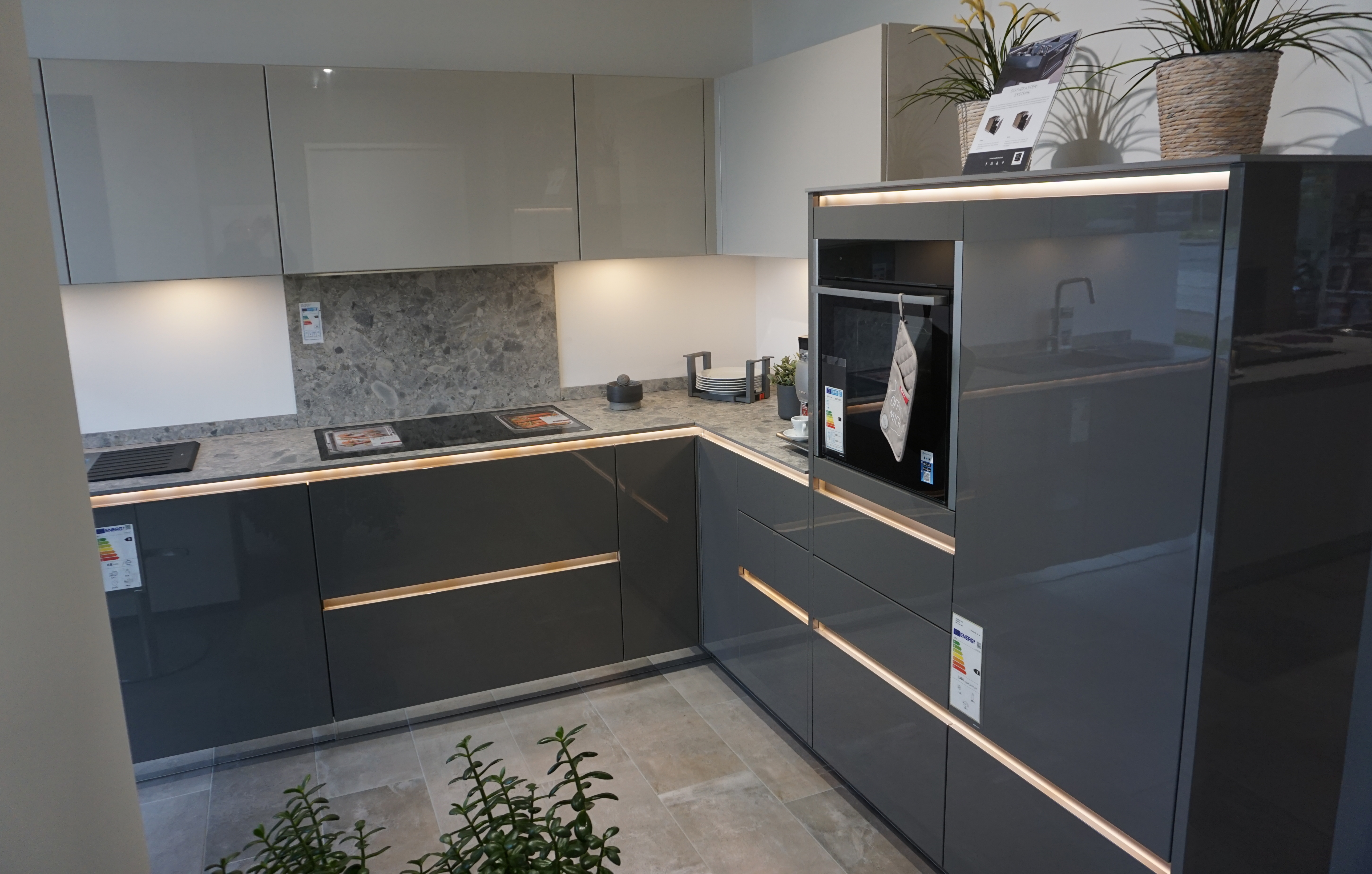 Ein echter Blickfang ist diese hochglänzende Küche, deren Unter- und Seitenschränke im Farbton Quarzgrau und die Hängeschränke im Farbton Sandbeige gestaltet sind. Eine Verbindung der Farben erfolgt über die 12 mm starke Keramikarbeitsplatte, in die die Keramikspüle und auch das Induktionskochfeld flächenbündig eingearbeitet sind. Durch das grifflose Design scheint die Arbeitsplatte zu schweben. Unterstützt wird dieser Eindruck vom Spiegelsockel. Die Beleuchtung der Griffleistenprofile ist ebenso über eine Fernbedienung steuerbar wie die Beleuchtung unter den Hängeschränken.