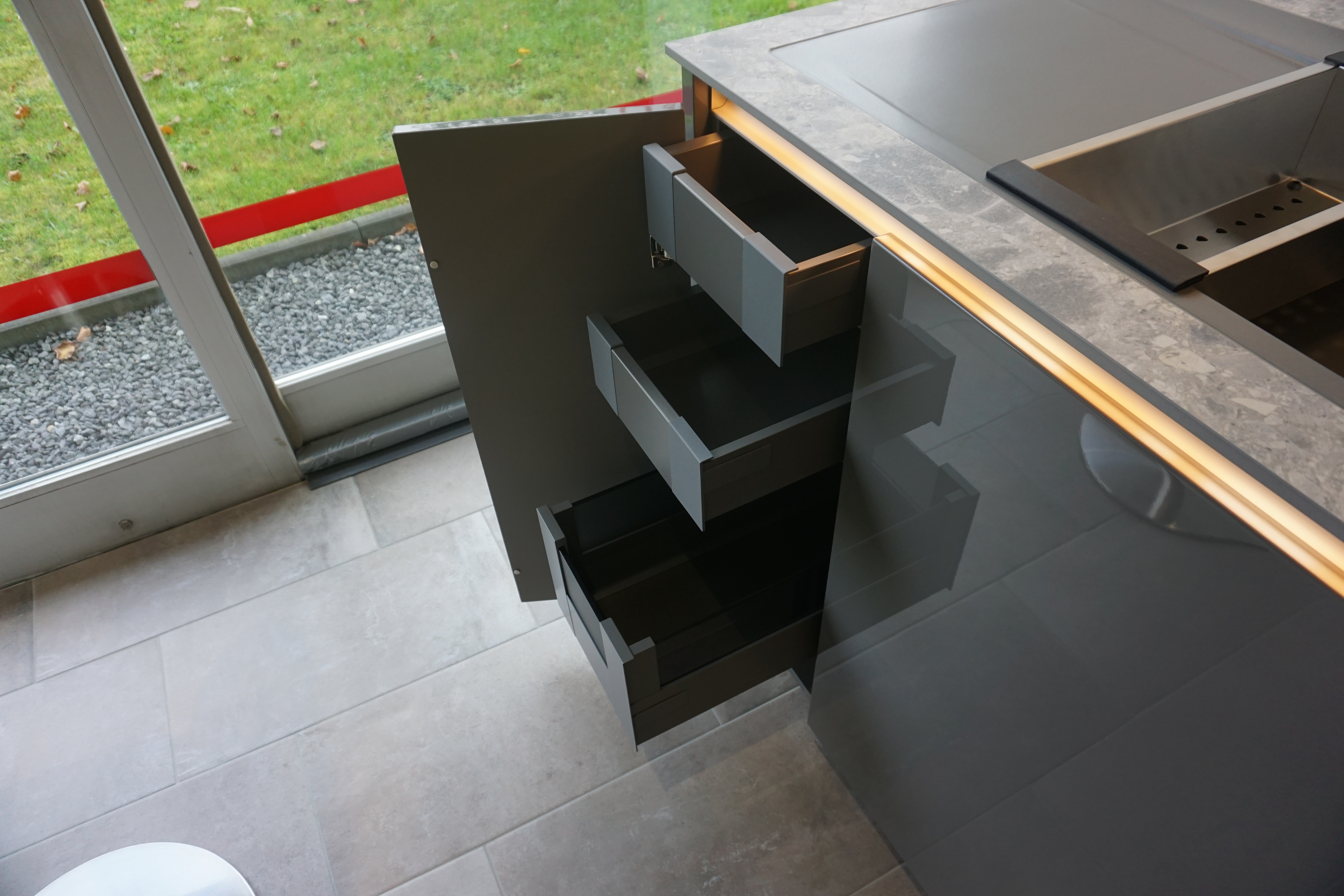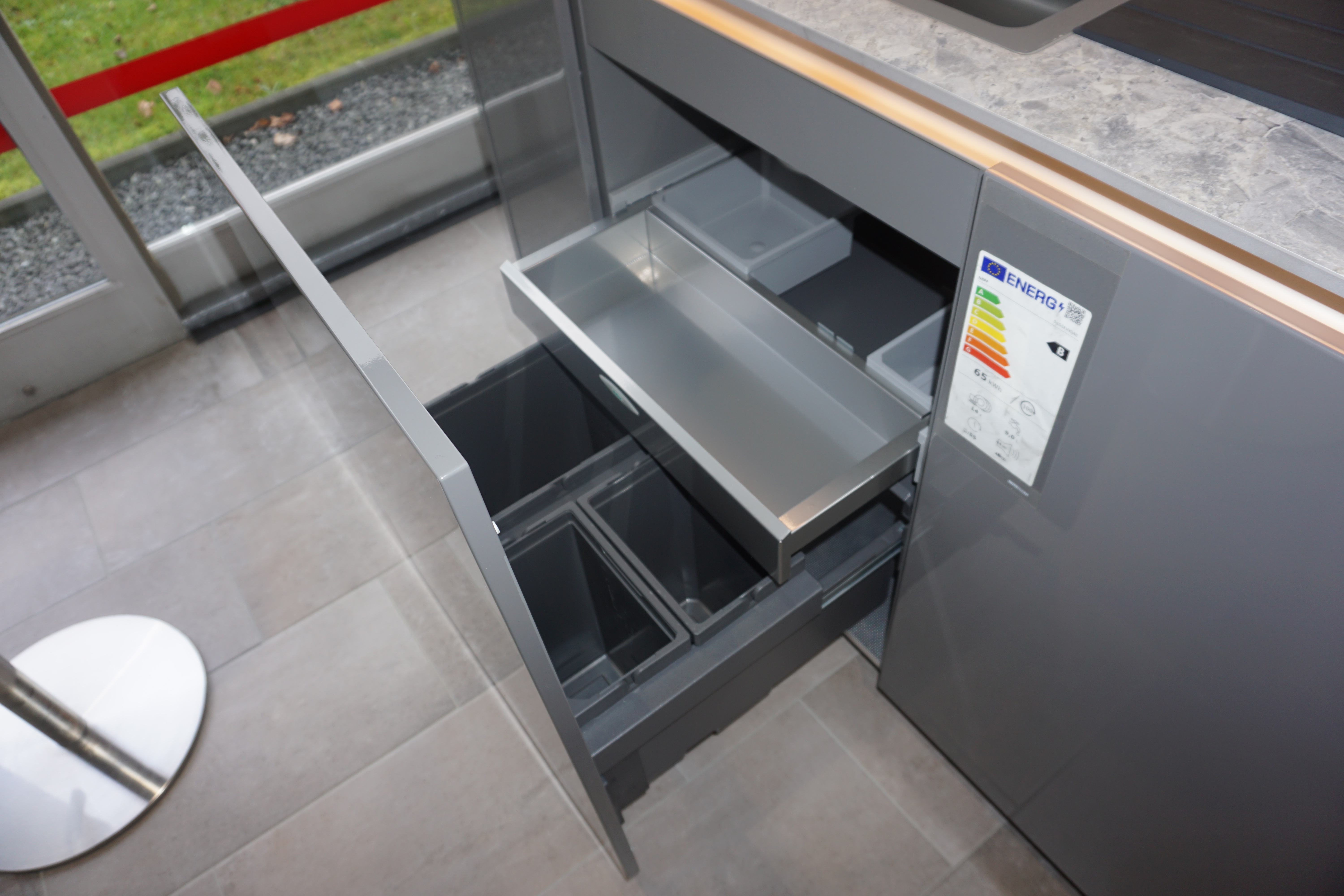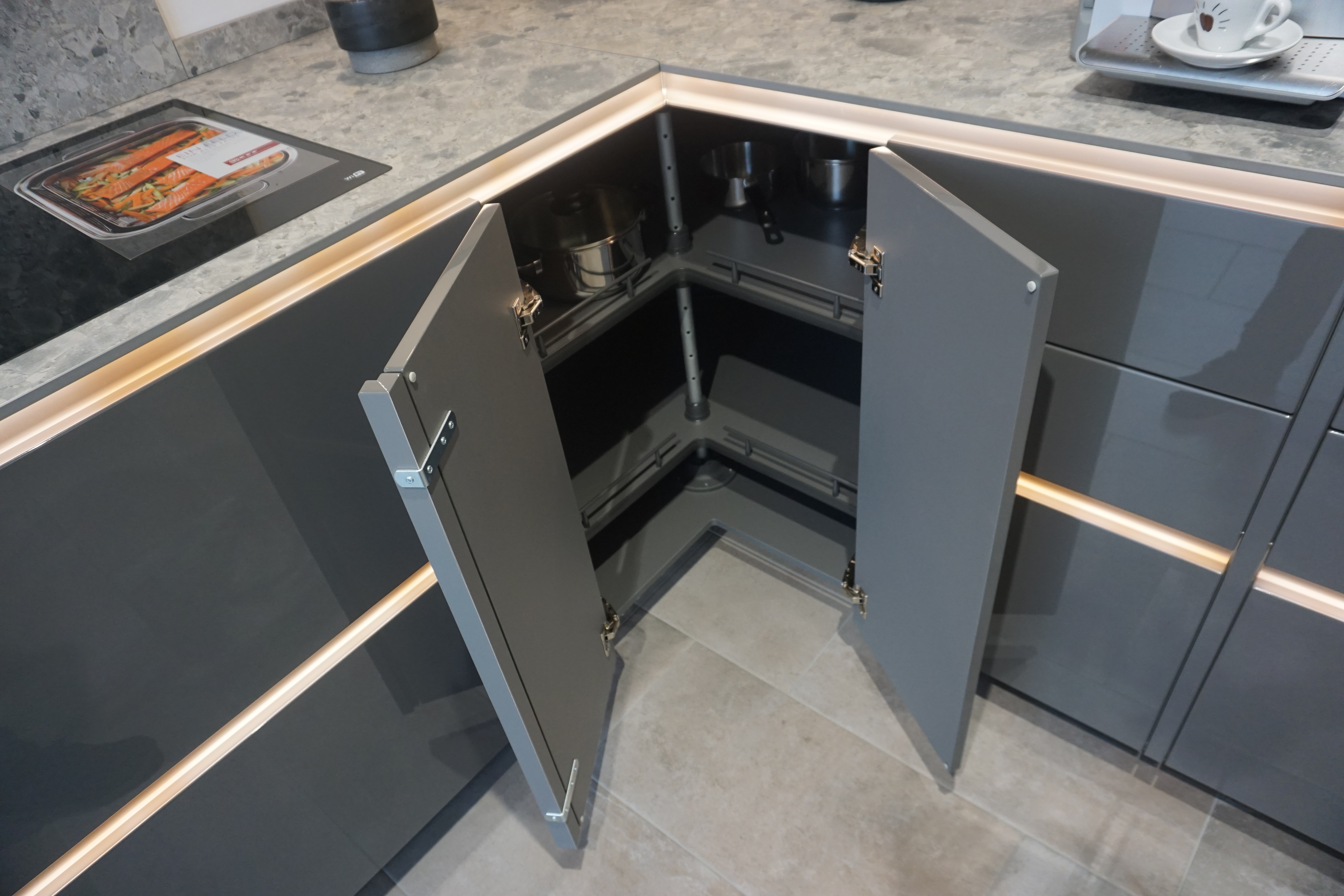 Unter der Spüle befindet sich ein Abfallsystem, welches Ordnung und Komfort verbindet. Durch die Planung eines Eckhängeschrankes und eines Karussells unterhalb der Arbeitsplatte geht kein Stauraum verloren.