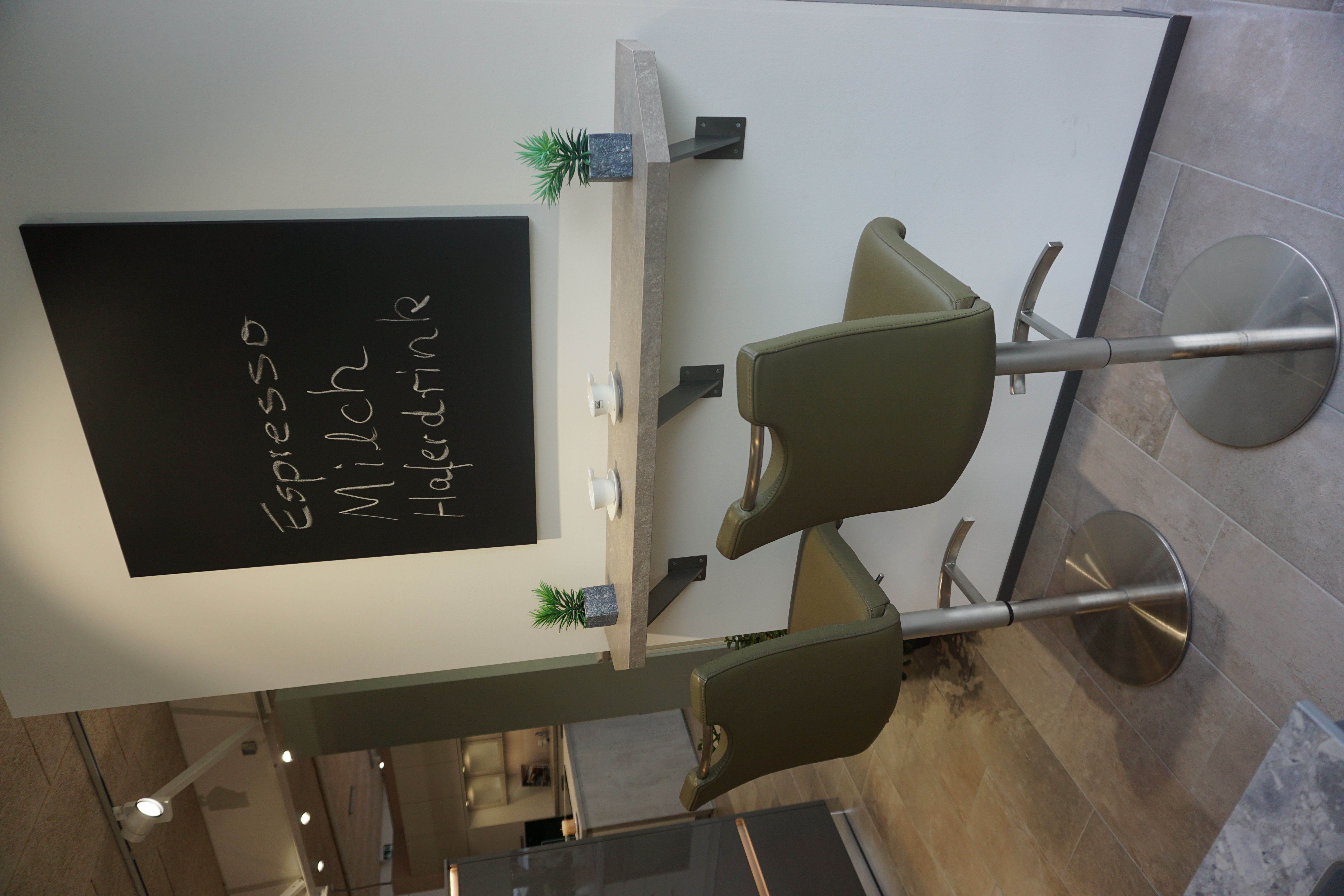 Ergänzend zur Küche in L-Form umfasst der Angebotspreis auch eine kleine Tresenlösung für einen kurzen Kaffee am Morgen einschließlich zwei Hocker mit Edelstahlfuß und Lederbezügen.