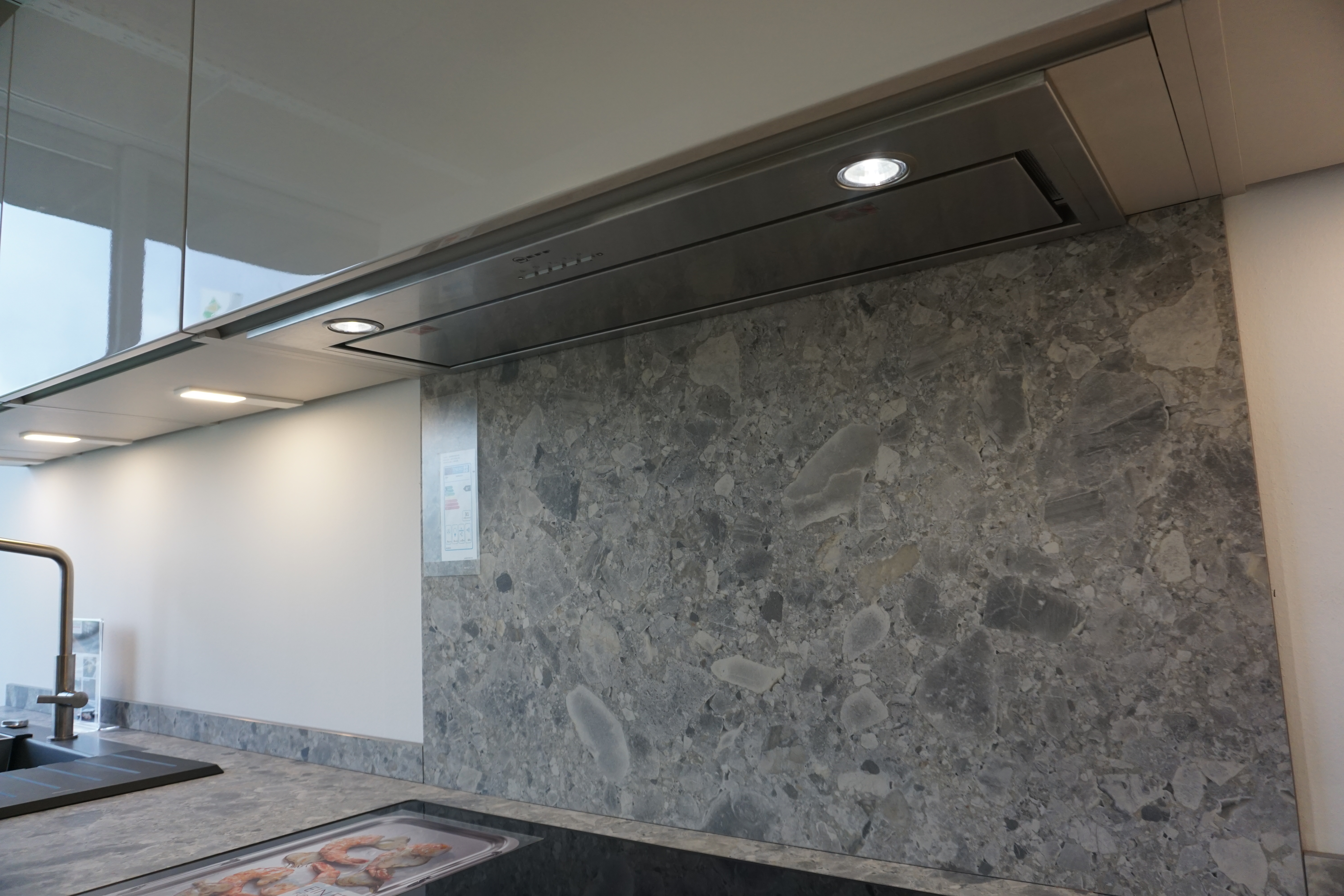 Hinter dem Kochfeld schützt eine Keramikrückwand vor Verschmutzung der Wand.