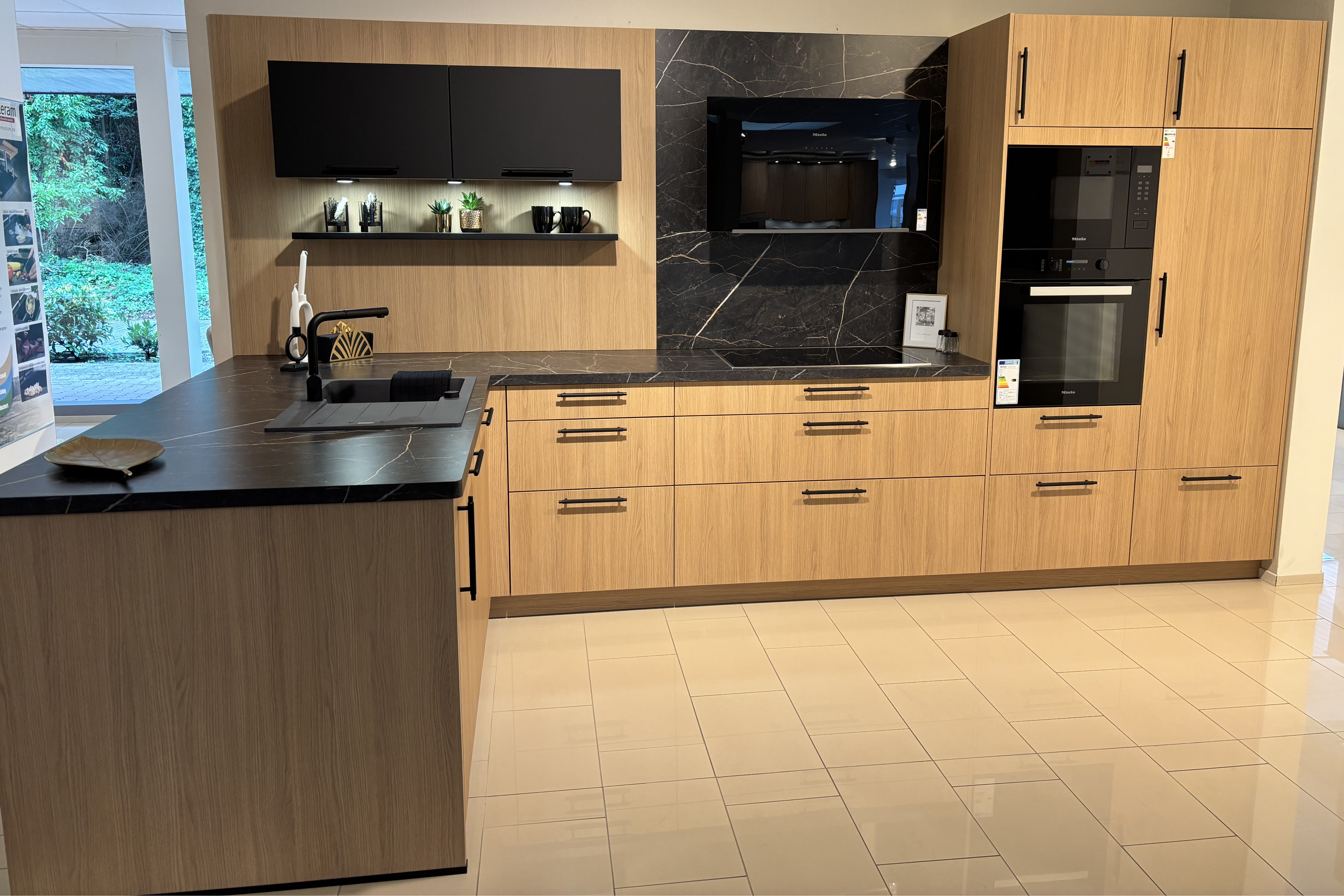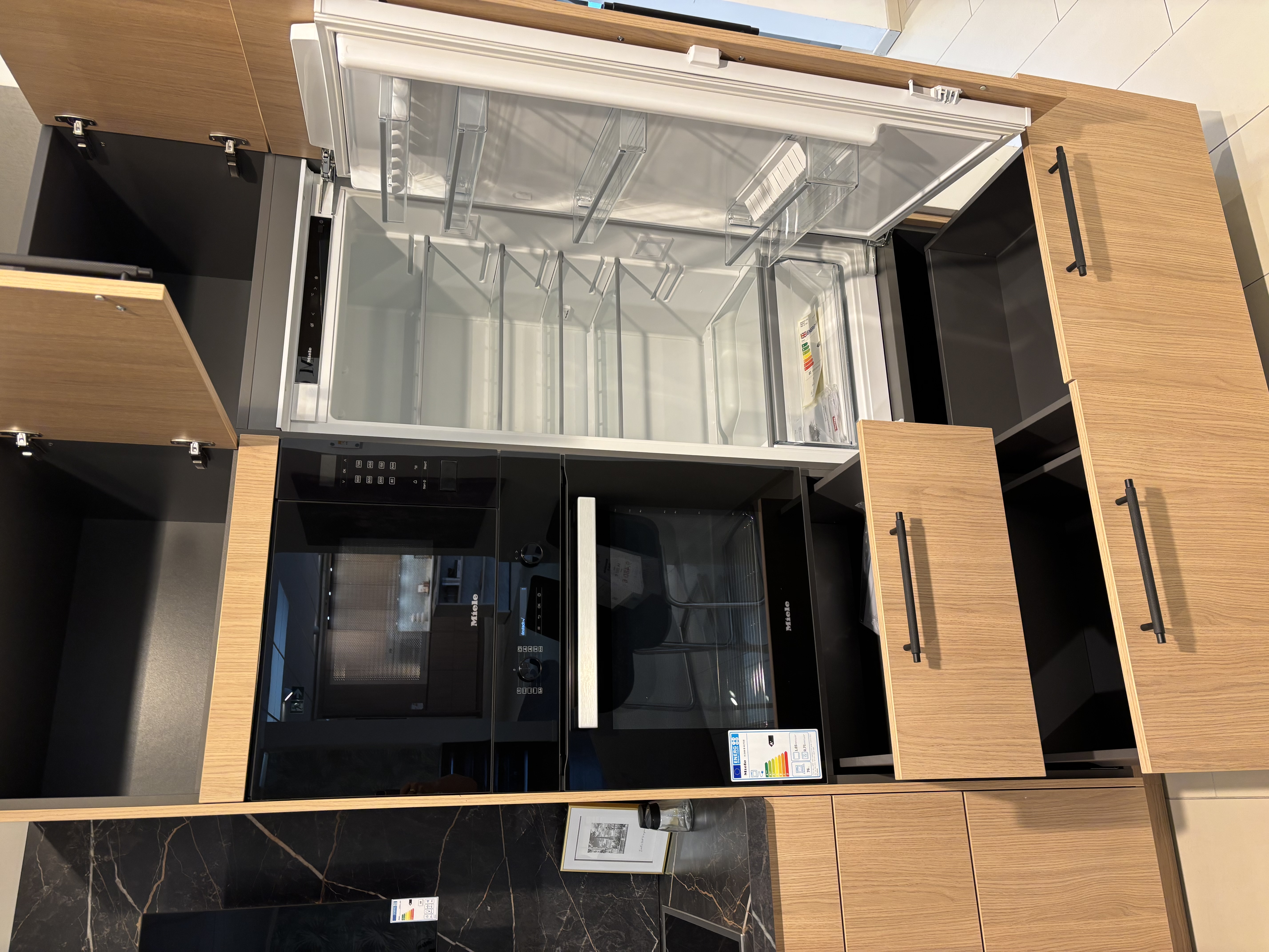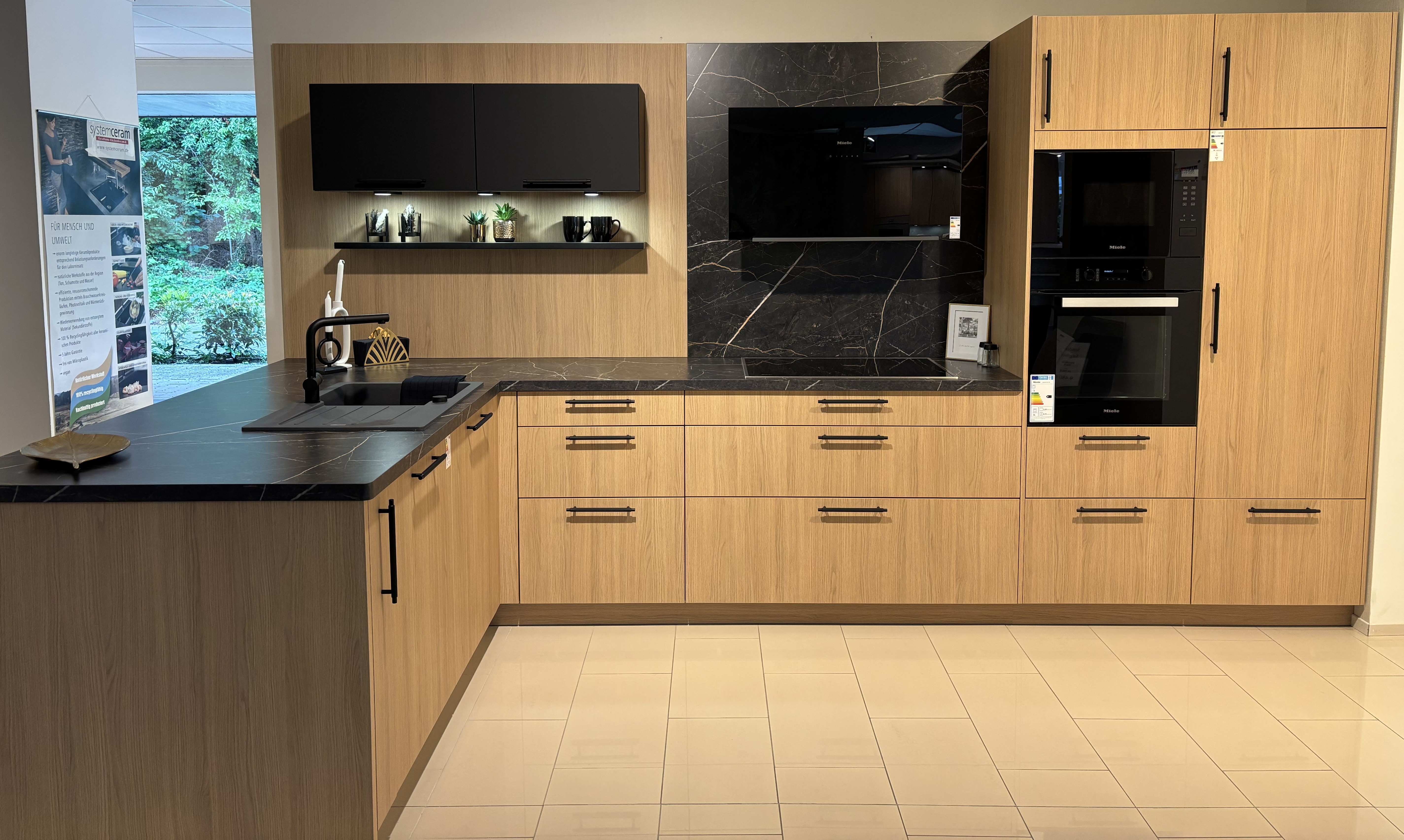 Diese moderne Einbauküche aus dem Häcker Systemat-Programm schafft durch das aktuelle Holzdekor in Feineiche Natur in Verbindung mit der marmorierten Arbeitsplatte und den schwarzen Akzenten einen zugleich modernen als auch gemütlichen Charakter. Die hochwertige Miele-Ausstattung lässt keine Wü...