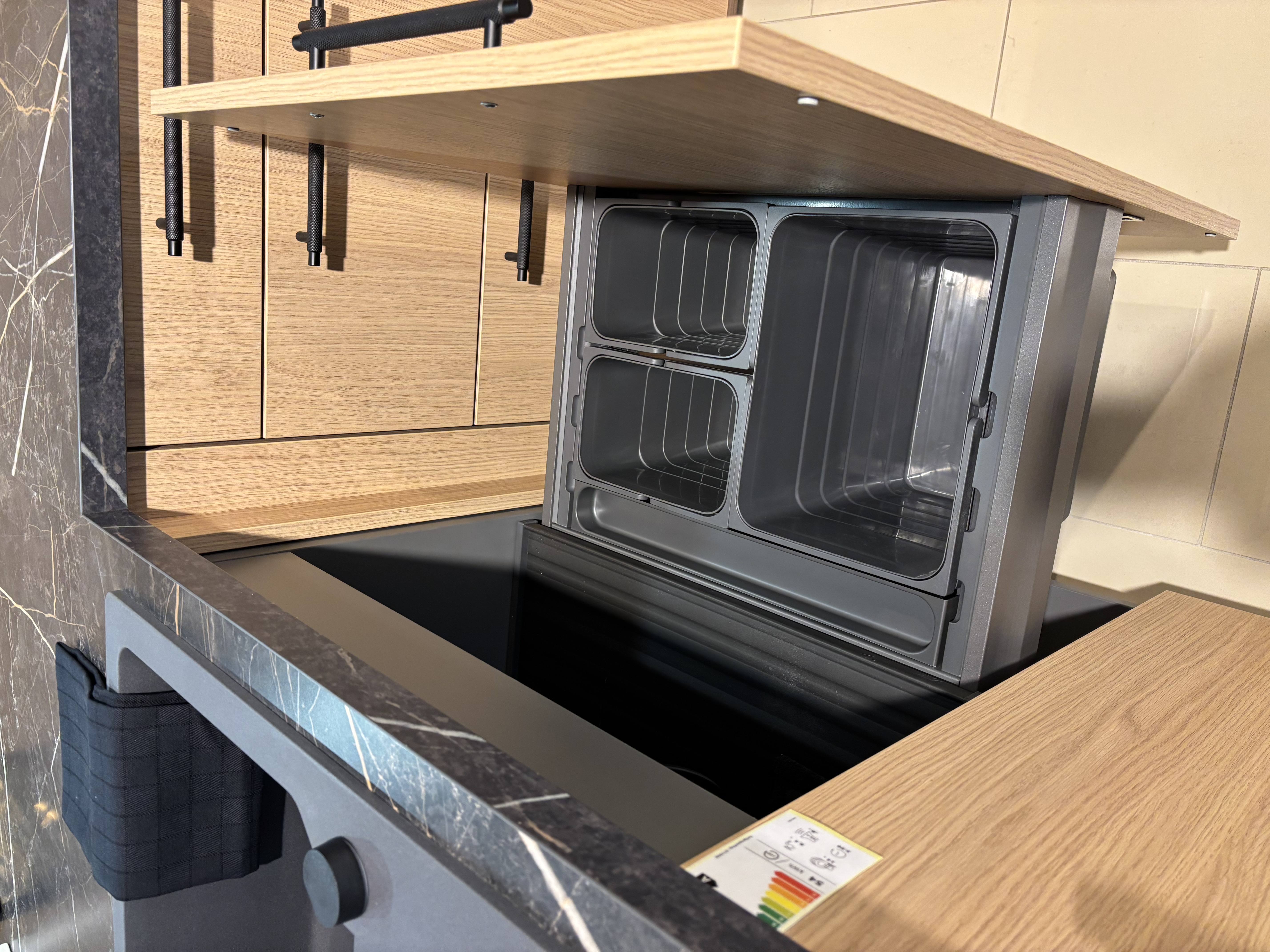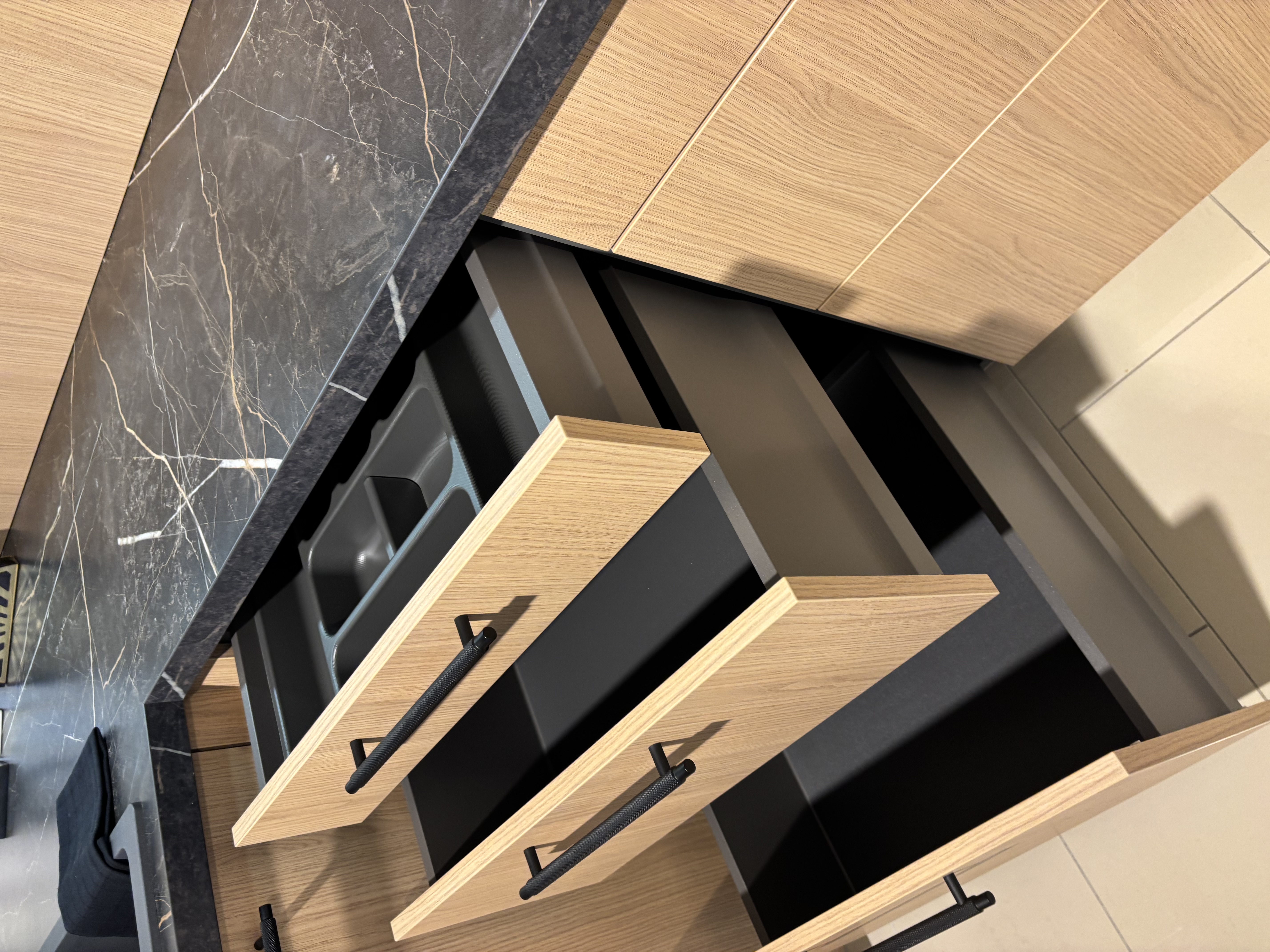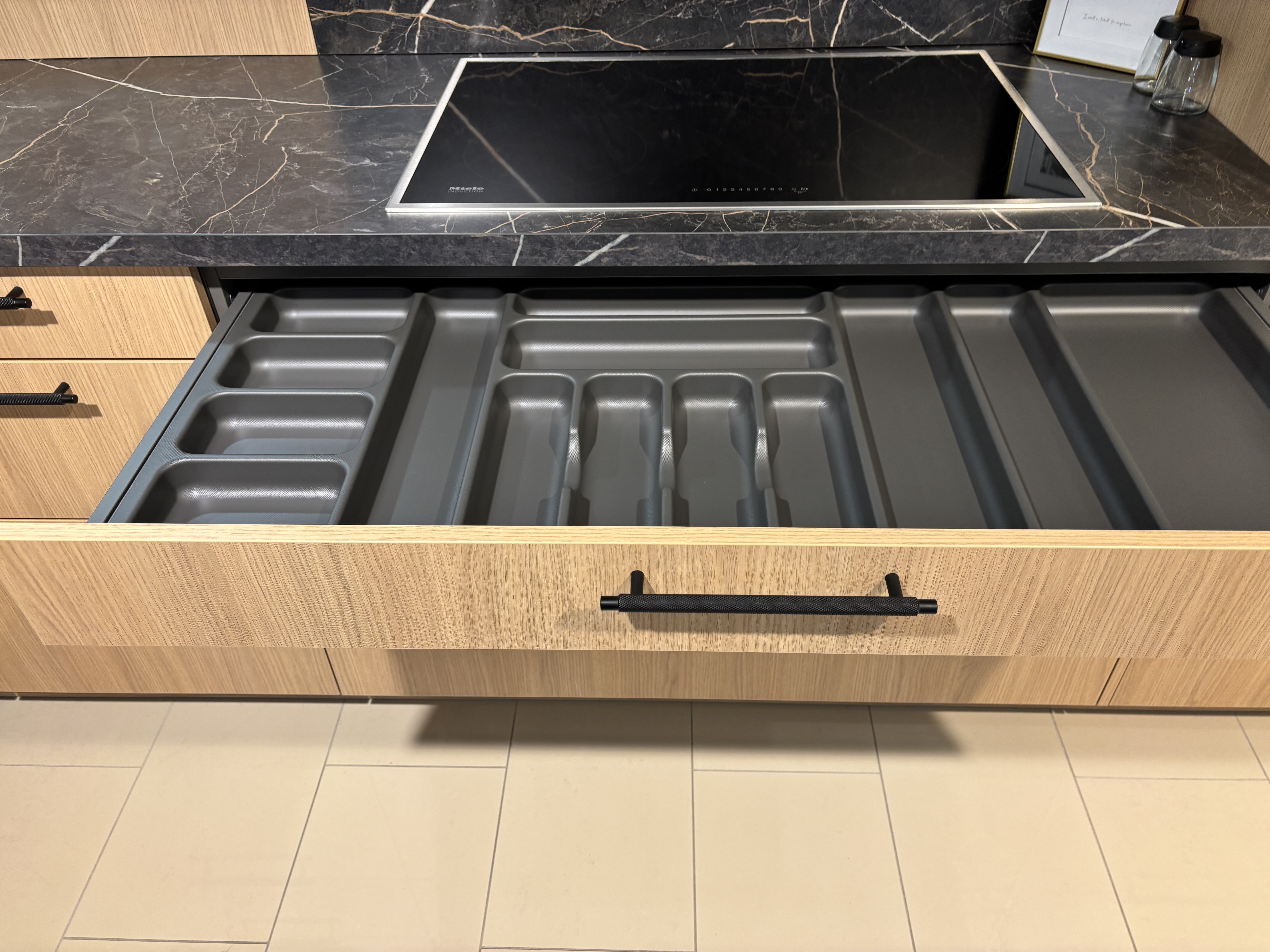 Die Auszüge mit ihrem Metro-Box System, Antirutschmatten & Besteckeinteilungen, der kleine Handtuchhalter und der Stauraum rückseitig der Insel bieten weiteren Komfort.