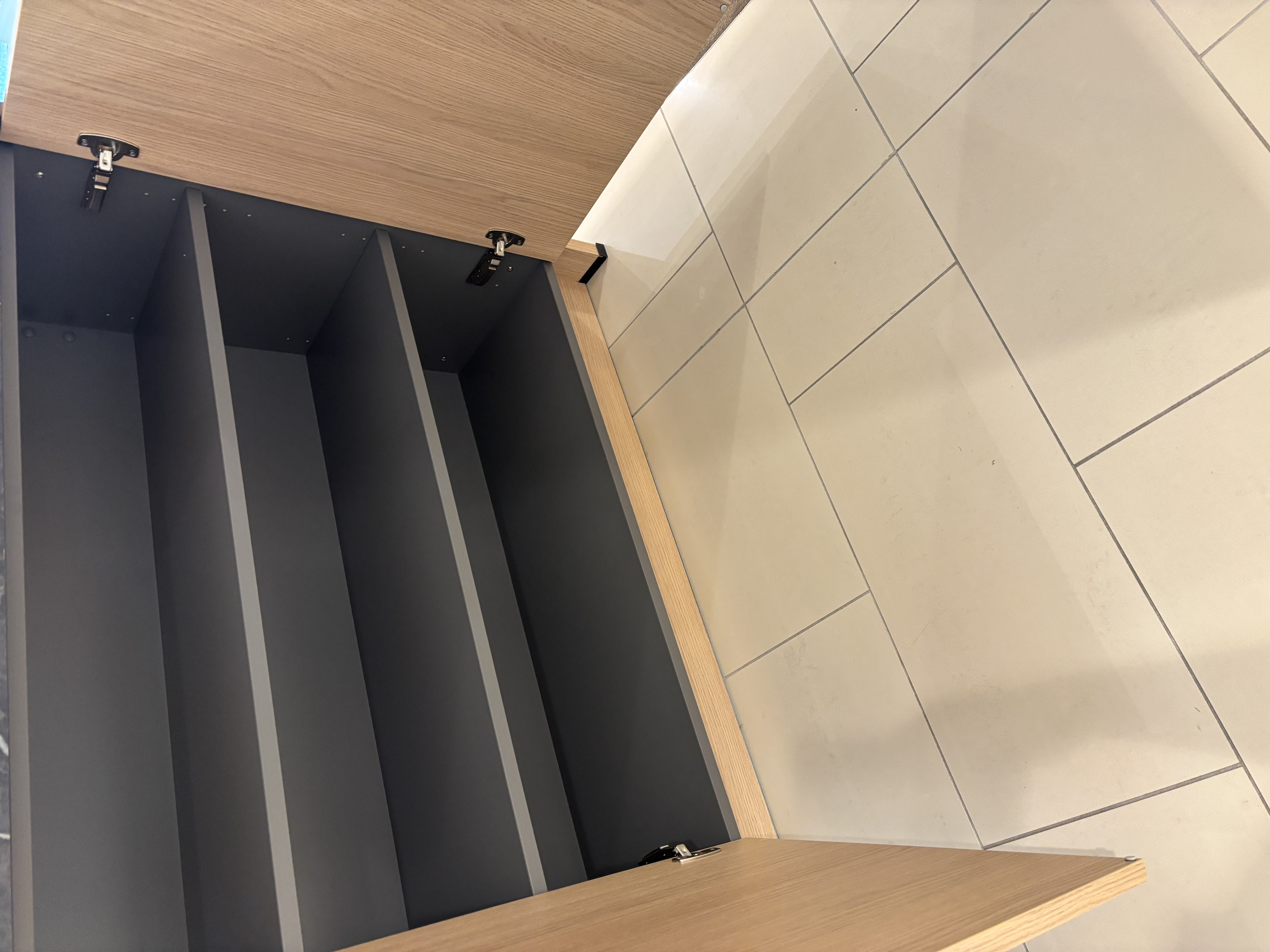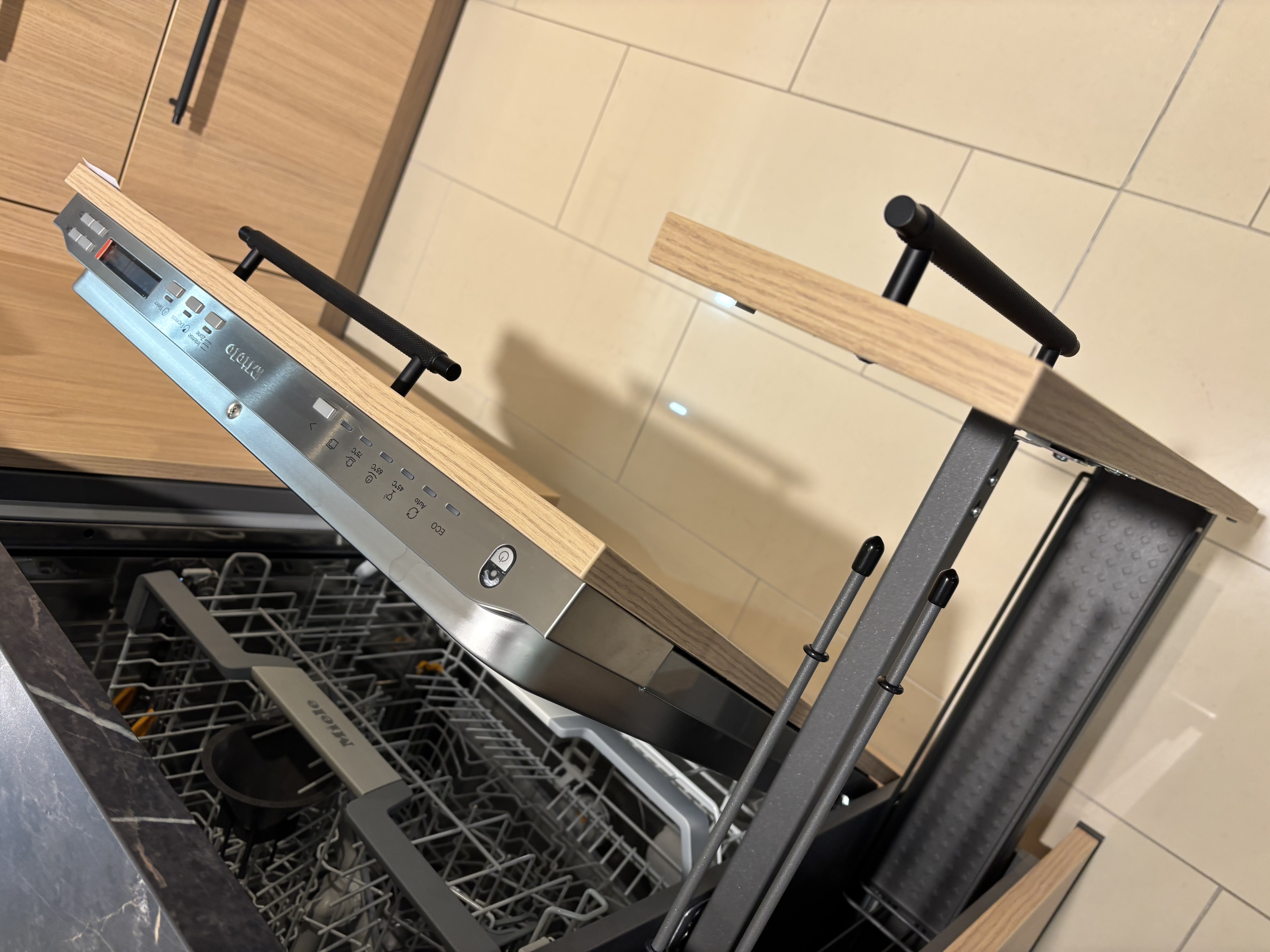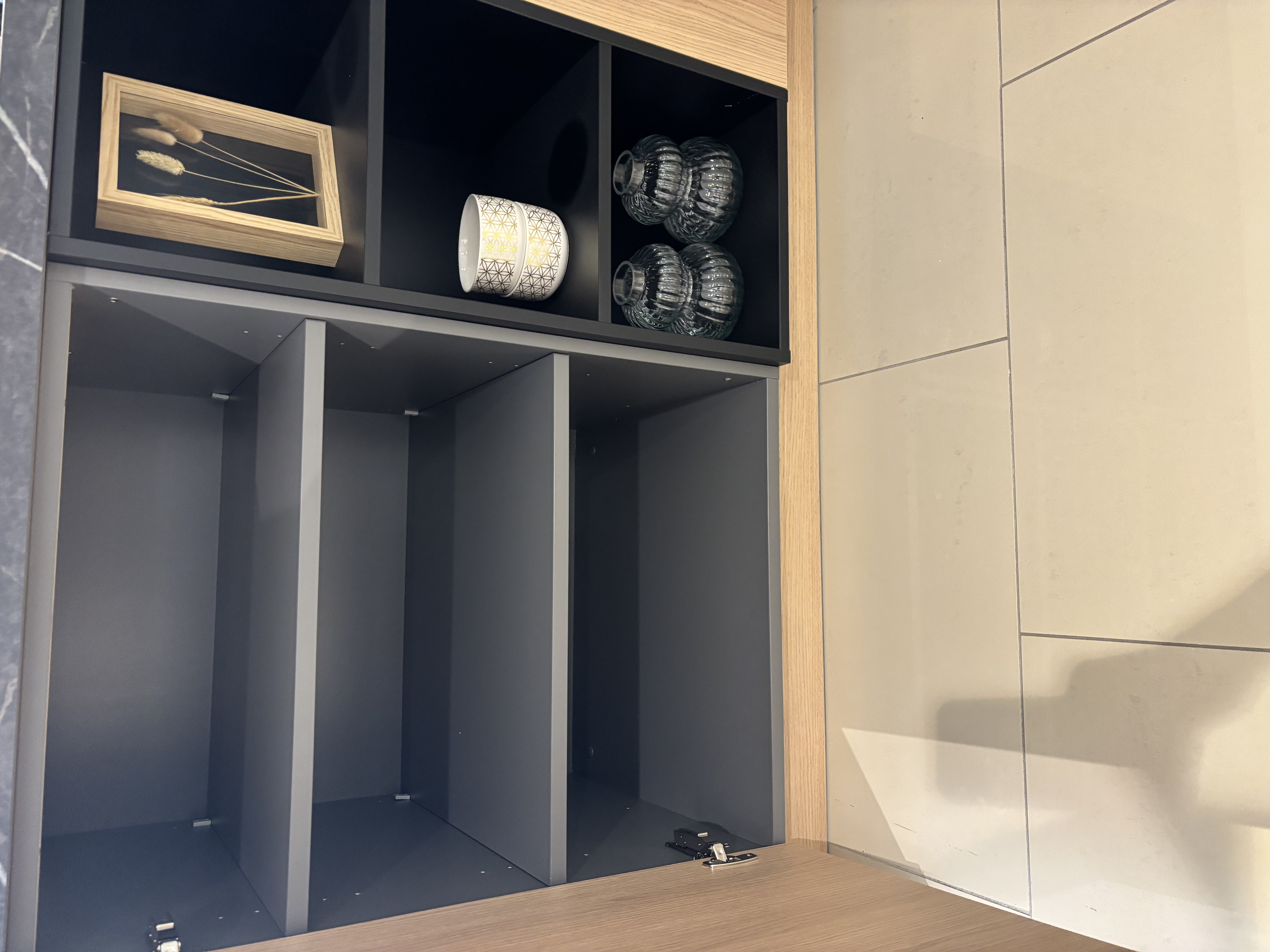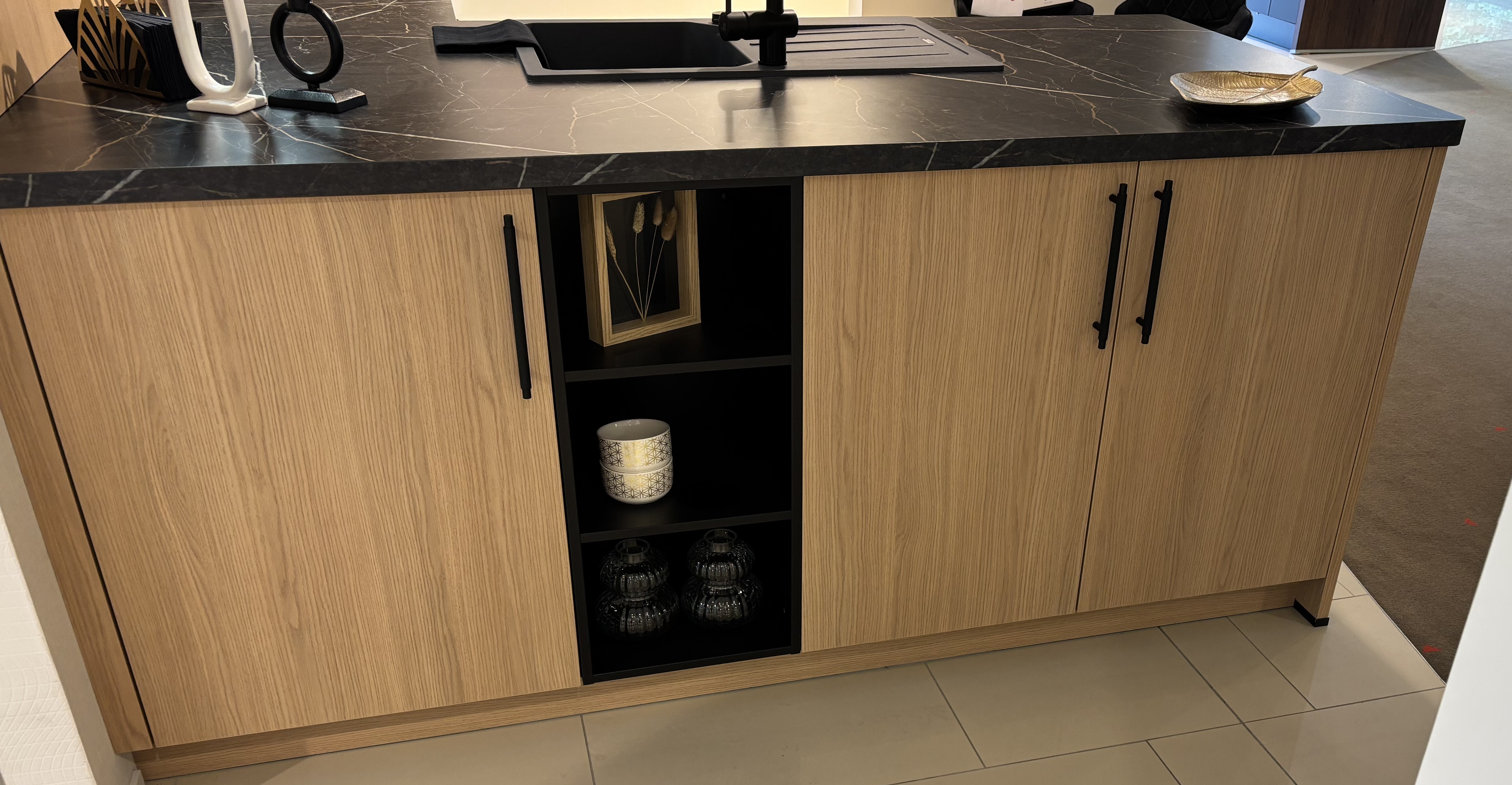 Die Auszüge mit ihrem Metro-Box System, Antirutschmatten & Besteckeinteilungen, der kleine Handtuchhalter und der Stauraum rückseitig der Insel bieten weiteren Komfort.