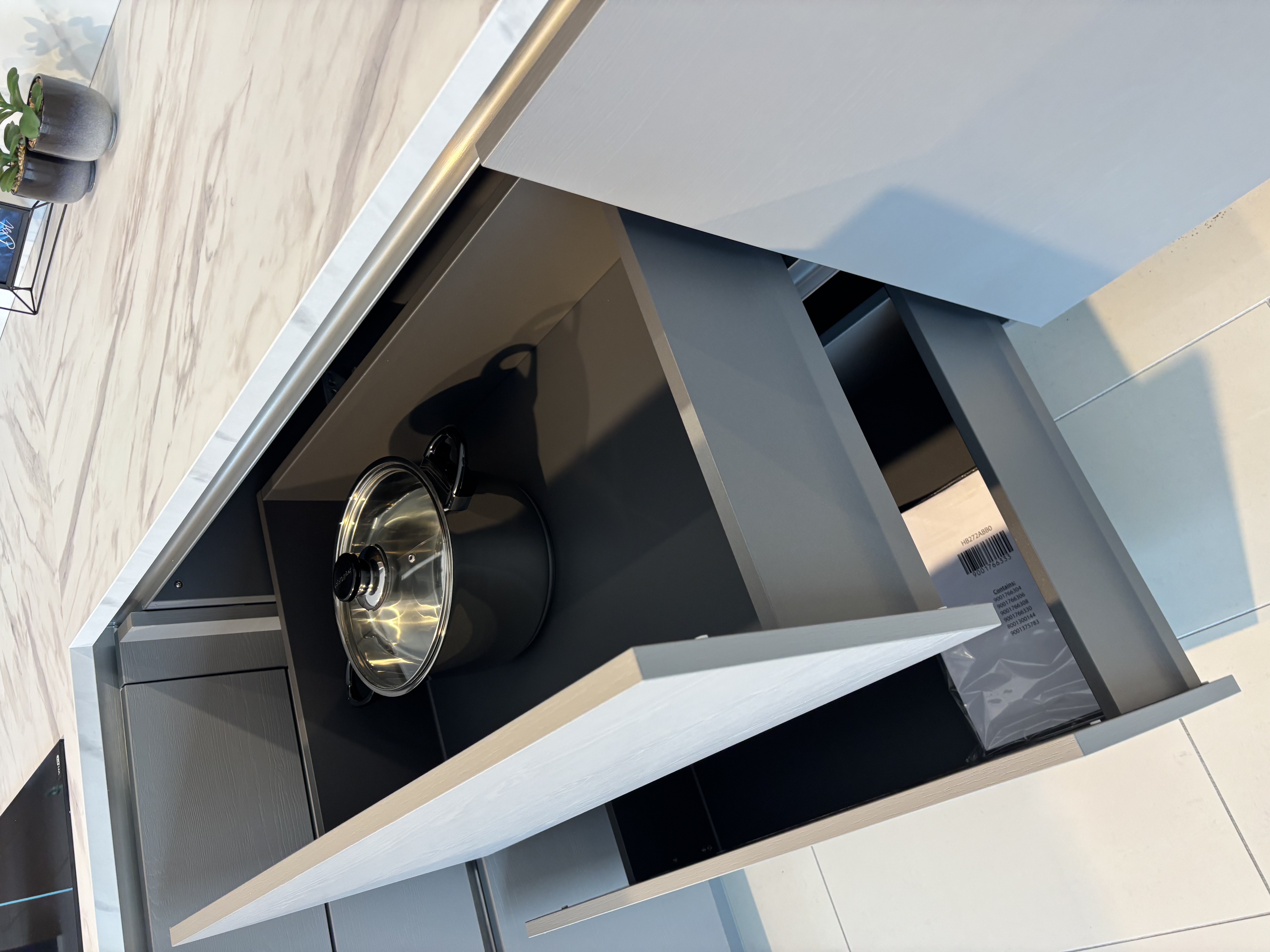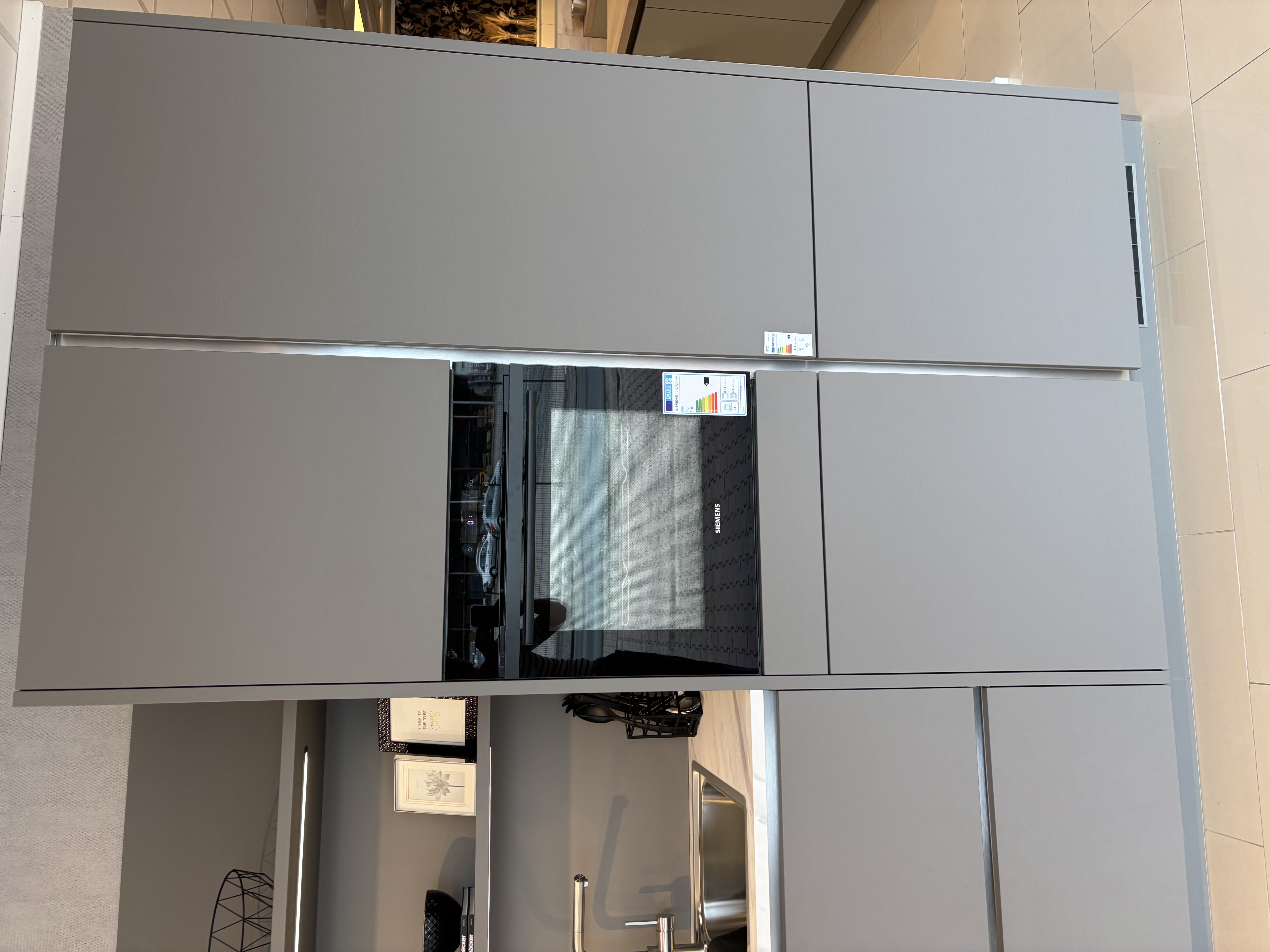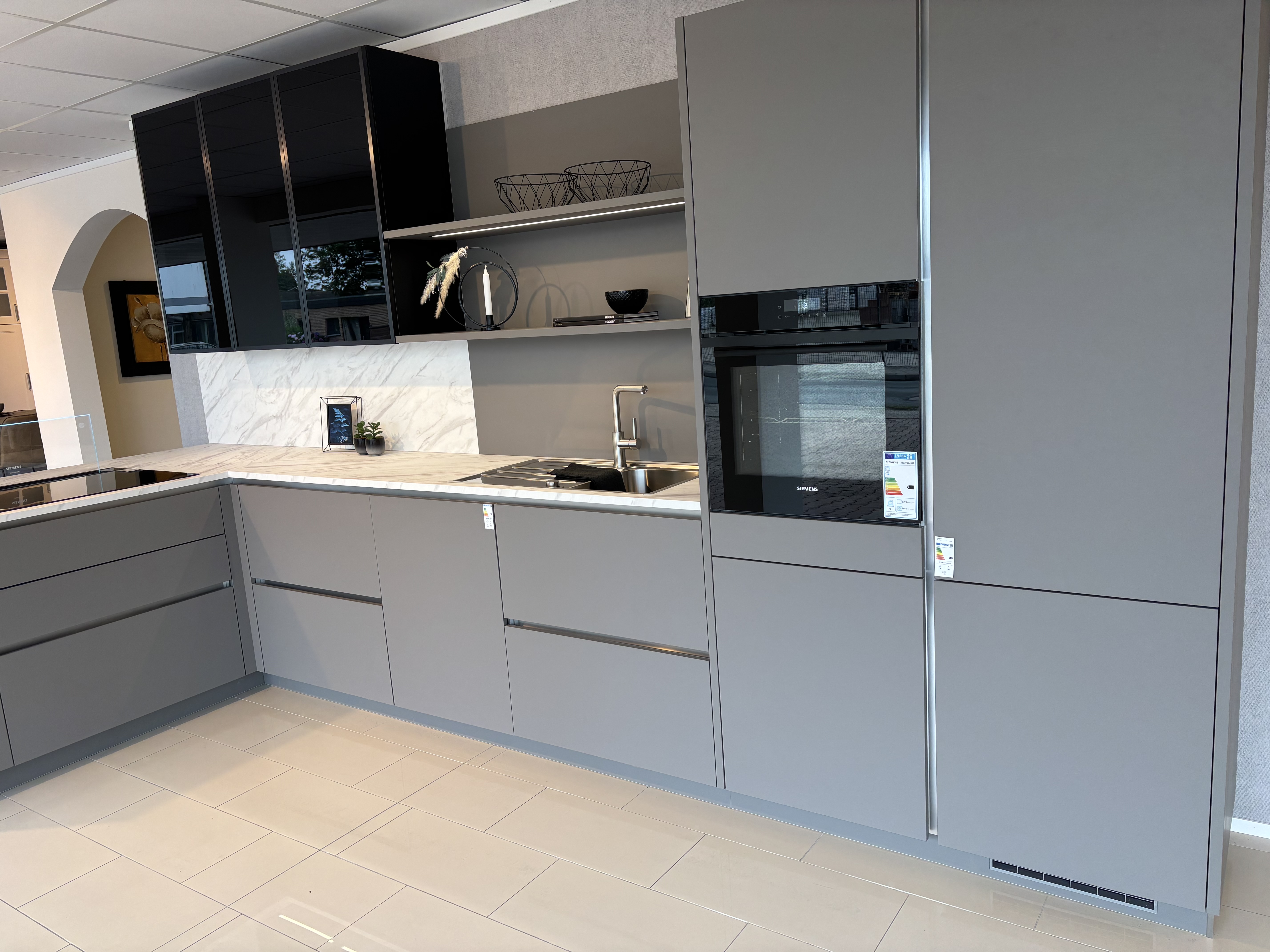 Die Küche in Mattlack Samteiche Greige hat durch ihre marmorierte Arbeitsplatte und Rückwandverkleidung in PerfectSense, den hohen Wandschränken mit Metallrahmen und Schwarzglas und der linearen,
