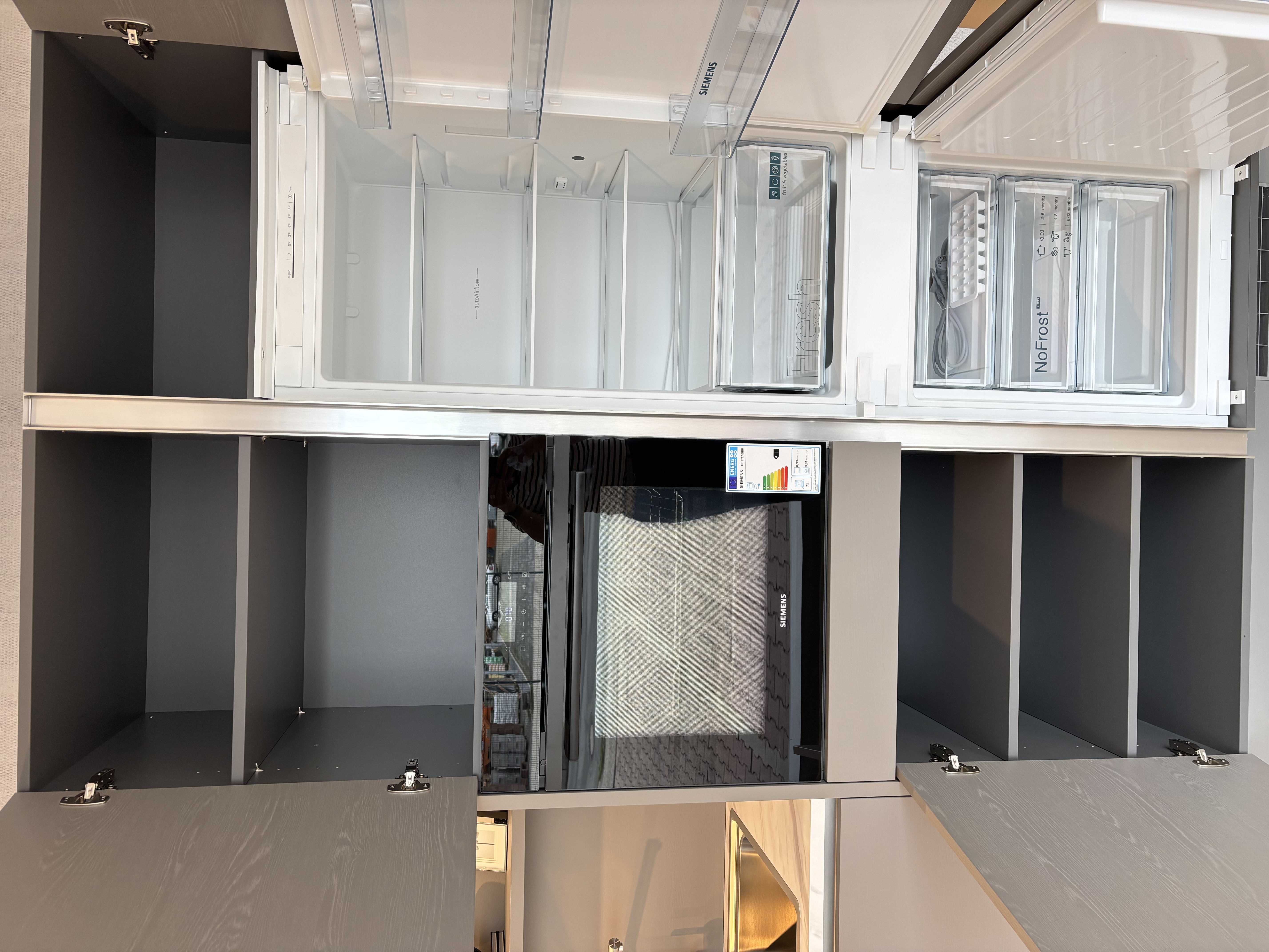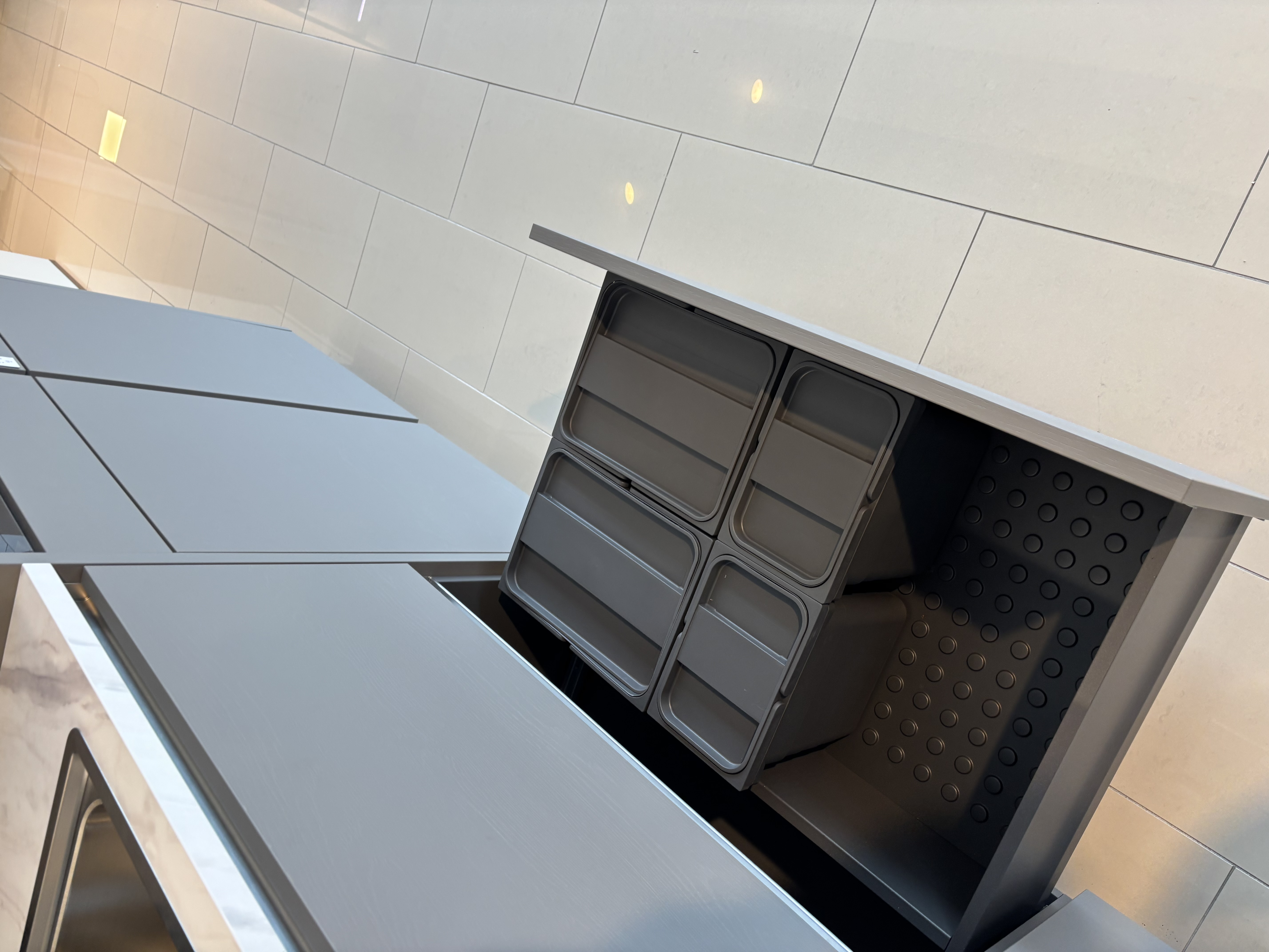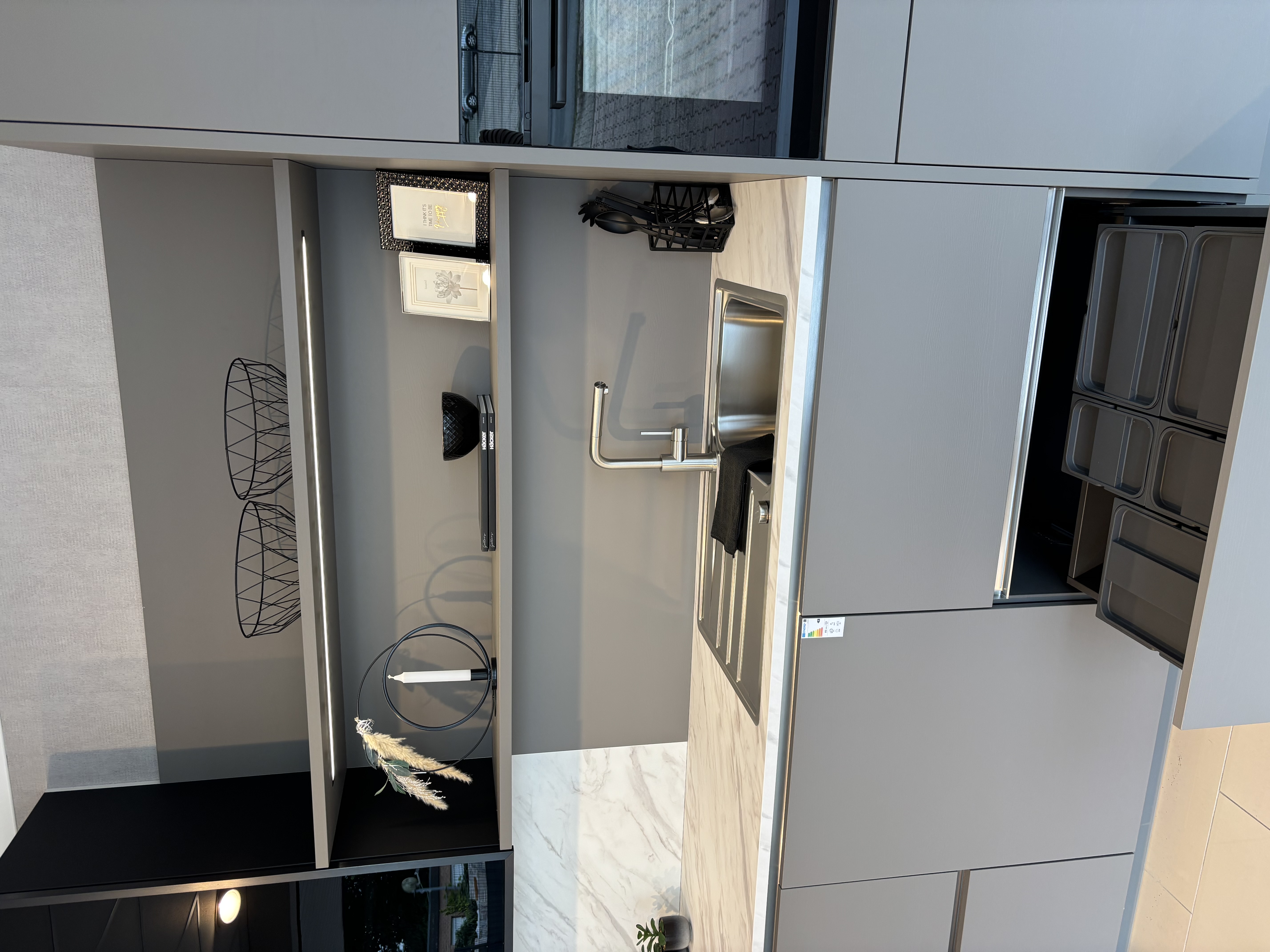 Die Küche in Mattlack Samteiche Greige hat durch ihre marmorierte Arbeitsplatte und Rückwandverkleidung in PerfectSense, den hohen Wandschränken mit Metallrahmen und Schwarzglas und der linearen,