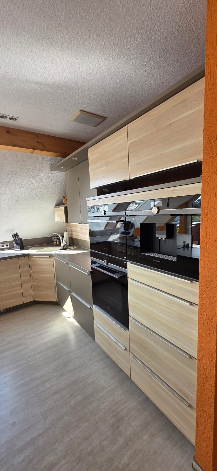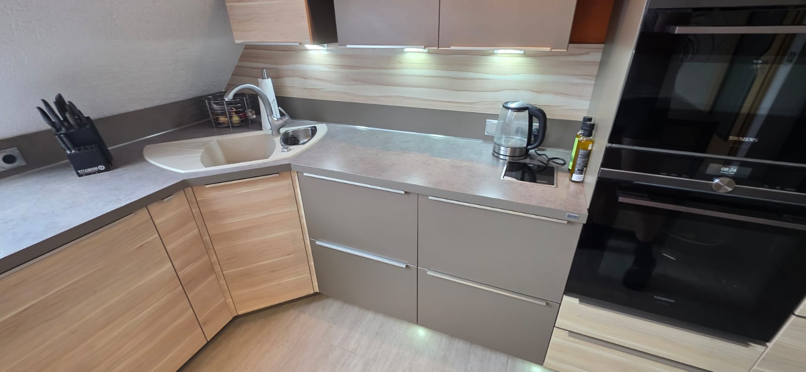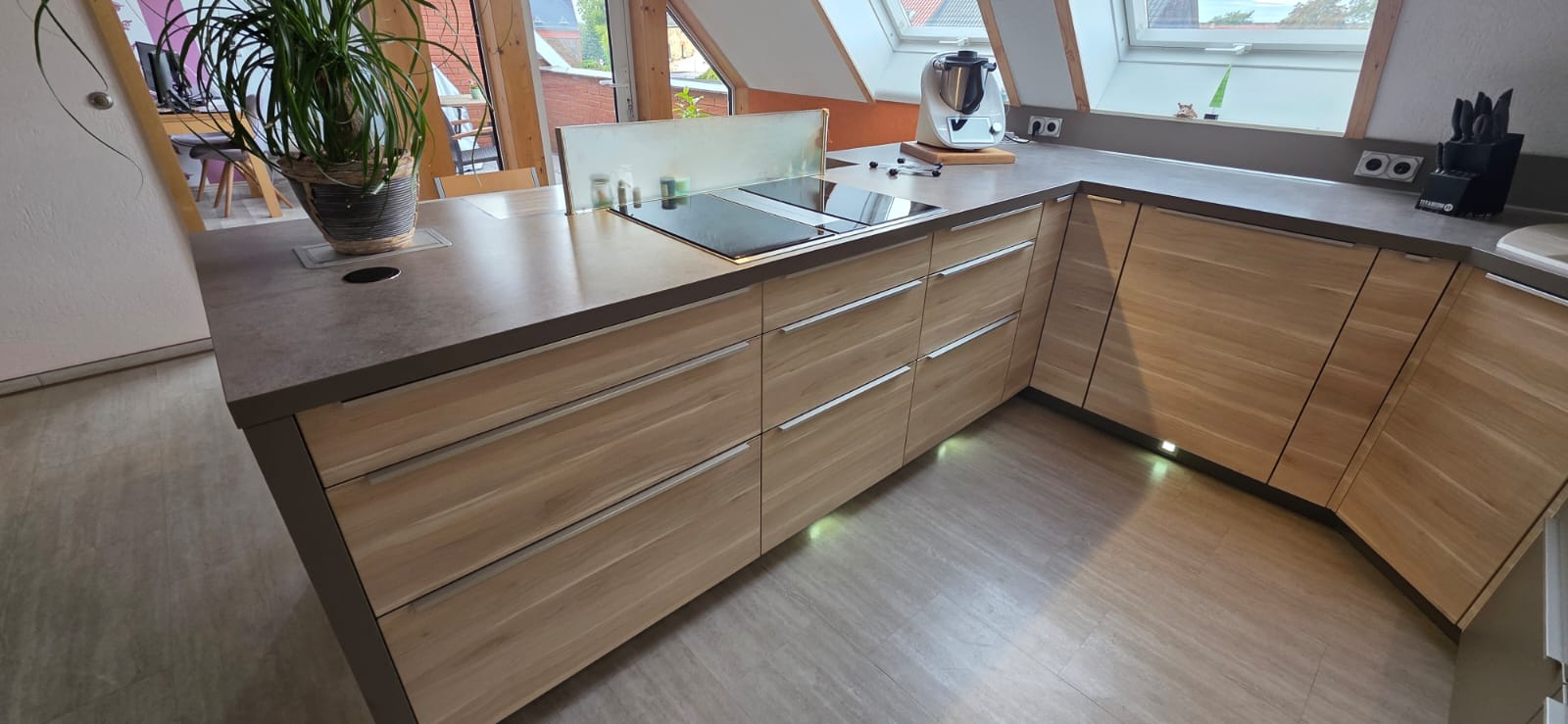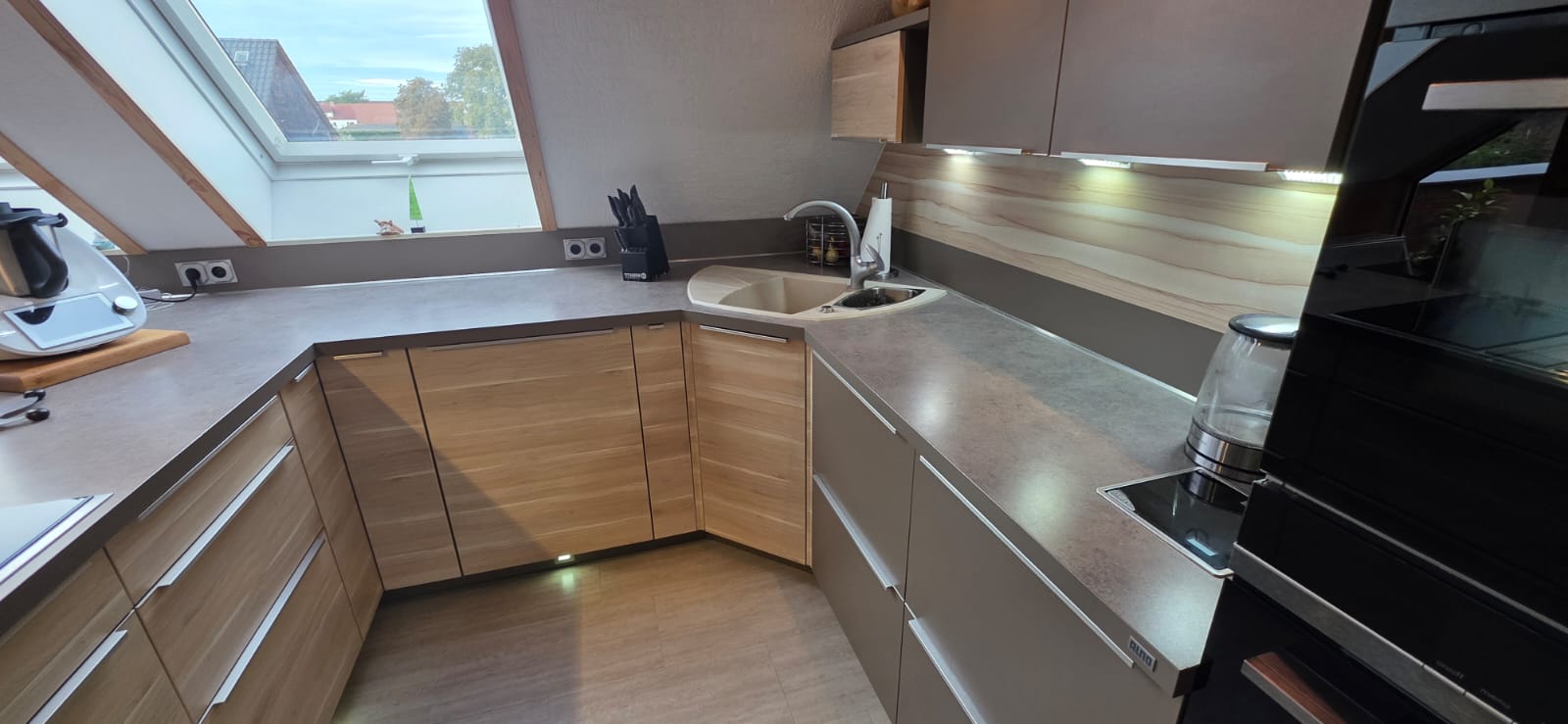Hochwertige Einbauküche Alnoplan in Sandahorn abgesetzt in Beigegrau als Vorführküche im Abverkauf.