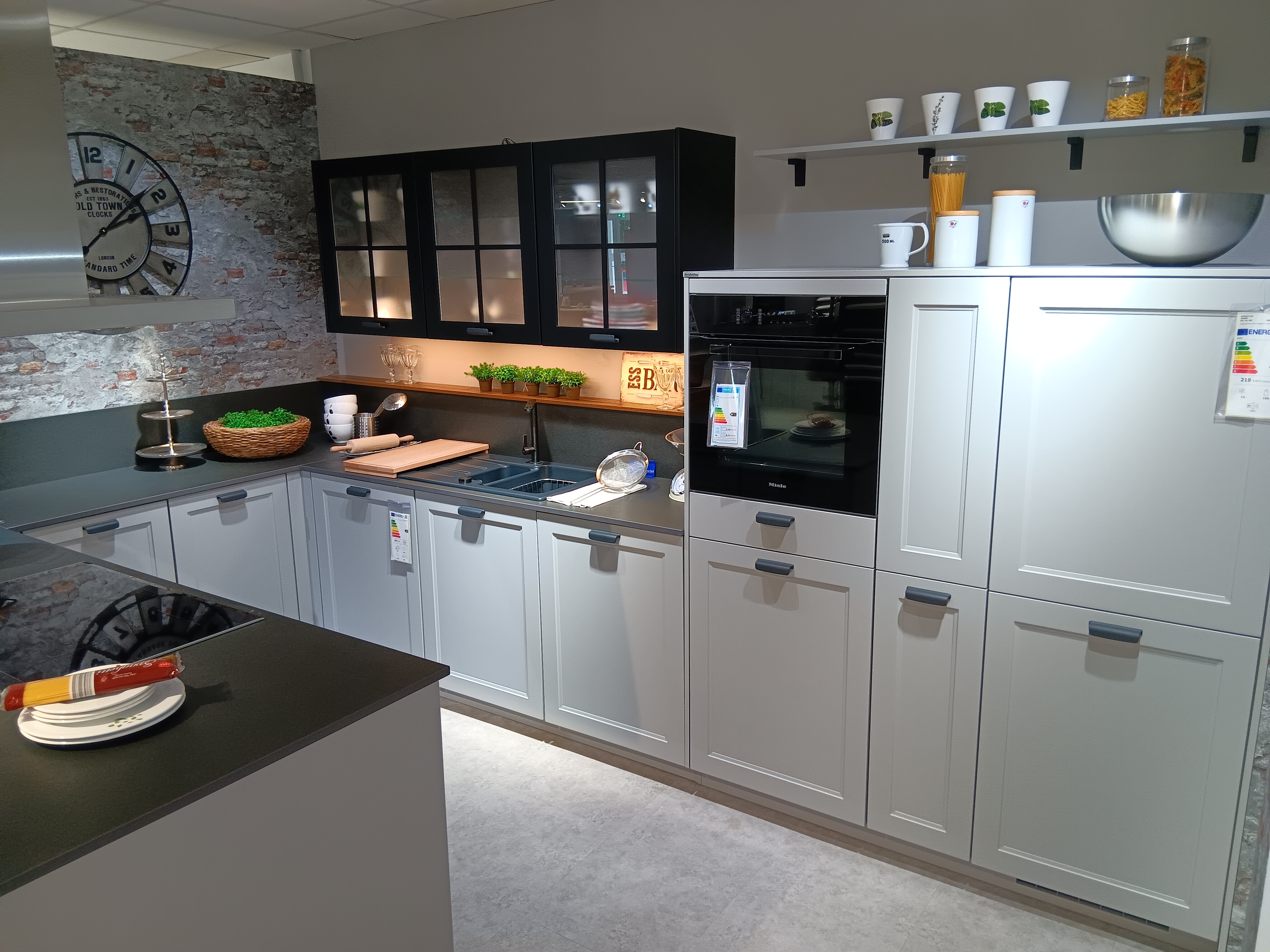 Elegante Landhausküche aus dem Hause Nobilia, inklusive Bosch & Miele Einbaugeräten, sowie einer hochwertigen Villeroy & Boch Keramik Spüle.