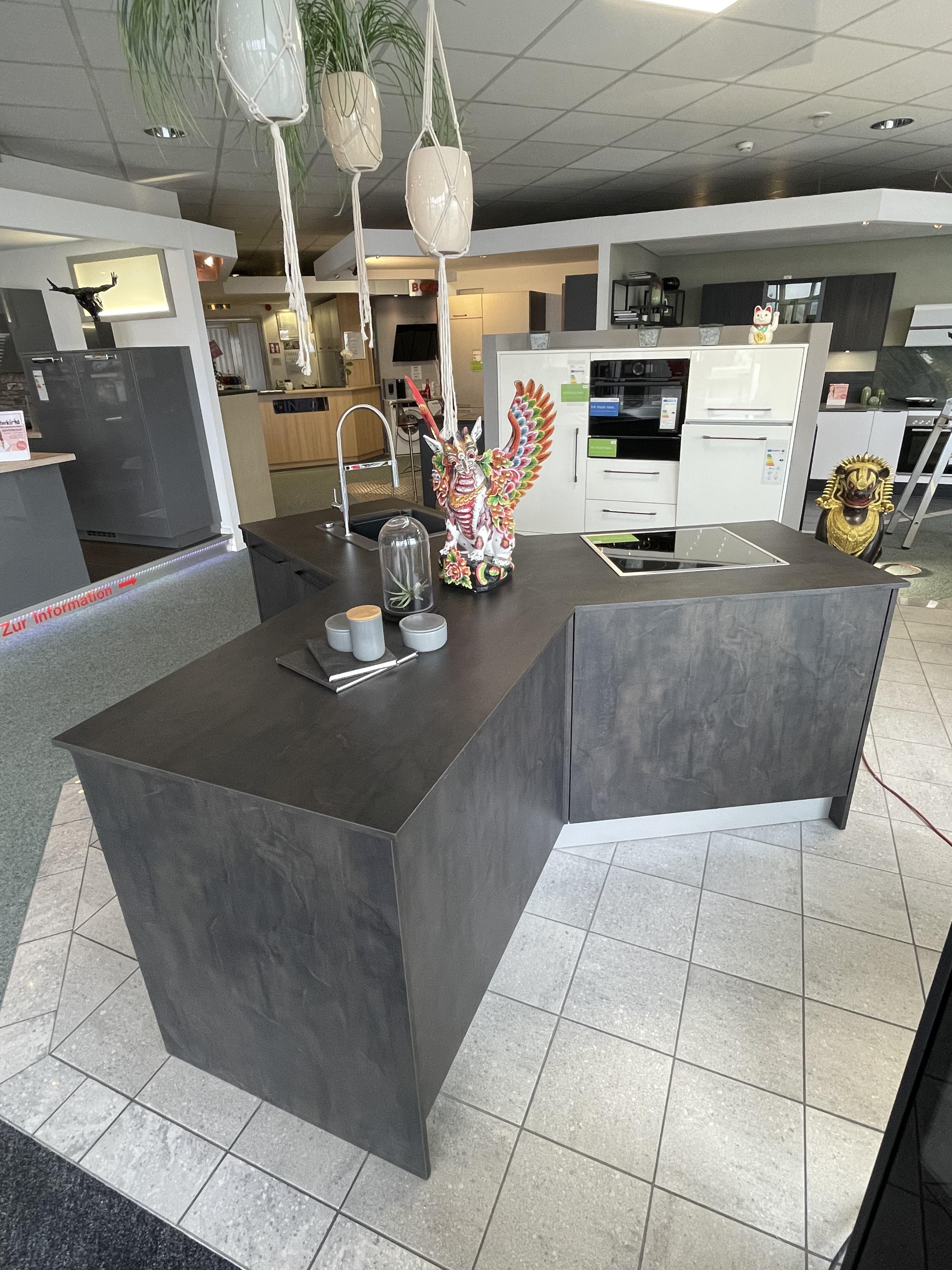 Diese moderne Küche im zweifarbigen Kontrast besticht durch die einzigartige Insellösung. Hier kann von 6 Seiten gearbeitet werden. Die Insel, in dunklem Grau und gifflos gehalten, steht im Kontrast zur weißen Highboard-Seite mit Griffen. Hier sind die höhergesetzte Spülmaschine, der Kühlschra...