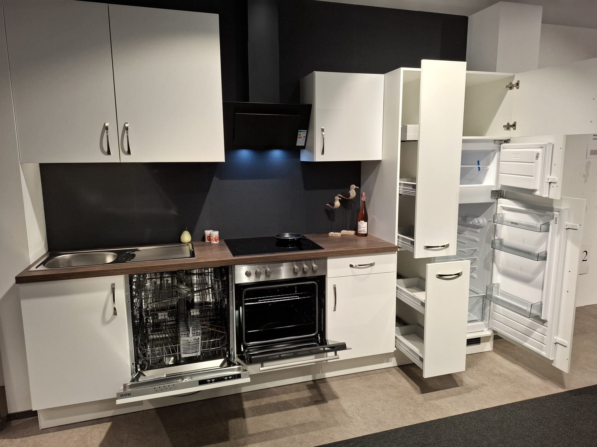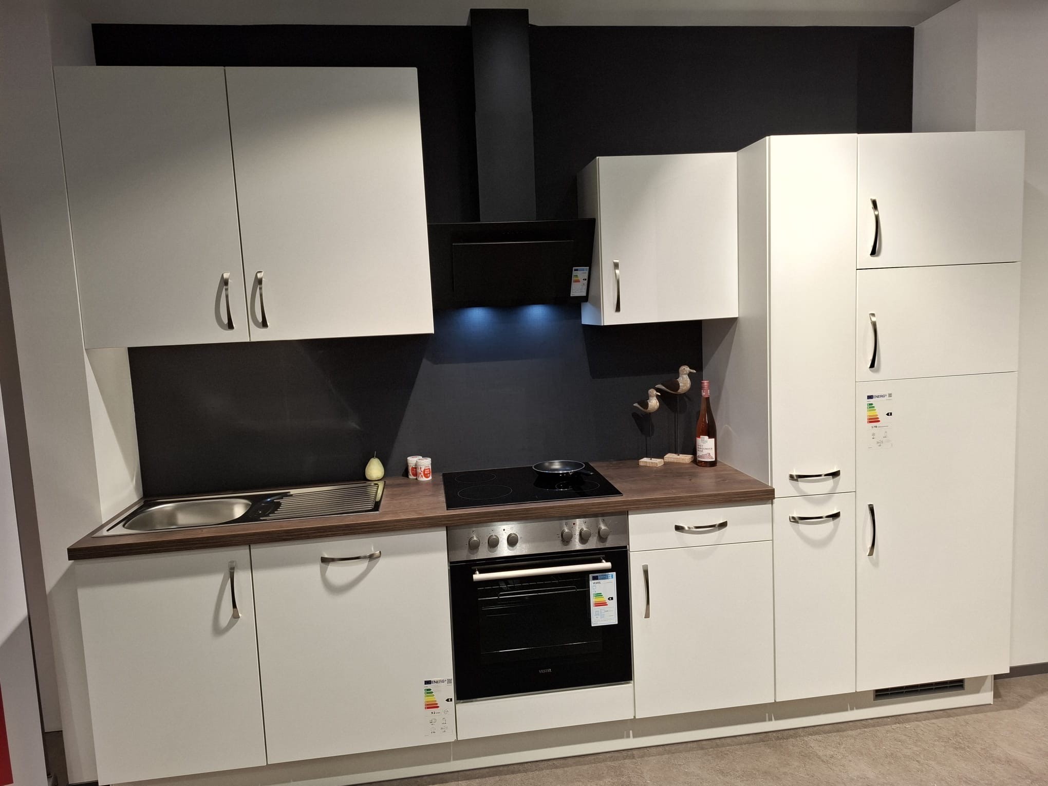 Küchenzeile mit Backofen, Kochfeld, Dunstabzug "kopffrei", Kühl/Gefrierkombi und Spülmaschine