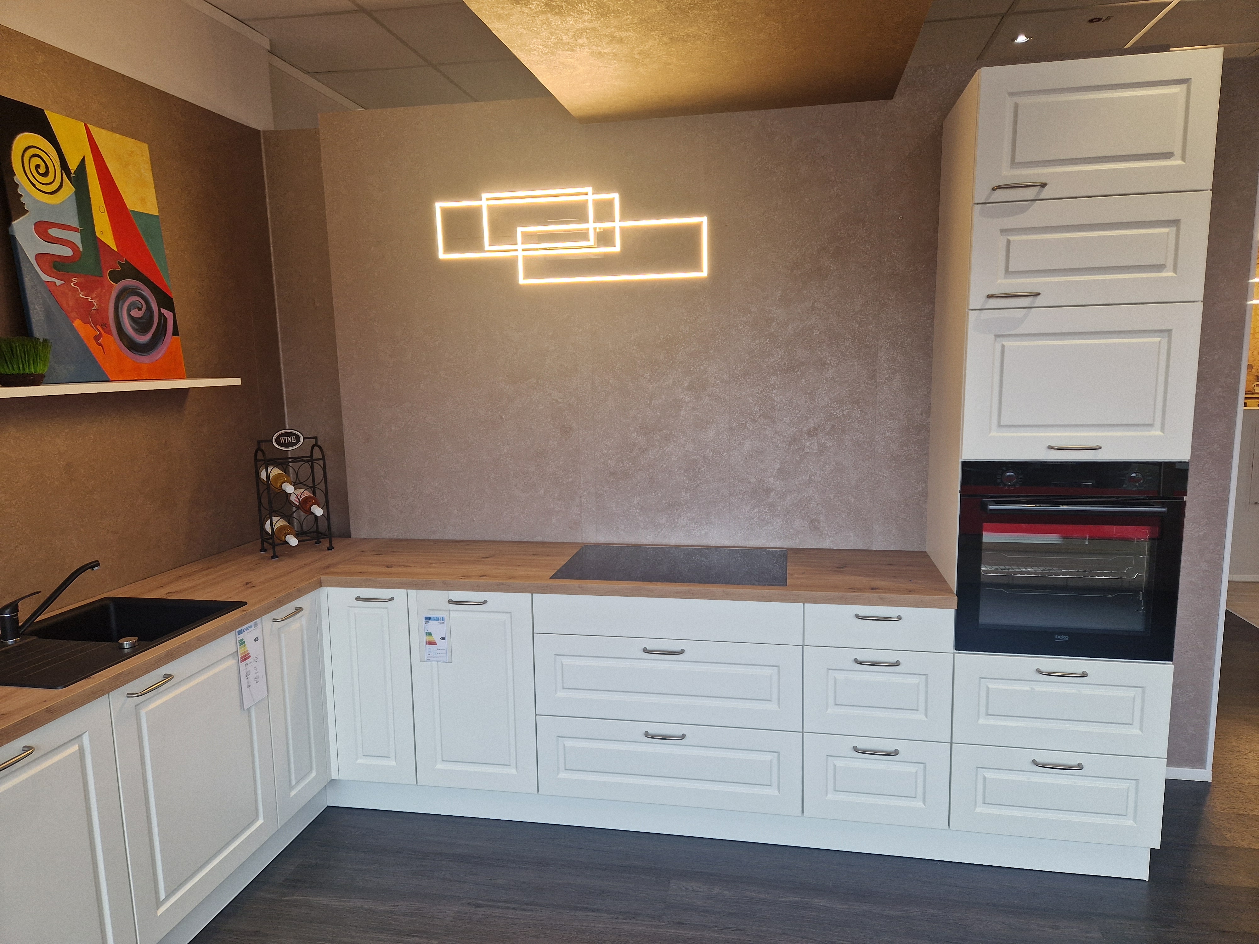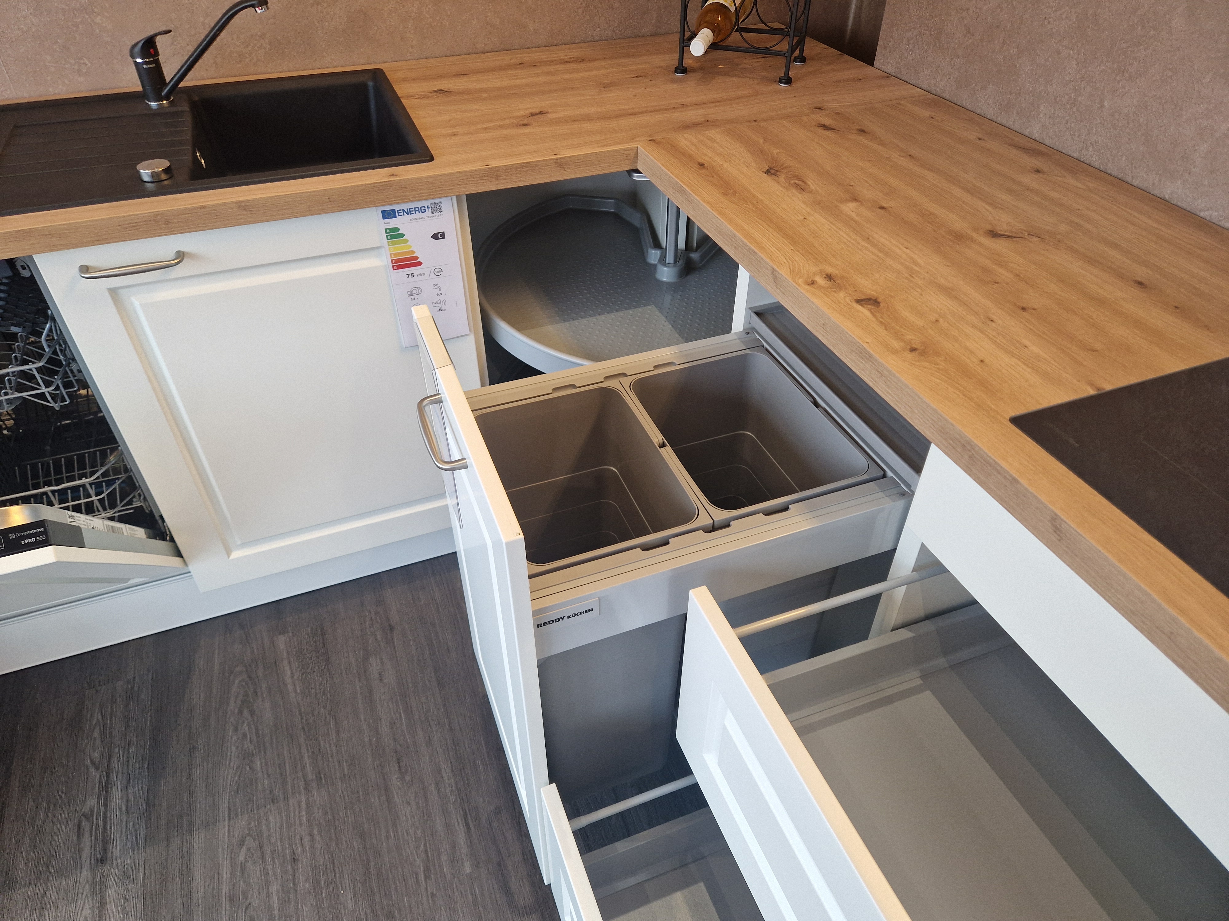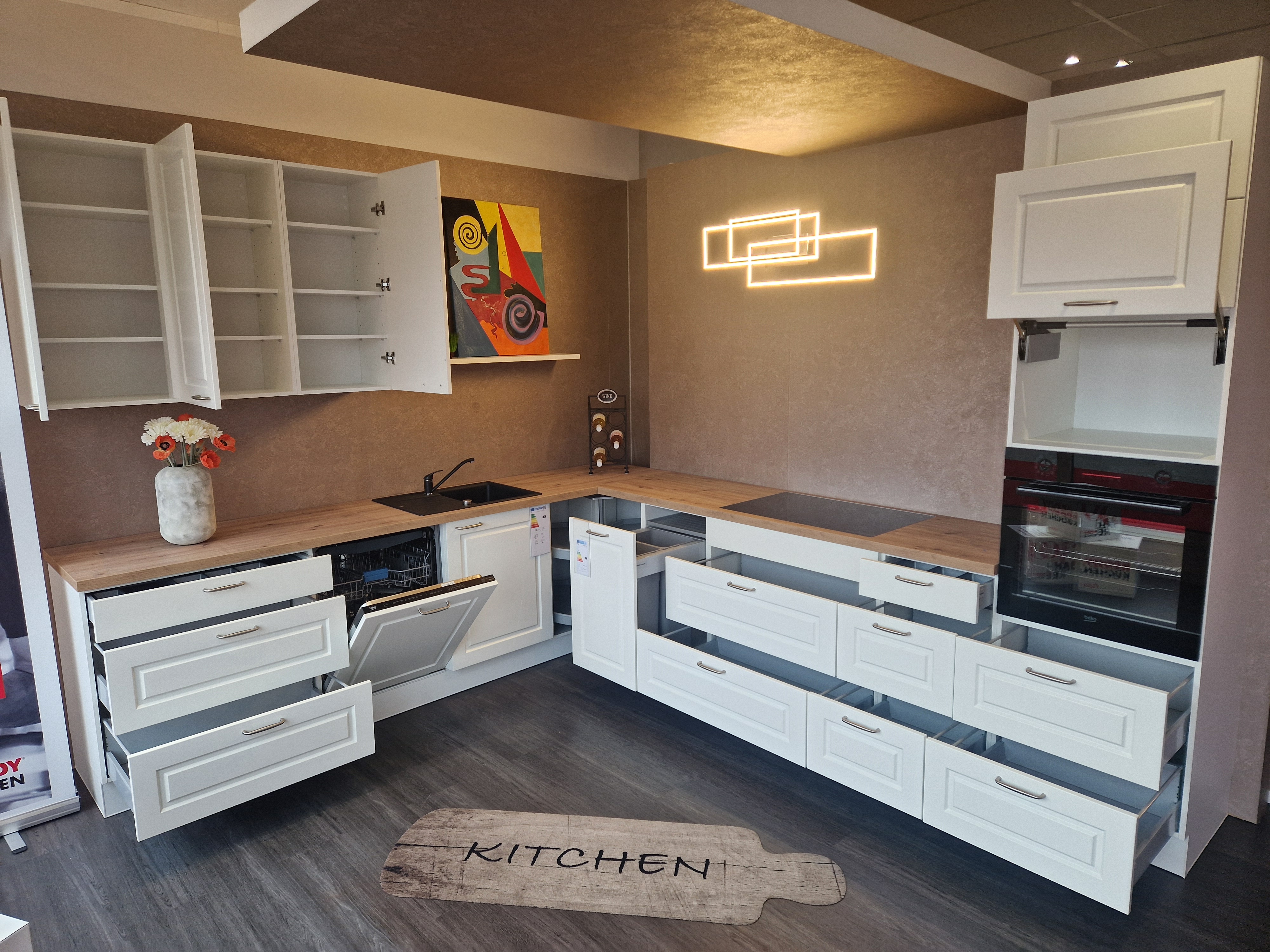 Landhausküche weiß Seidenmatt Lack, mit sehr viel Stauraum, flächenbündigem Kochfeld, separatem großem Mülltrennsystem, Sil-Granit Spüle + Armatur, Mikrowellenlifttür, viele Auszüge, vollintegriertem Geschirrspüler mit Besteckschublade, hohe Hängeschränke, Küche ist erweiterungsfähig