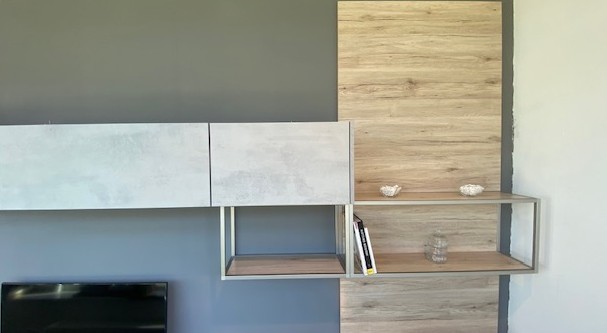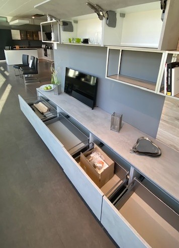 In Beton grau Nachbildung, grifflos mit offenen Regalen.