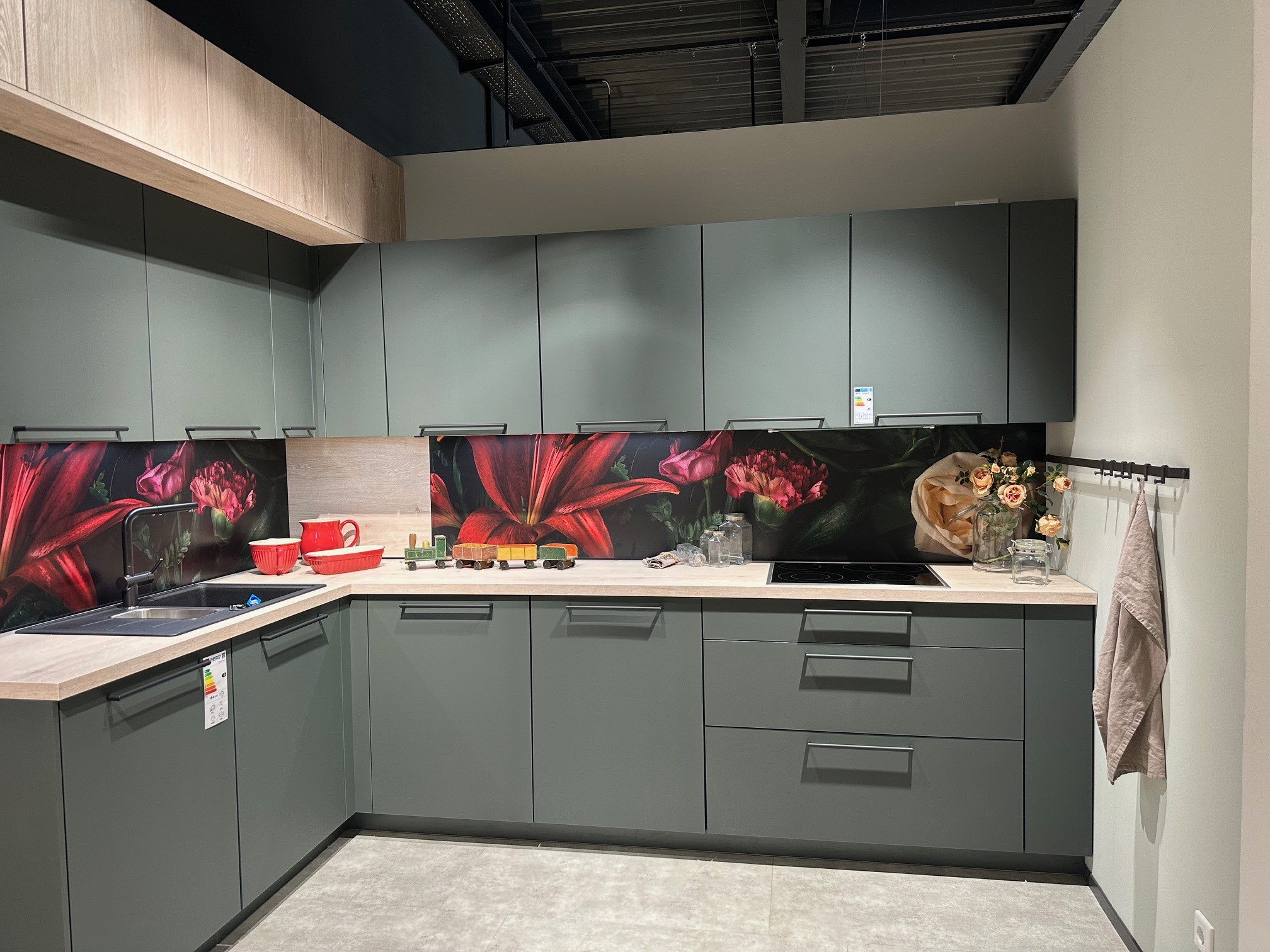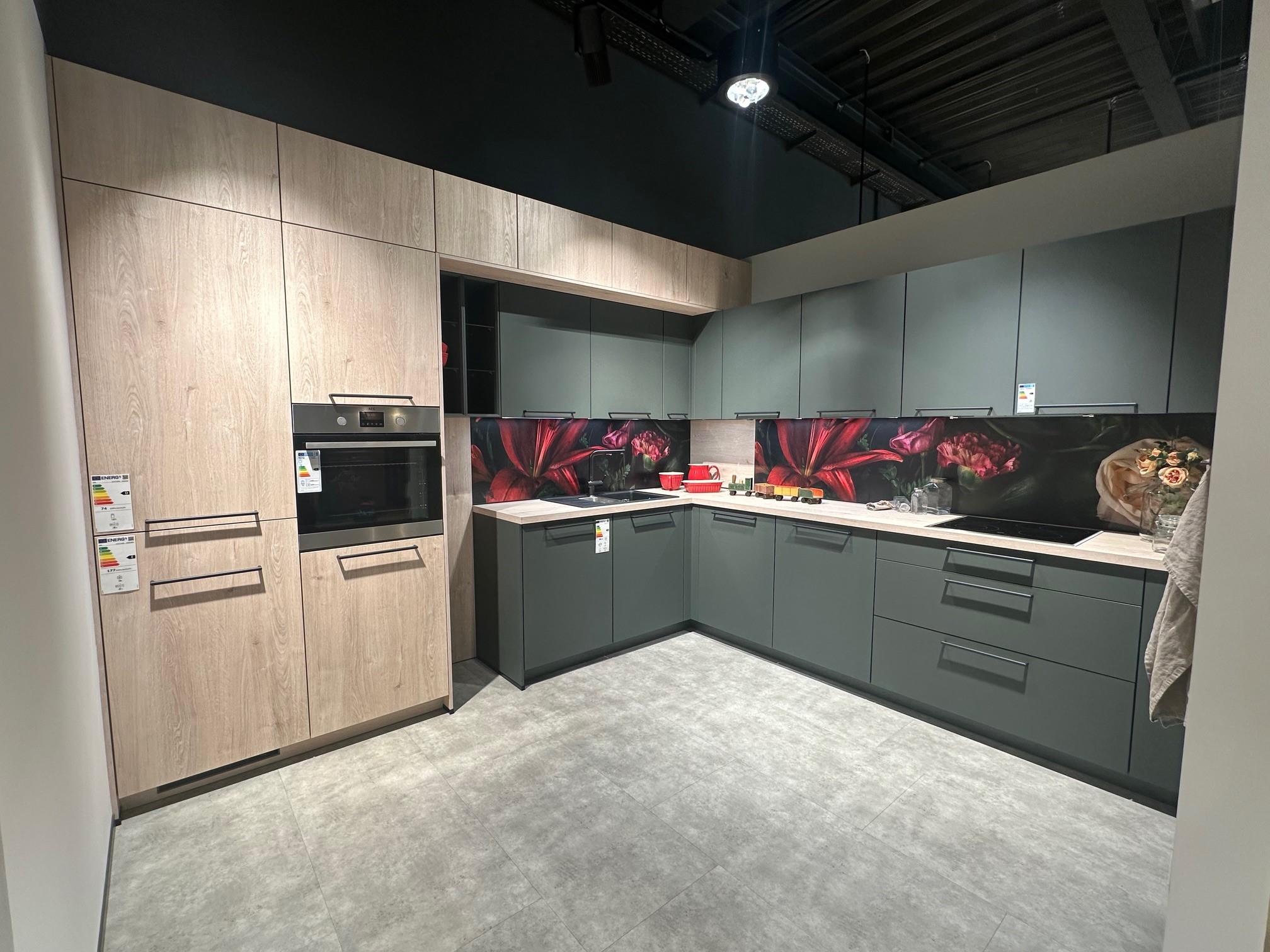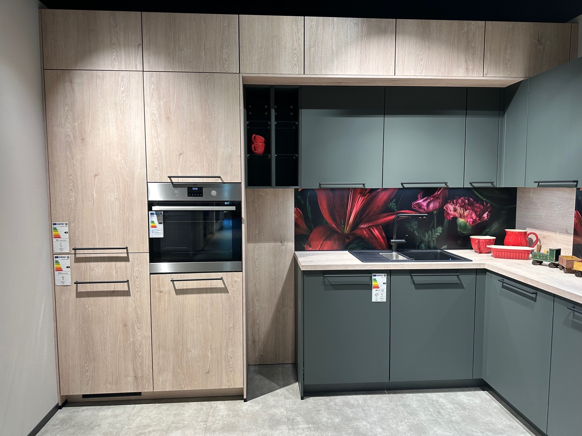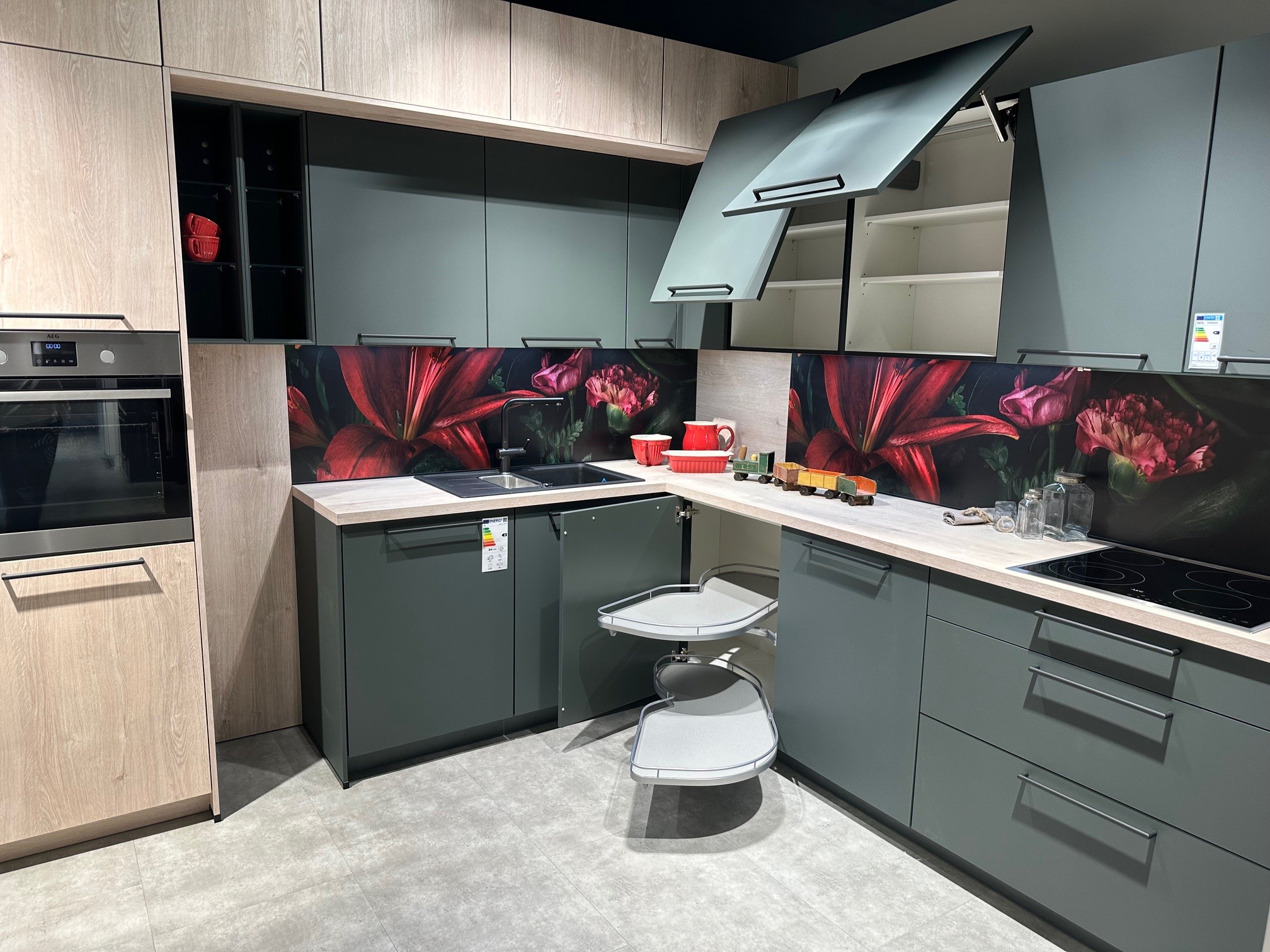 Diese mineralgrüne L- Küche mit Akzenten in Eiche Montreal besticht durch Ihre optimale Platzausnutzung. Zum einen sind die Schranke bis unter die Decke geplant und zum anderen ist auch die Ecke mit einem praktischen LeMans Schrank gelöst.