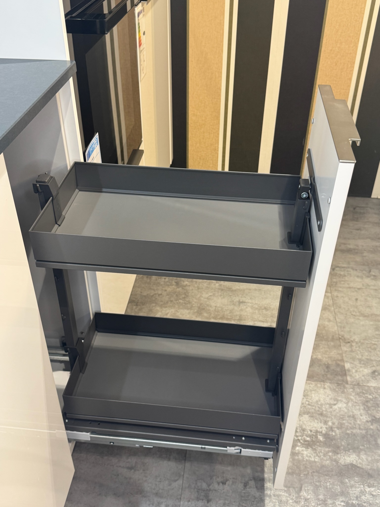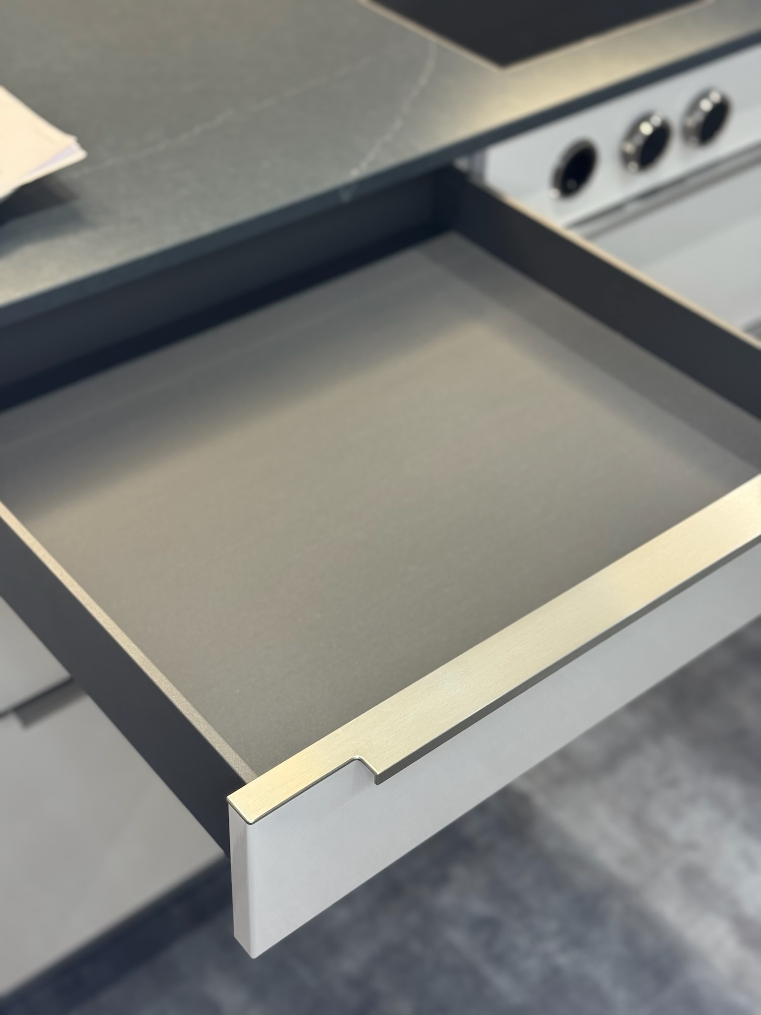 Die Qualität der Küche wird besonders durch das Auszugssystem mit 8mm SlimLine-Auszug betont. Die obere Rückwand und das Regalbord beste...