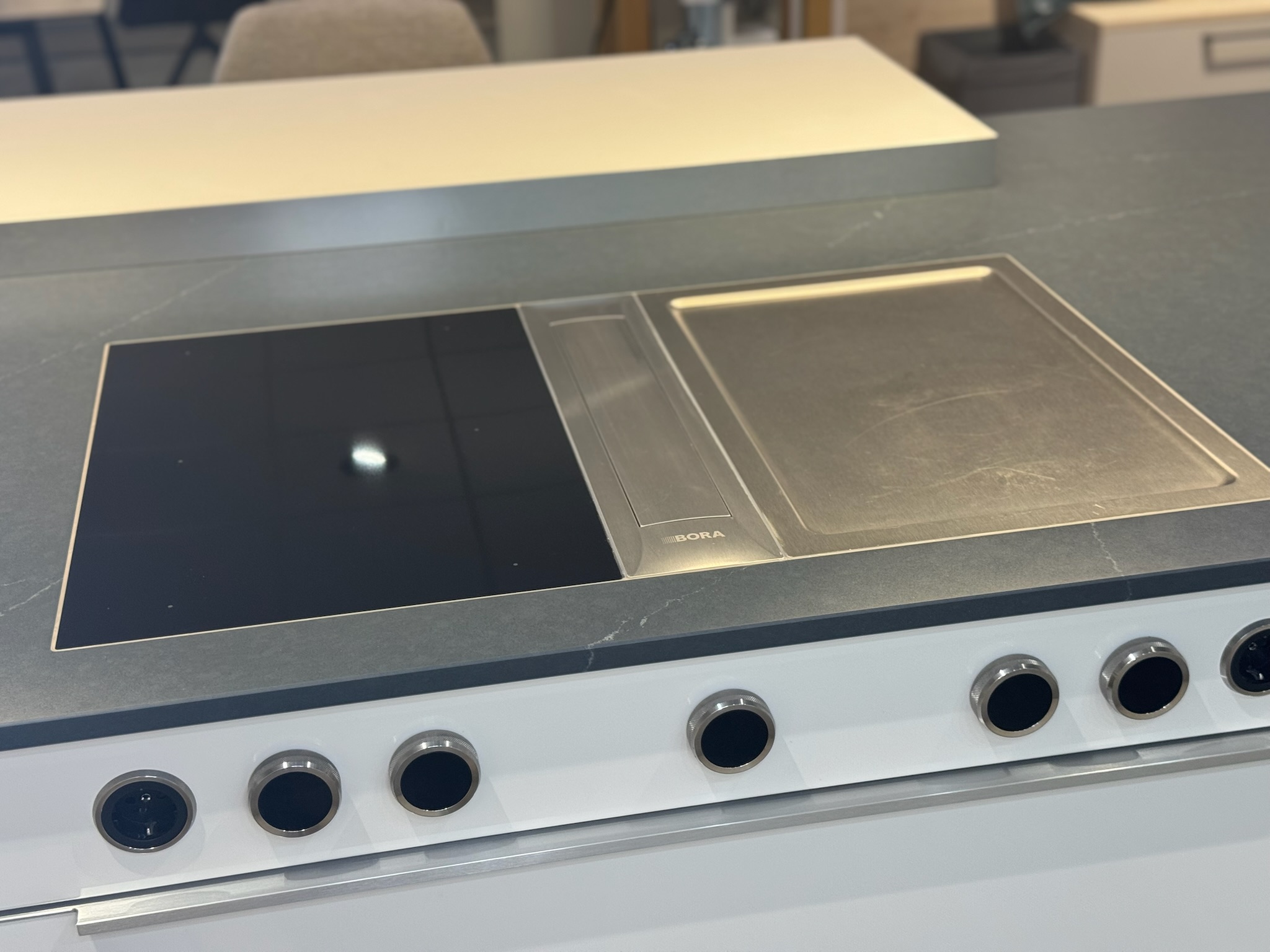 Die Qualität der Küche wird besonders durch das Auszugssystem mit 8mm SlimLine-Auszug betont. Die obere Rückwand und das Regalbord bestehen aus echtem Lärchenholzfurnier. Ein wesentliches Merkmal und Preiselement ist die Arbeitsplatte mit dem exklusiven BORA Professional 3.0. Die Koch- und Abzugstechnik ist ein integraler Bestandteil der Küche. Der XXL-Geschirrspüler der neuesten Generation ist mit Powerdisk und Automatikdosierung ausgestattet und kann jetzt auch über Wifi gesteuert werden. Die übertiefe Arbeitsplatte wird durch die Glasrückwand optimal ausgeleuchtet. Diese ist per Schalter dimmbar, und die Lichttemperatur kann von warmweiß bis kaltweiß eingestellt werden. Selbstverständlich ist dies auch bequem über eine App möglich.