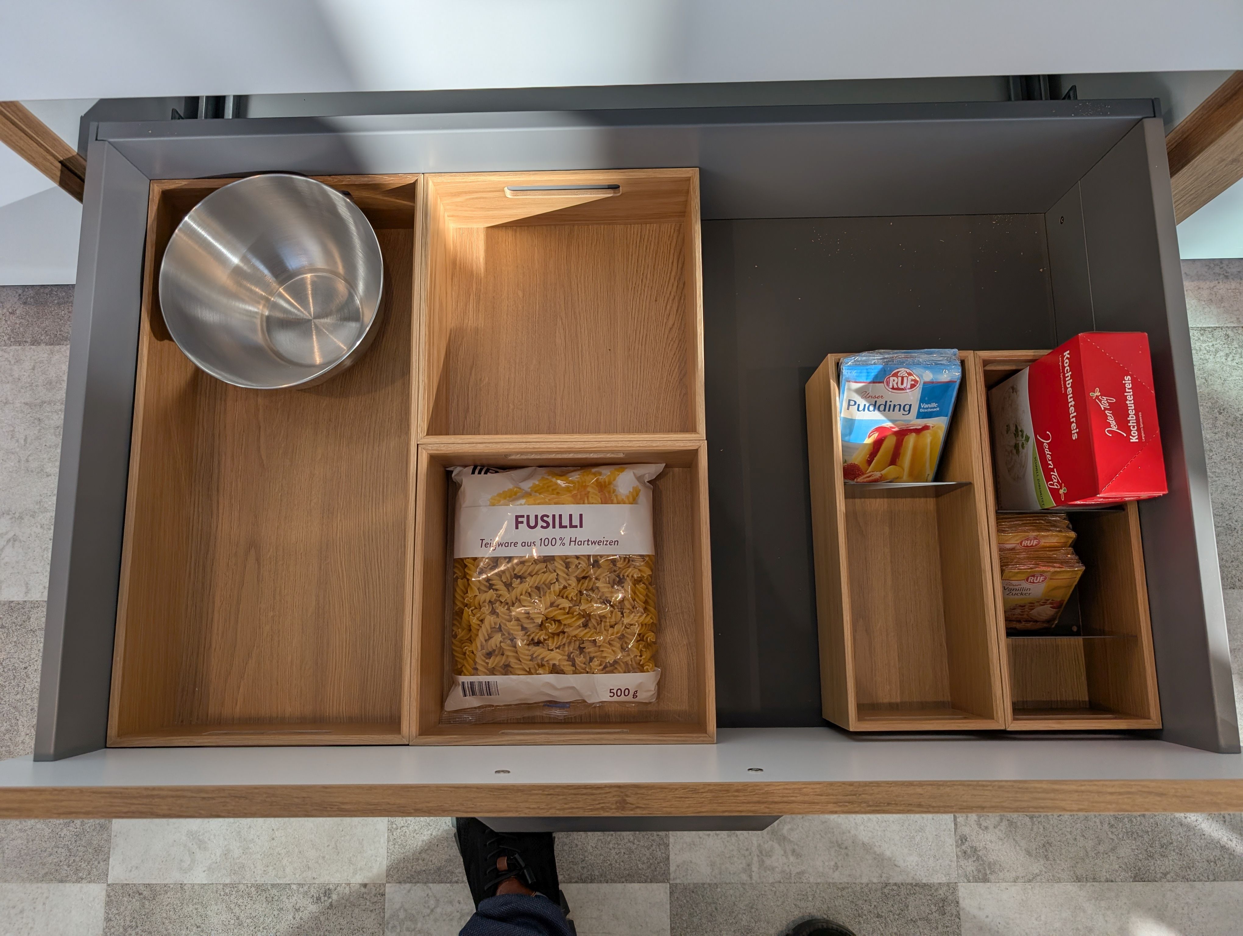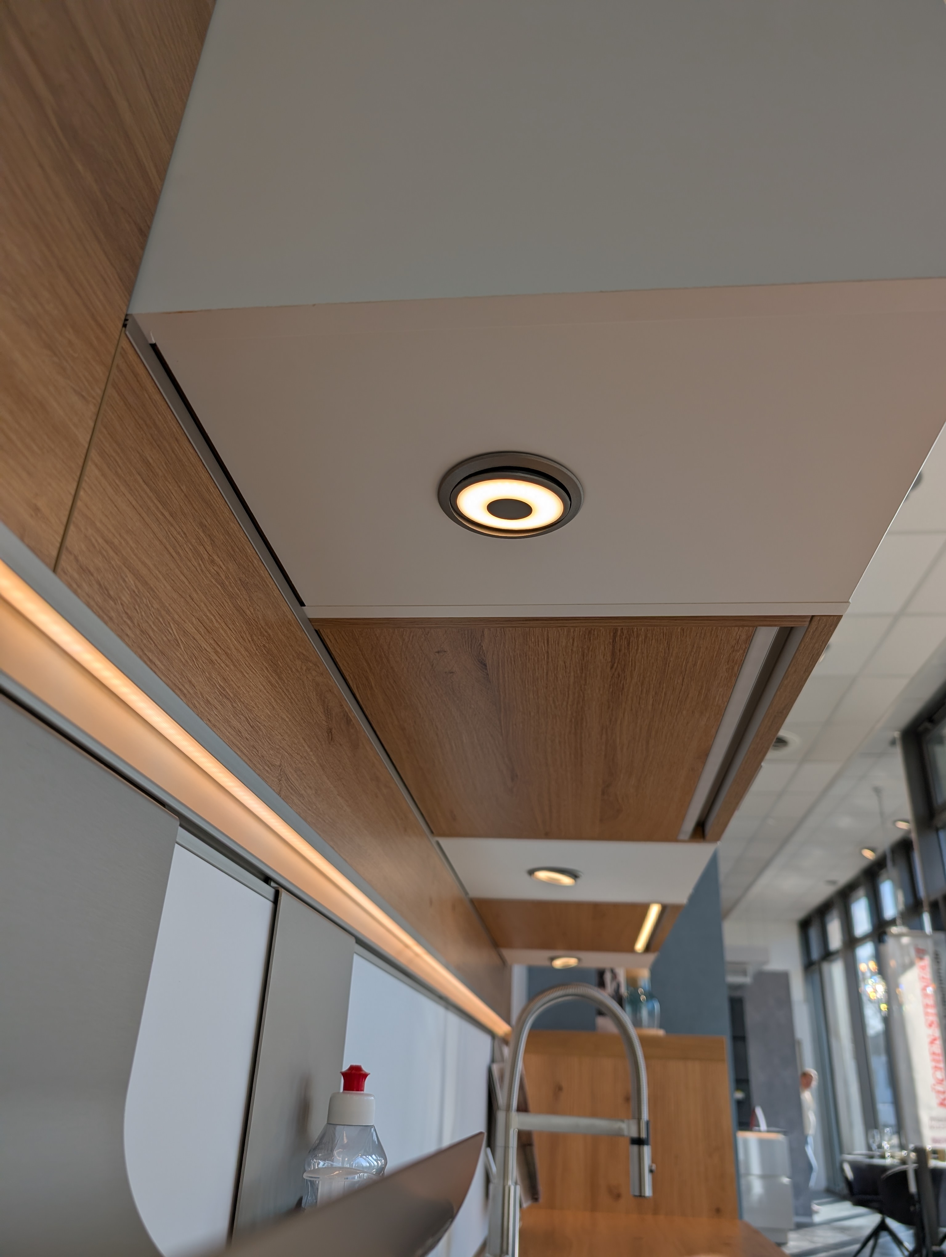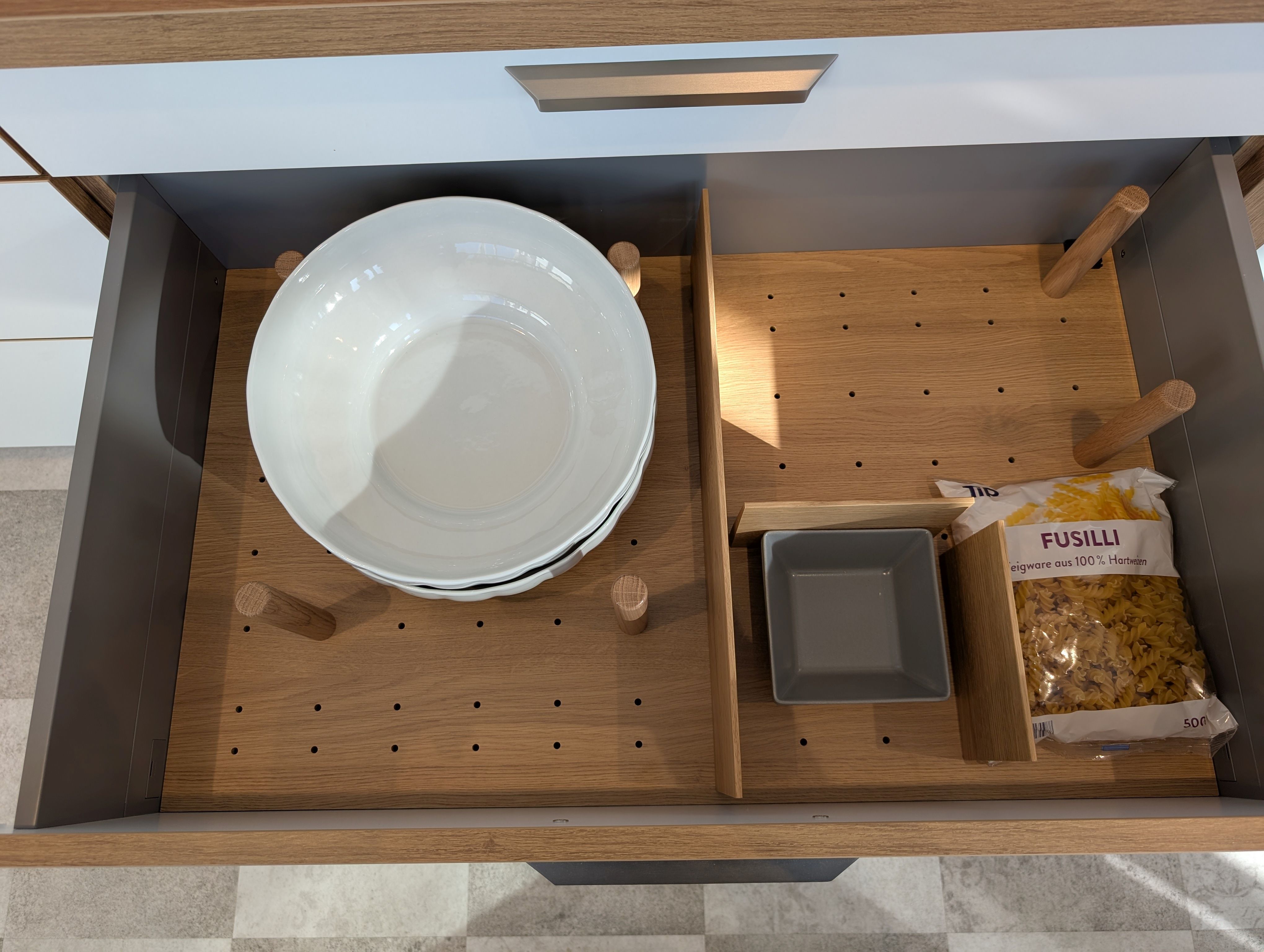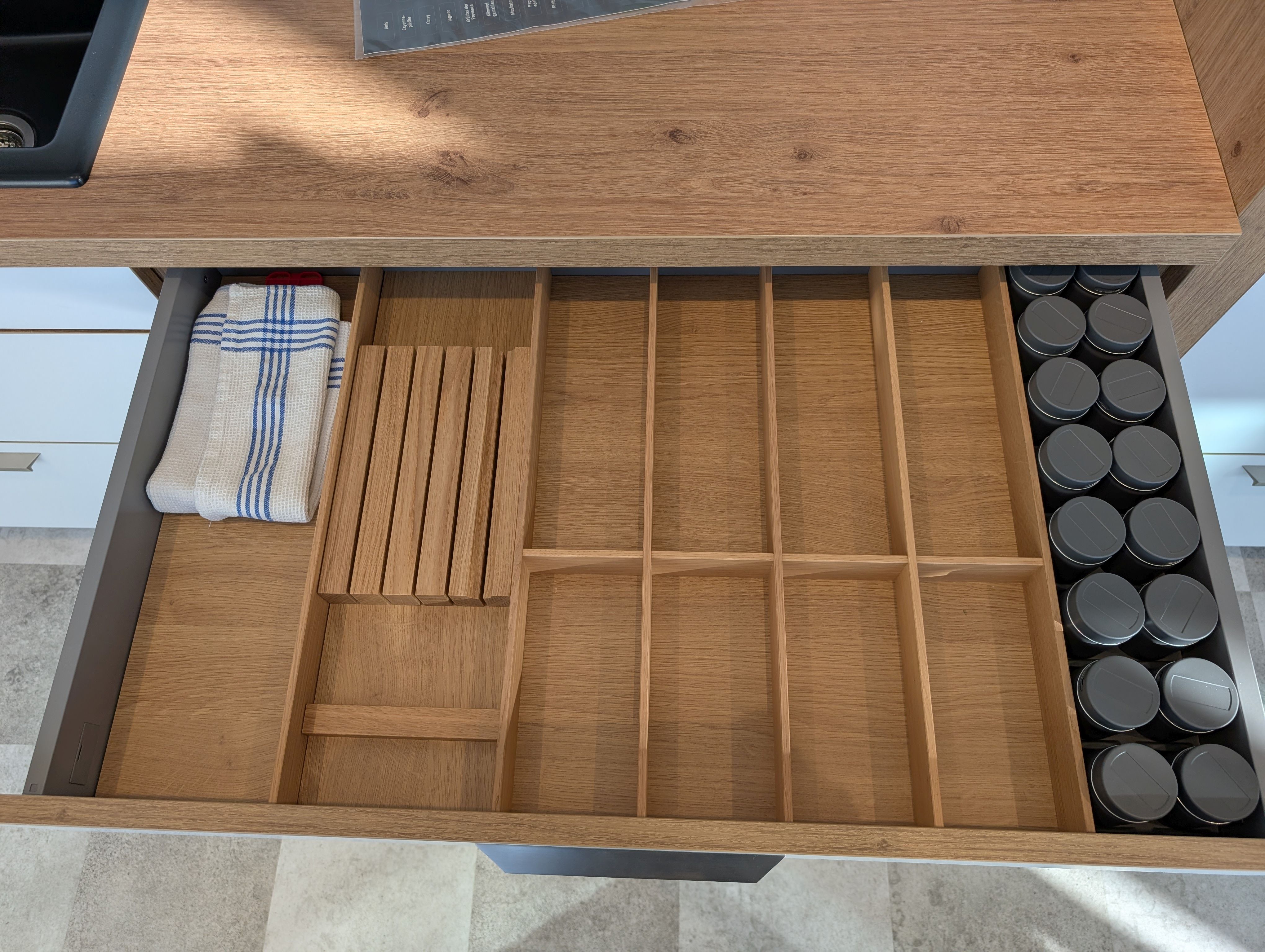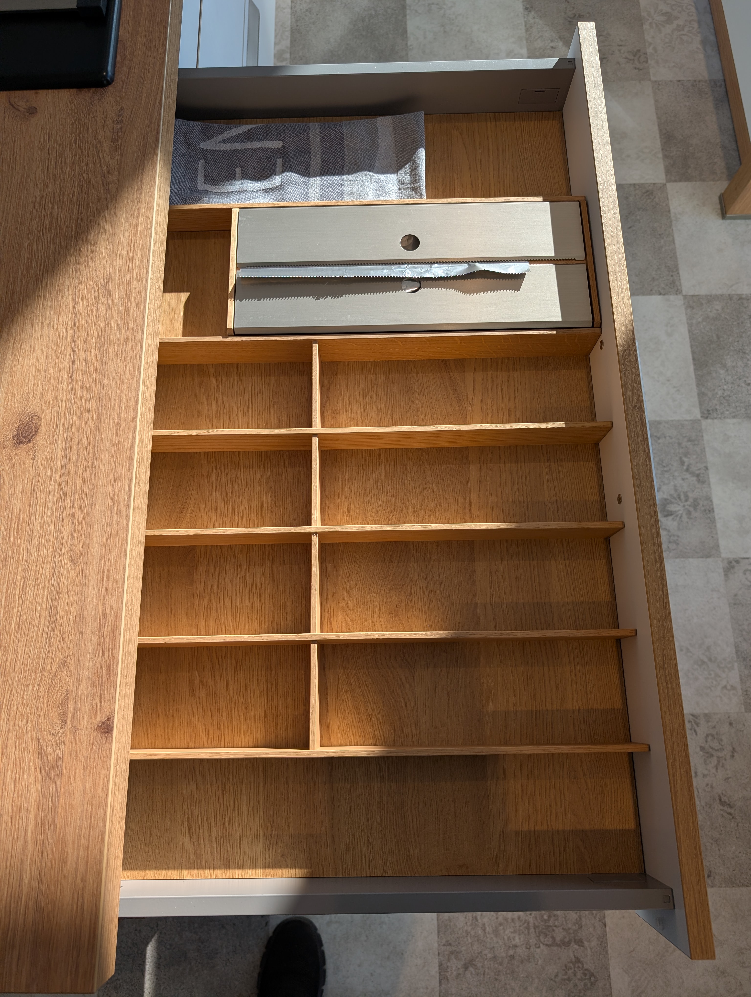 Helle moderne Küche, ohne Geräte, inkl. Spüle, Armatur, Beleuchtung und sämtlichen Zubehör und Innenausstattung. Korpus in Asteichedekor, Griffe Edelstahlfarben, große Auszügen, Highboards für hochgesetzten Backofen und Geschirrspüler vorgesehen, Wandschränke mit Glaseinsatz und Glasböden...