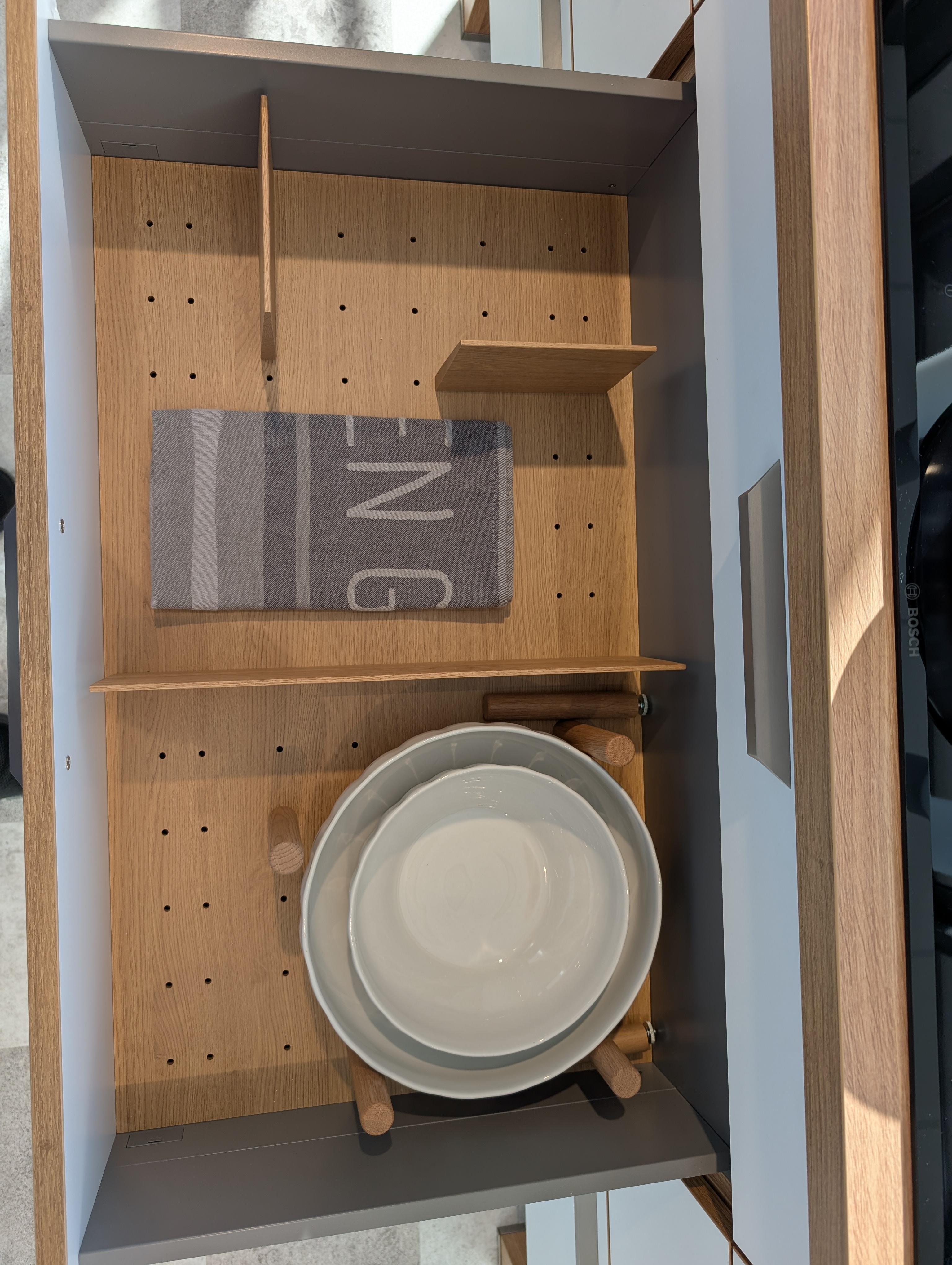 Helle moderne Küche, ohne Geräte, inkl. Spüle, Armatur, Beleuchtung und sämtlichen Zubehör und Innenausstattung. Korpus in Asteichedekor, Griffe Edelstahlfarben, große Auszügen, Highboards für hochgesetzten Backofen und Geschirrspüler vorgesehen, Wandschränke mit Glaseinsatz und Glasböden, offene Regalen und Weinregal, Kochinsel mit Ansatztisch inkl. Sitzbank mit Auszügen.