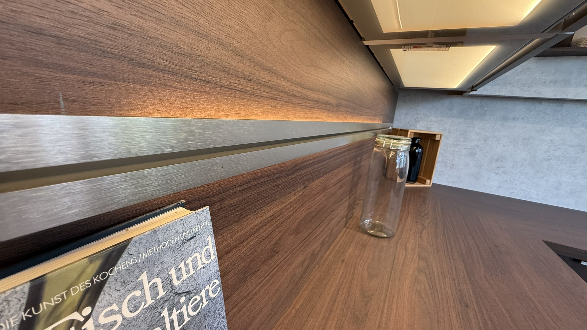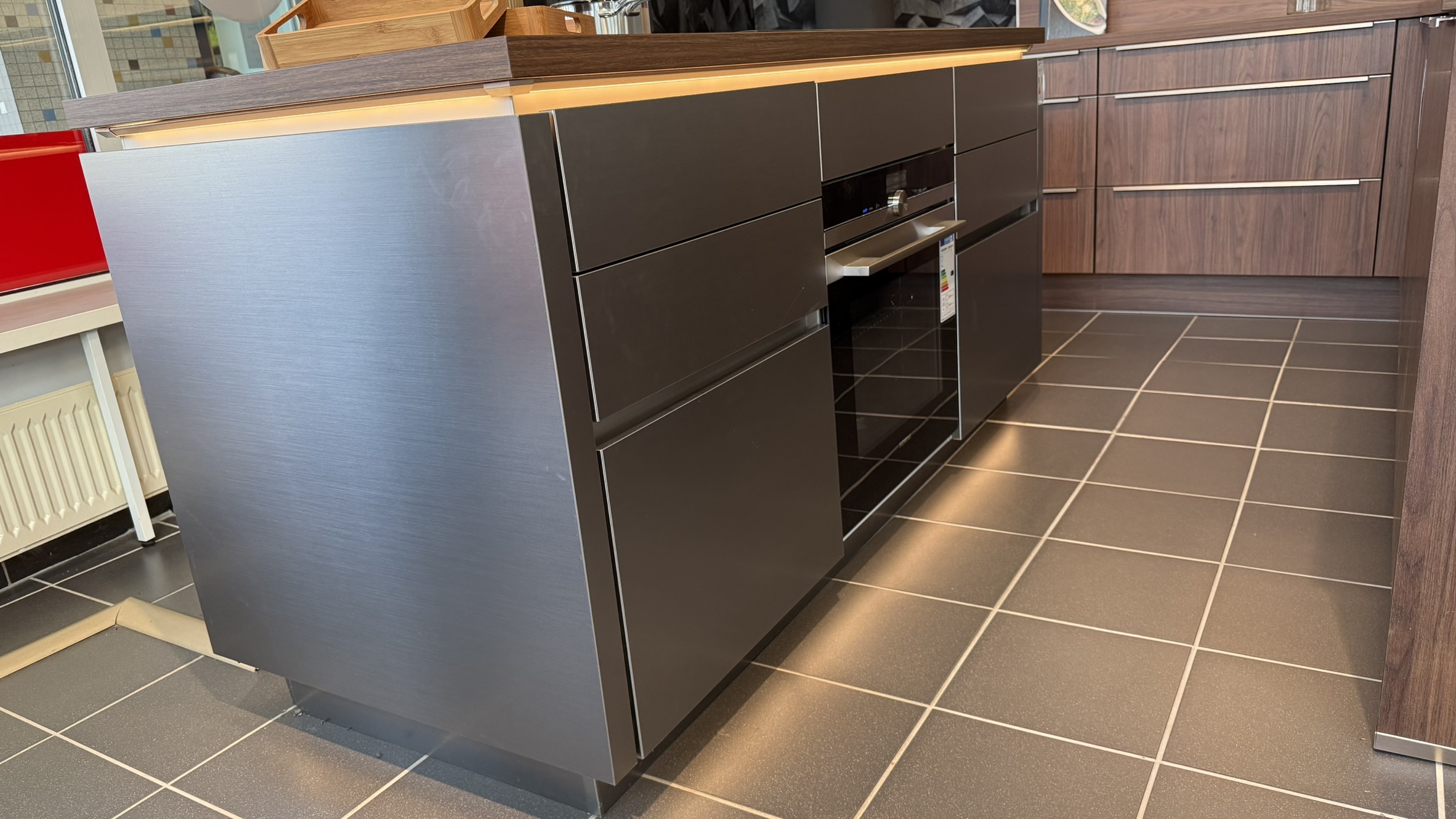 Die Küche befindet sich in einem sehr gepflegten Zustand und wurde ausschließlich als Musterküche genutzt. Durch die Kombination aus Holz- und Edelstahloptik passt sie ideal in moderne Wohnungen, offene Wohnküchen oder minimalistische Einrichtungsstile.
