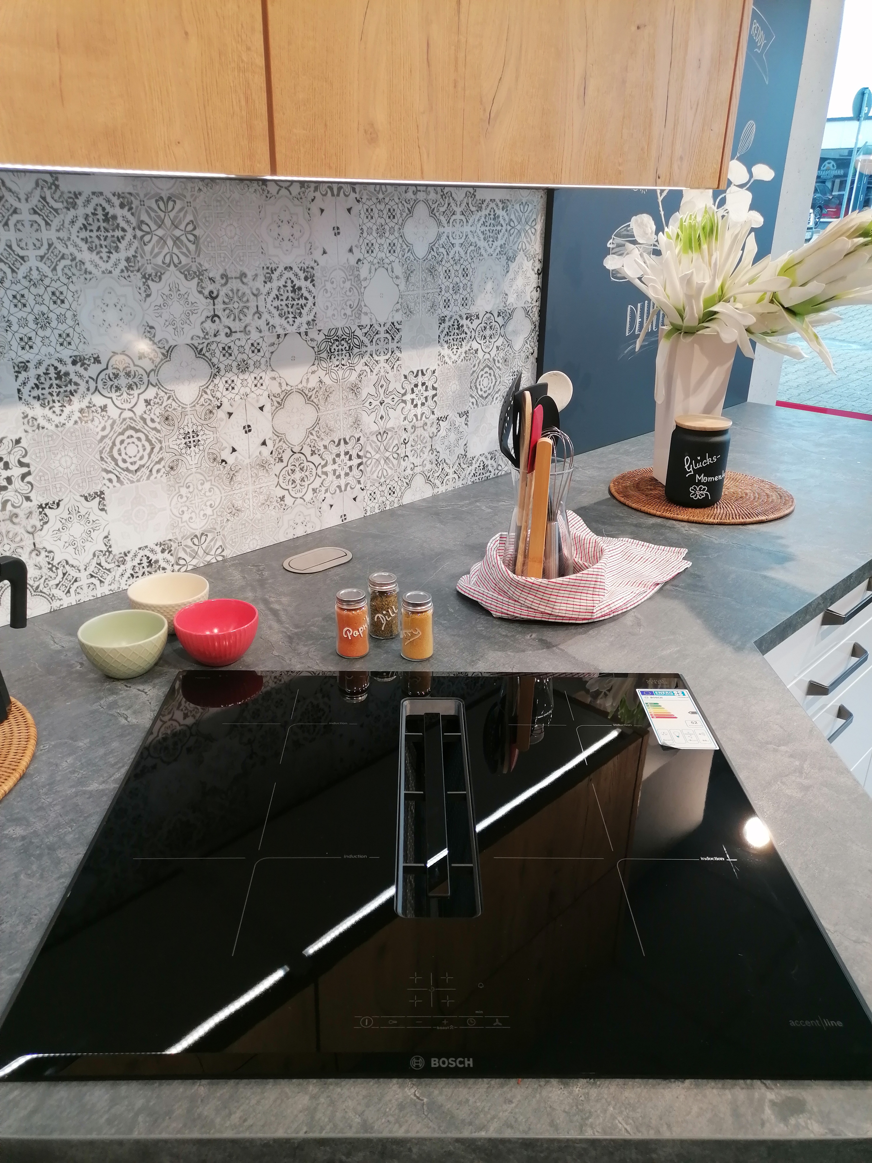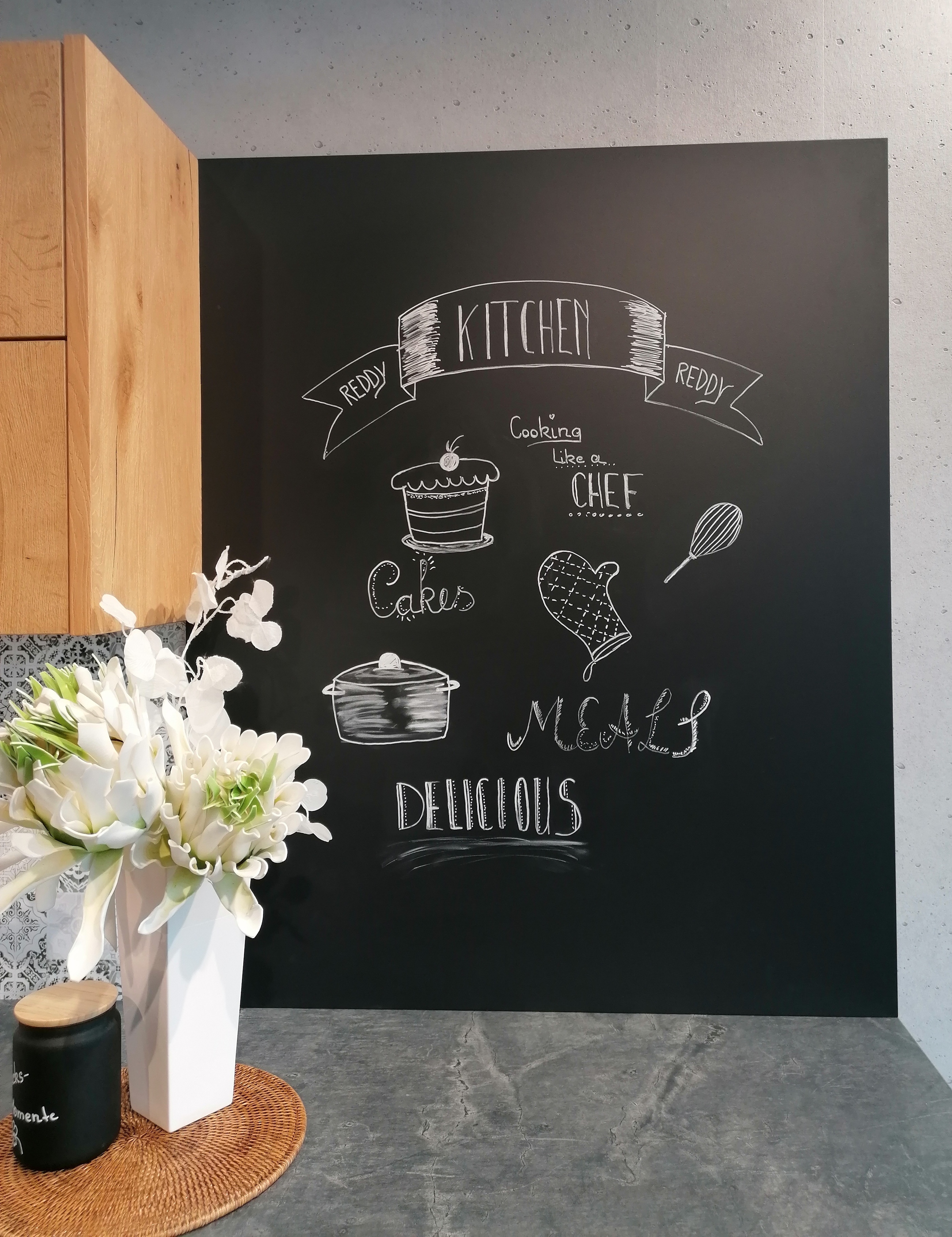 Eyecatcher ist die Rückwand im Retro Fliesenstyle und eine Kreidetafel zum beschriften, designen oder Kochrezepte, ganz wie es Ihnen gefällt.