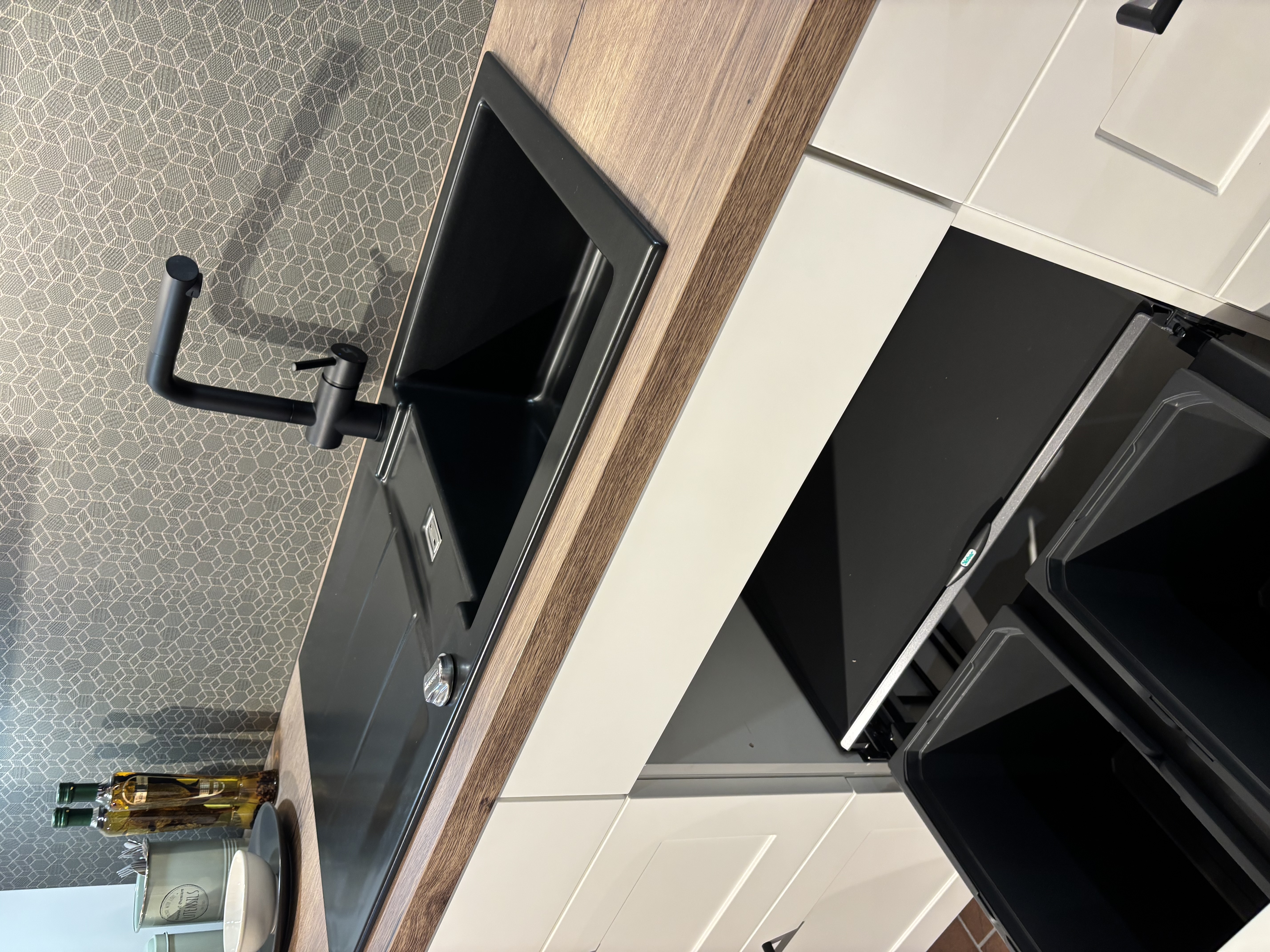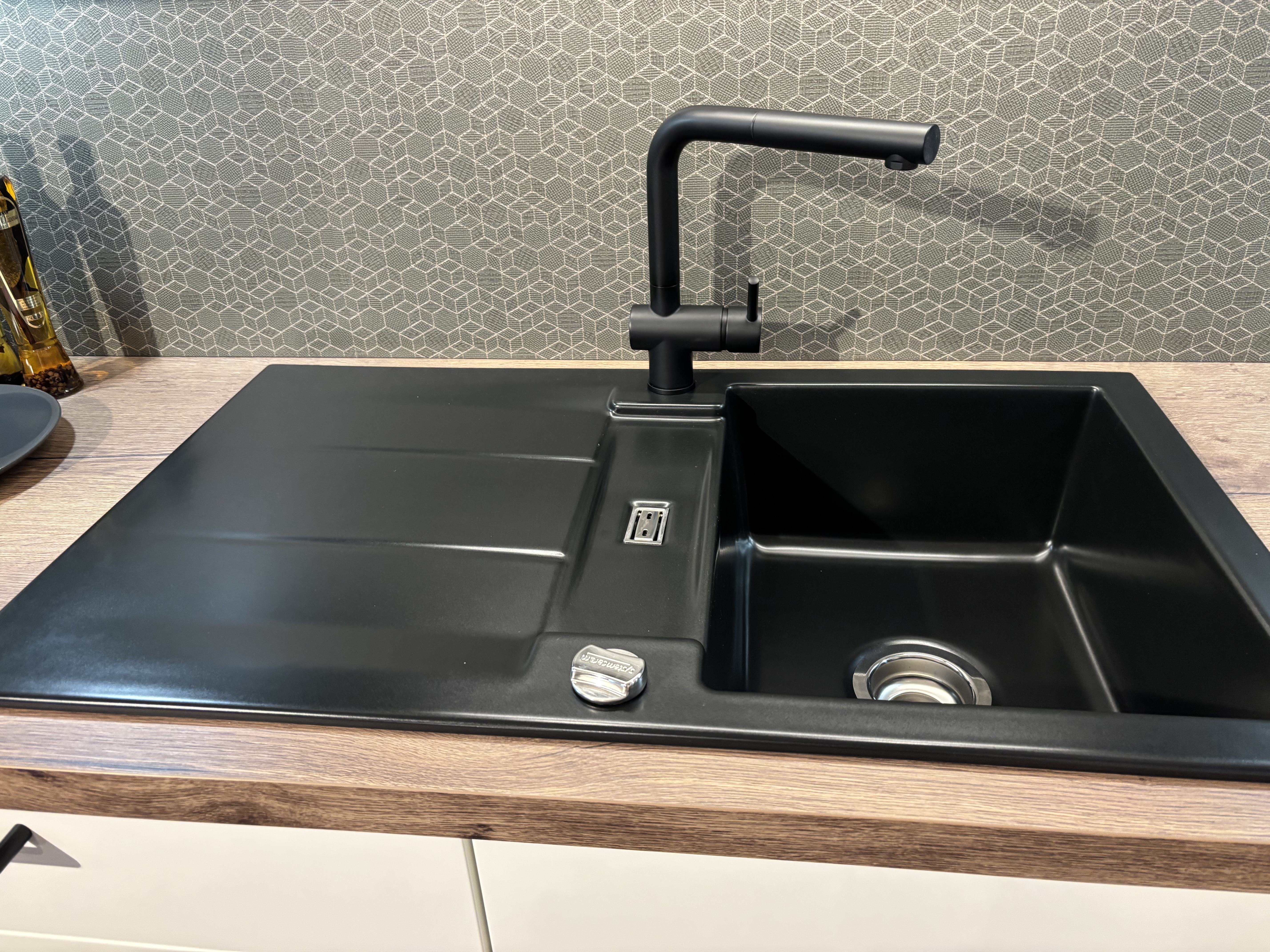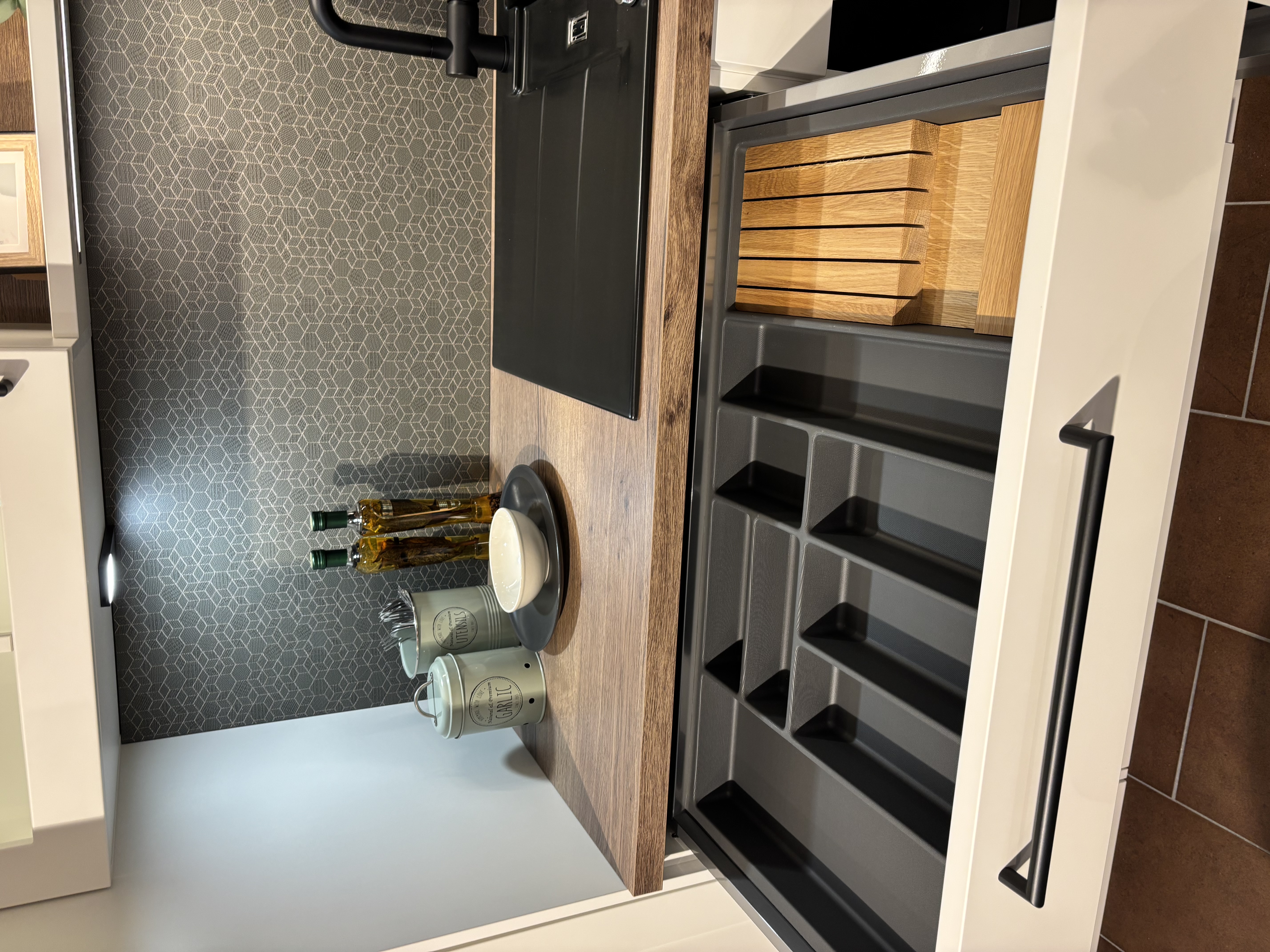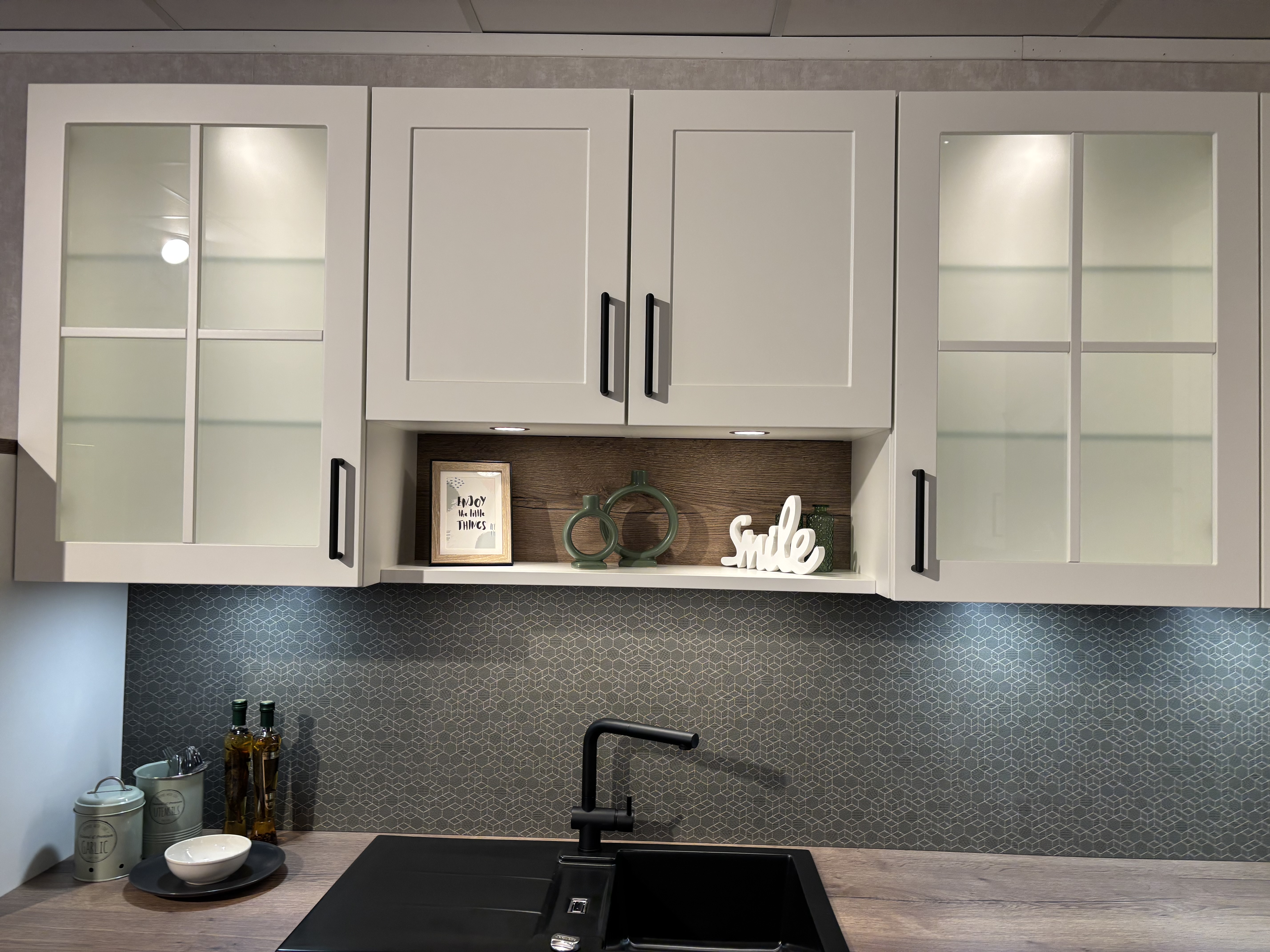 Diese moderne Landhausküche in Weiß matt lackiert mit den Schwarzen Griffen und der Arbeitsplatte in Eiche Havanna vermittelt einen gemütlichen Charakter. Die kleinen Details wie die bedruckte Rückwandverkleidung in Grün,