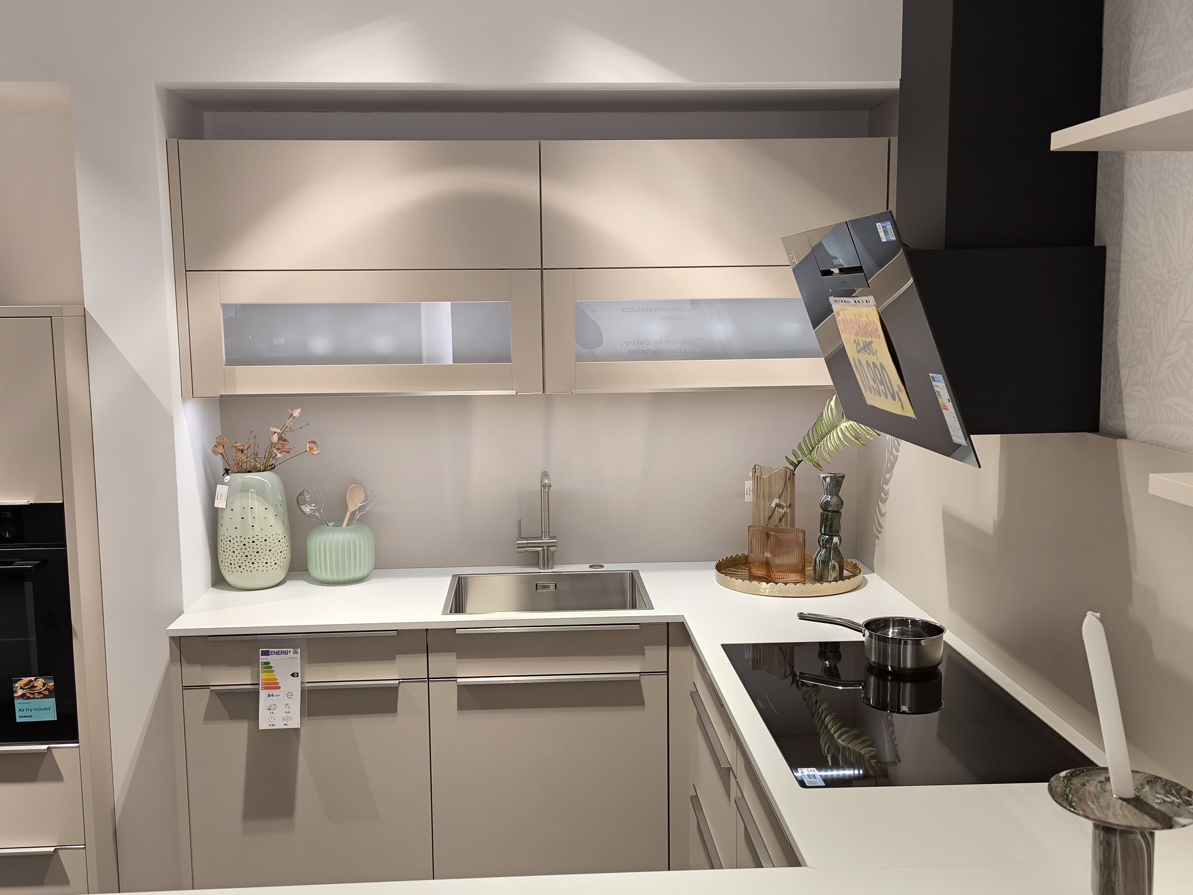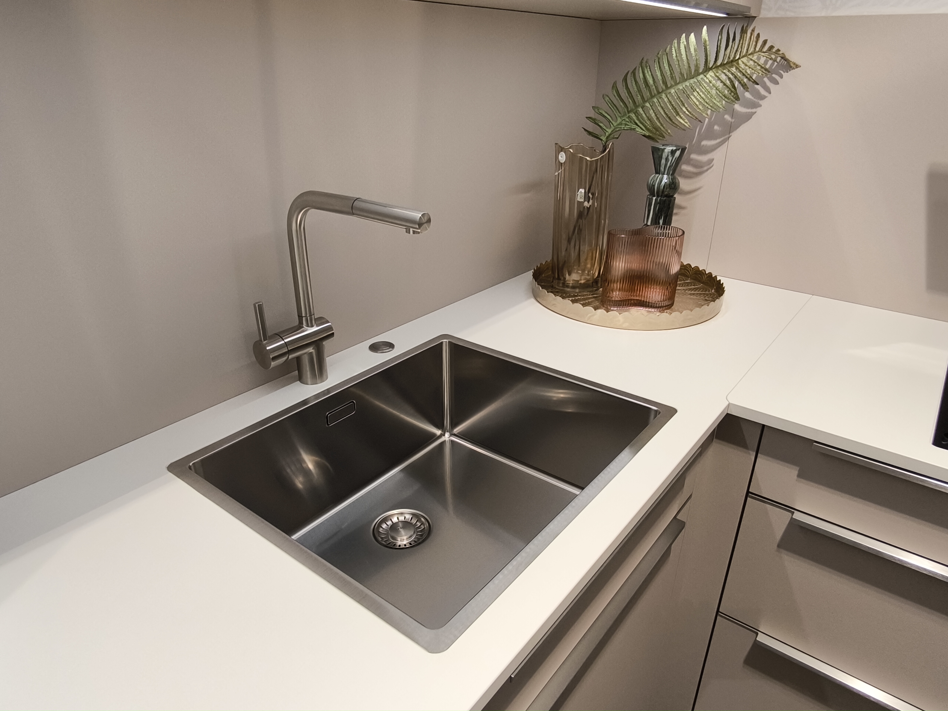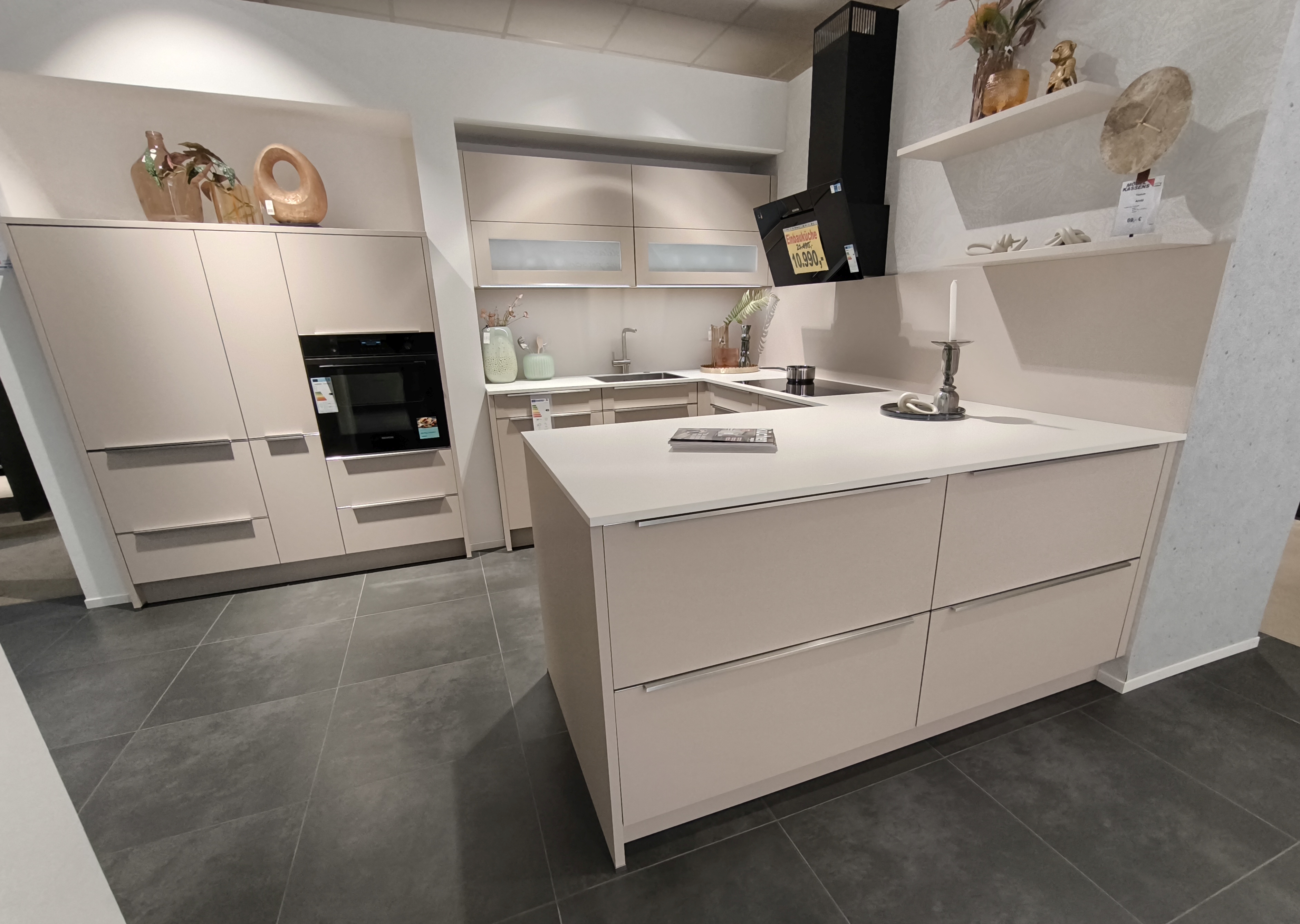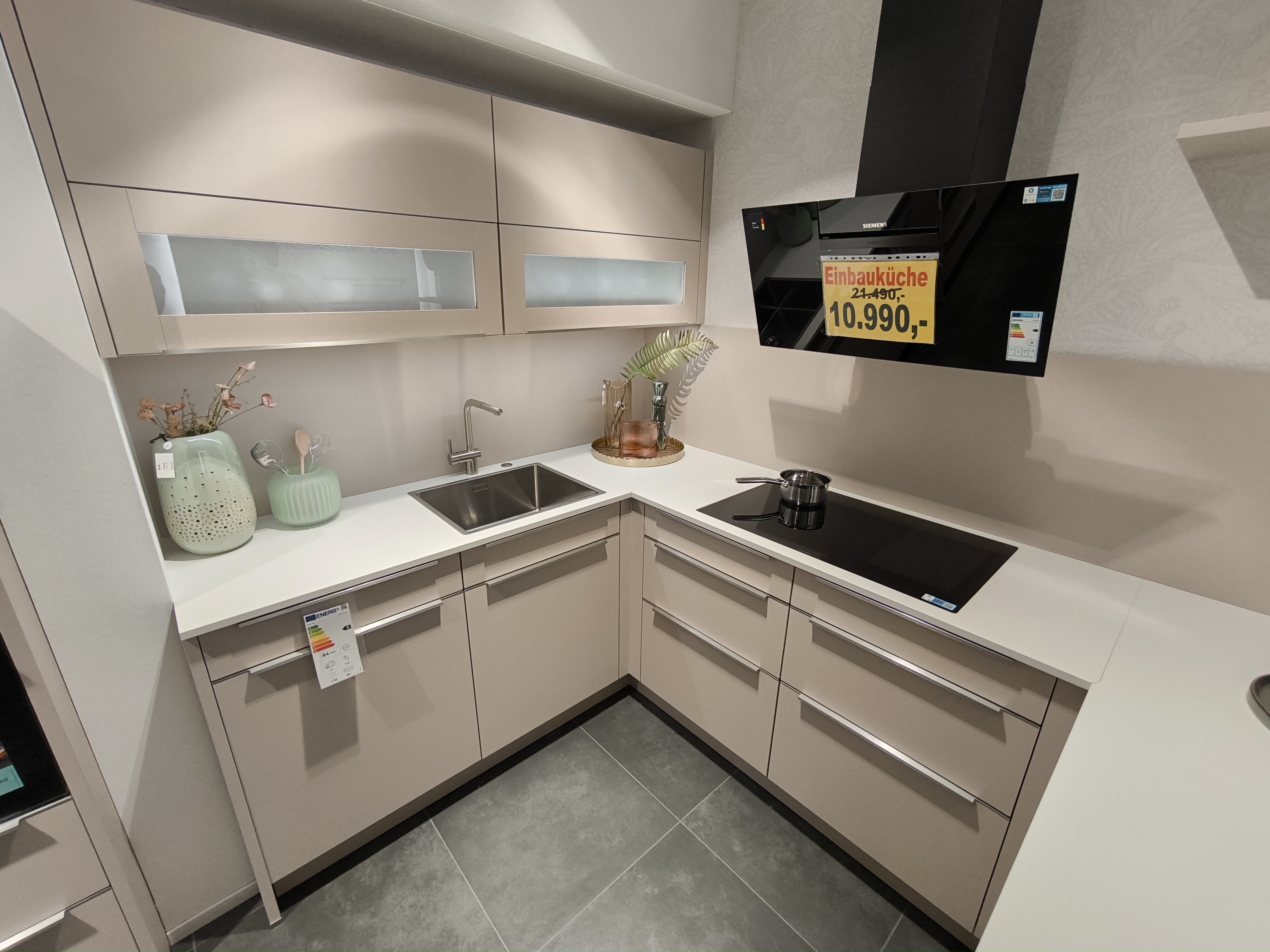 moderne ELEMENTA (HÄCKER) Musterküche in trendigen Farbton Kaschmir mit einer weißen Keramik-Arbeitsplatte.