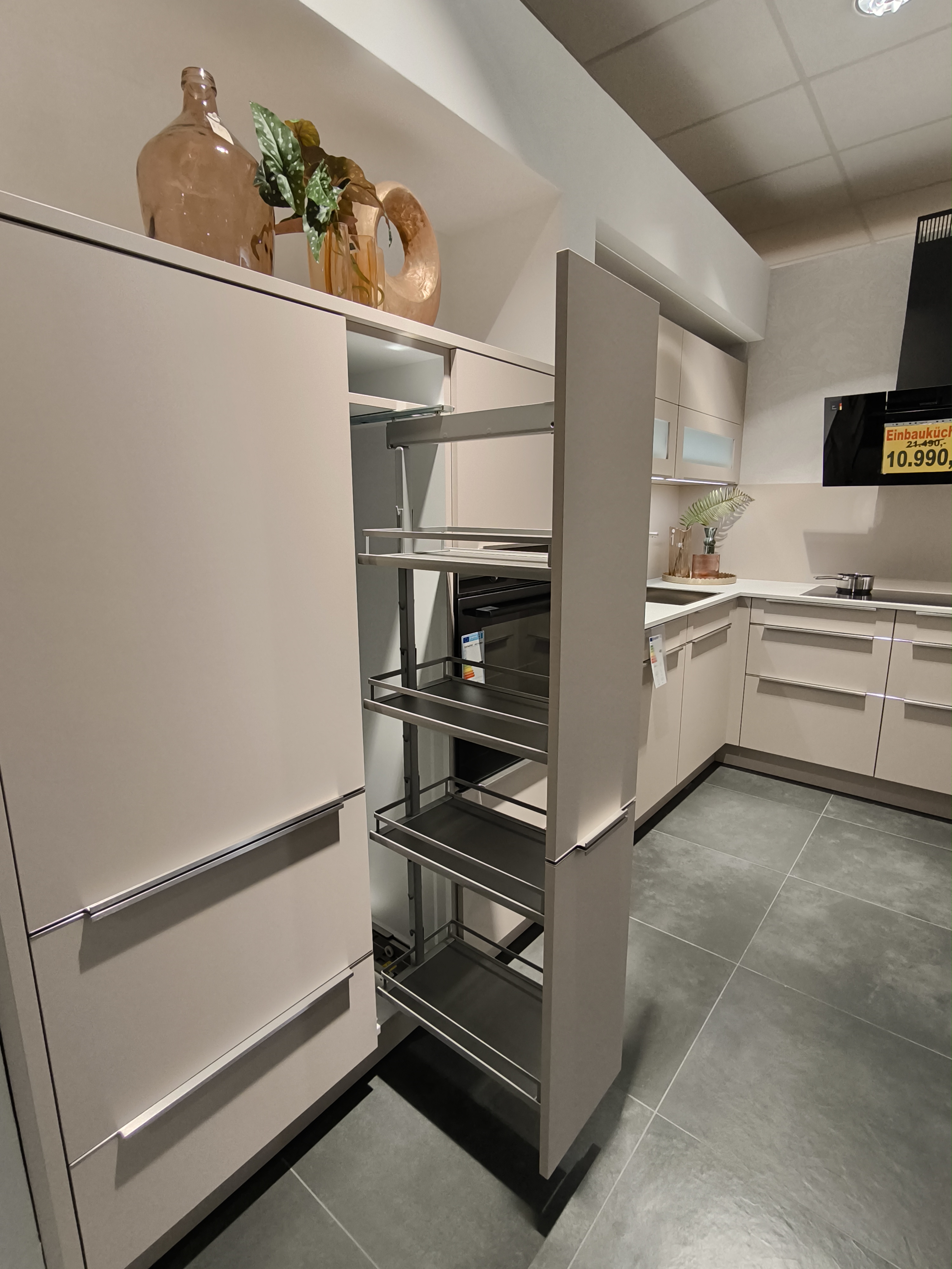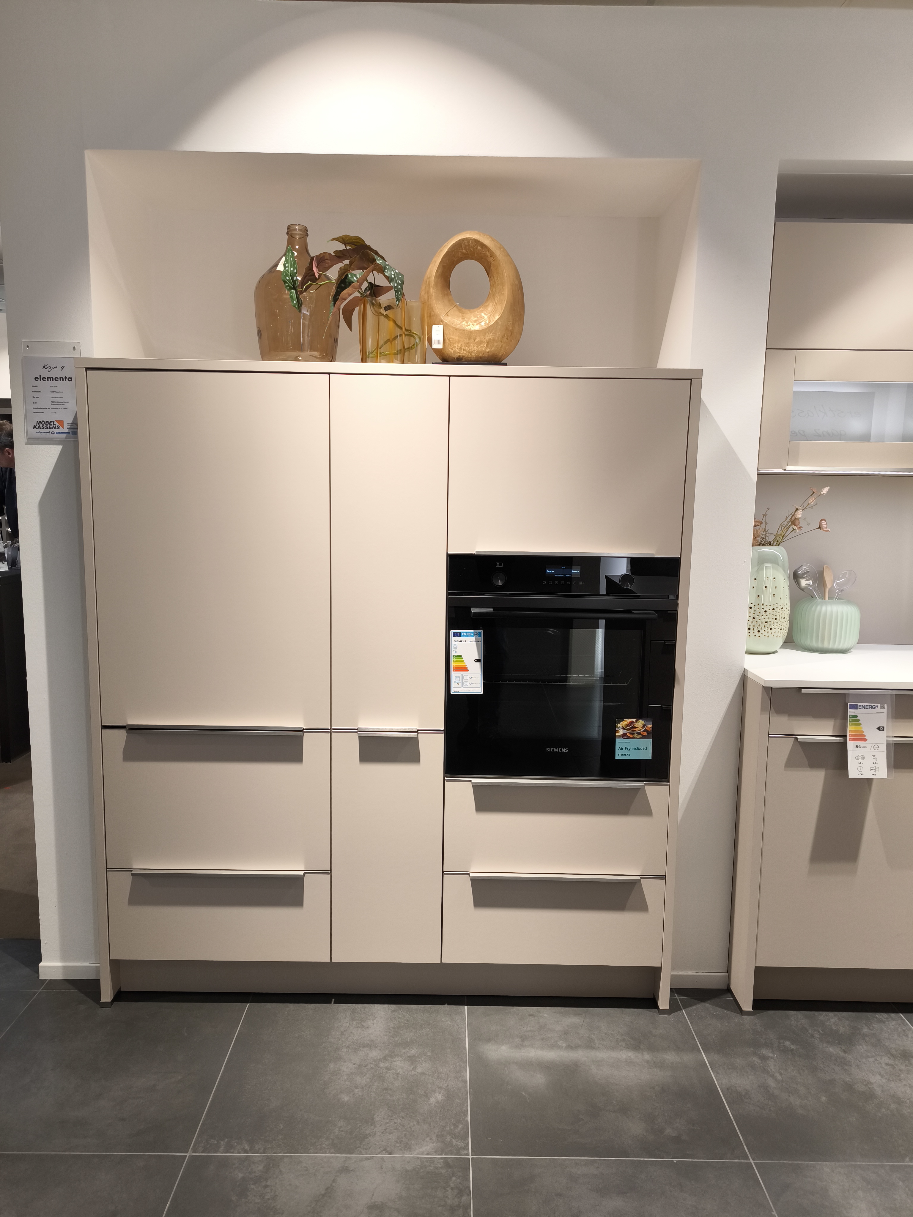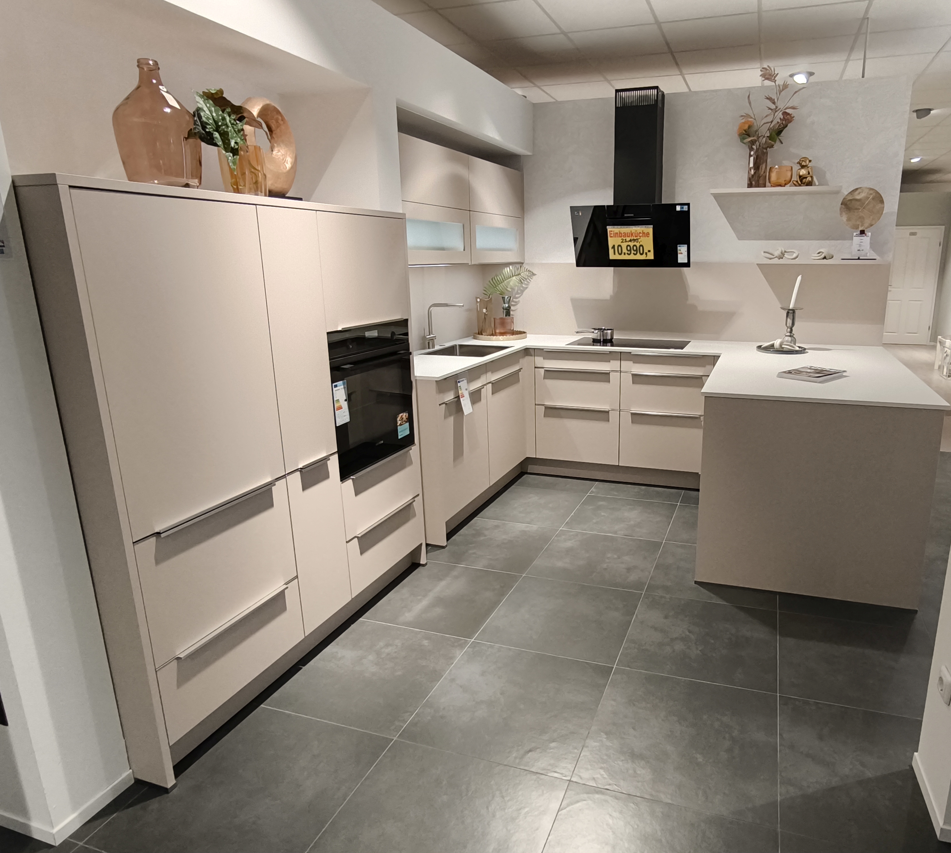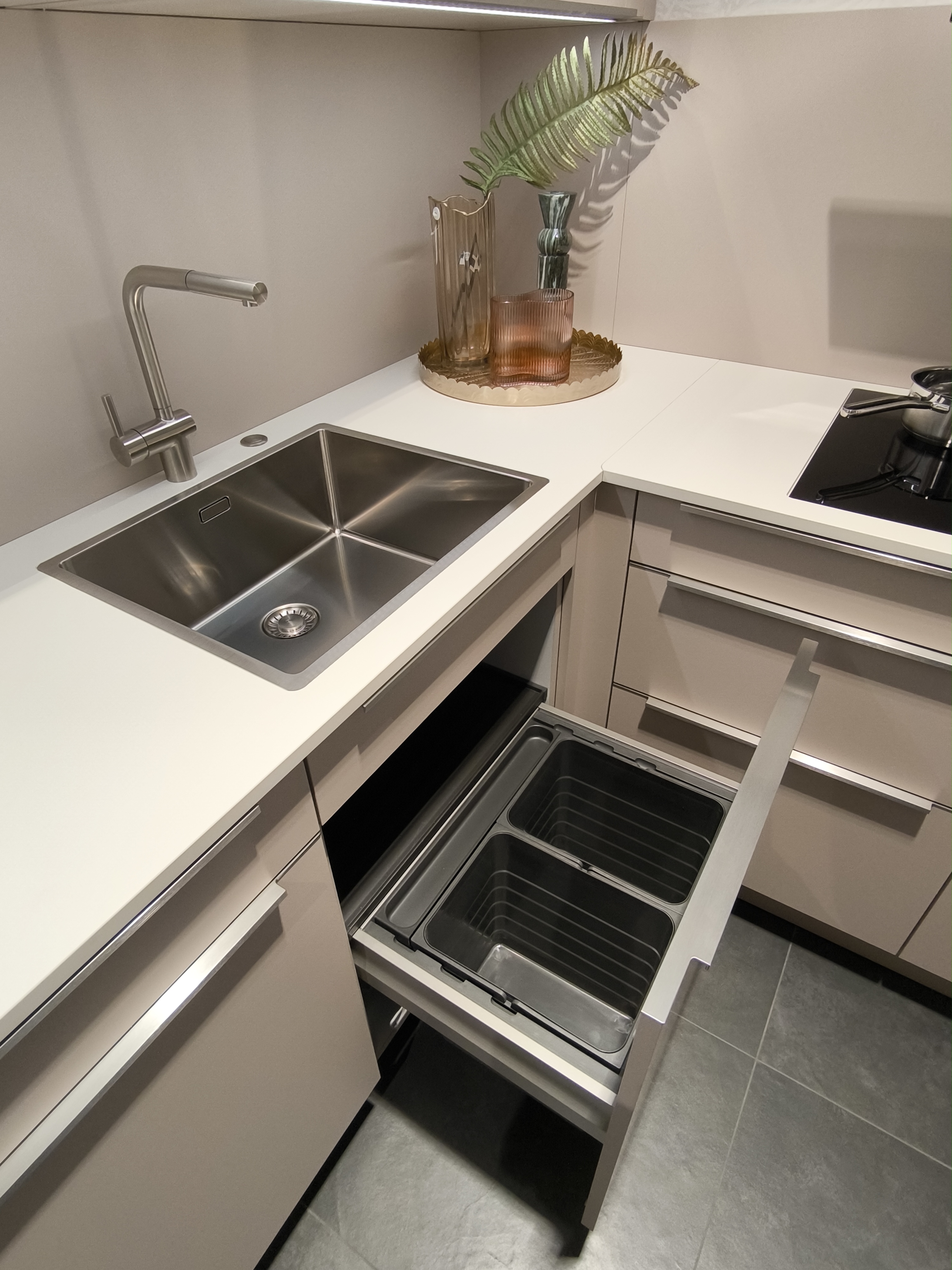 moderne ELEMENTA (HÄCKER) Musterküche in trendigen Farbton Kaschmir mit einer weißen Keramik-Arbeitsplatte.