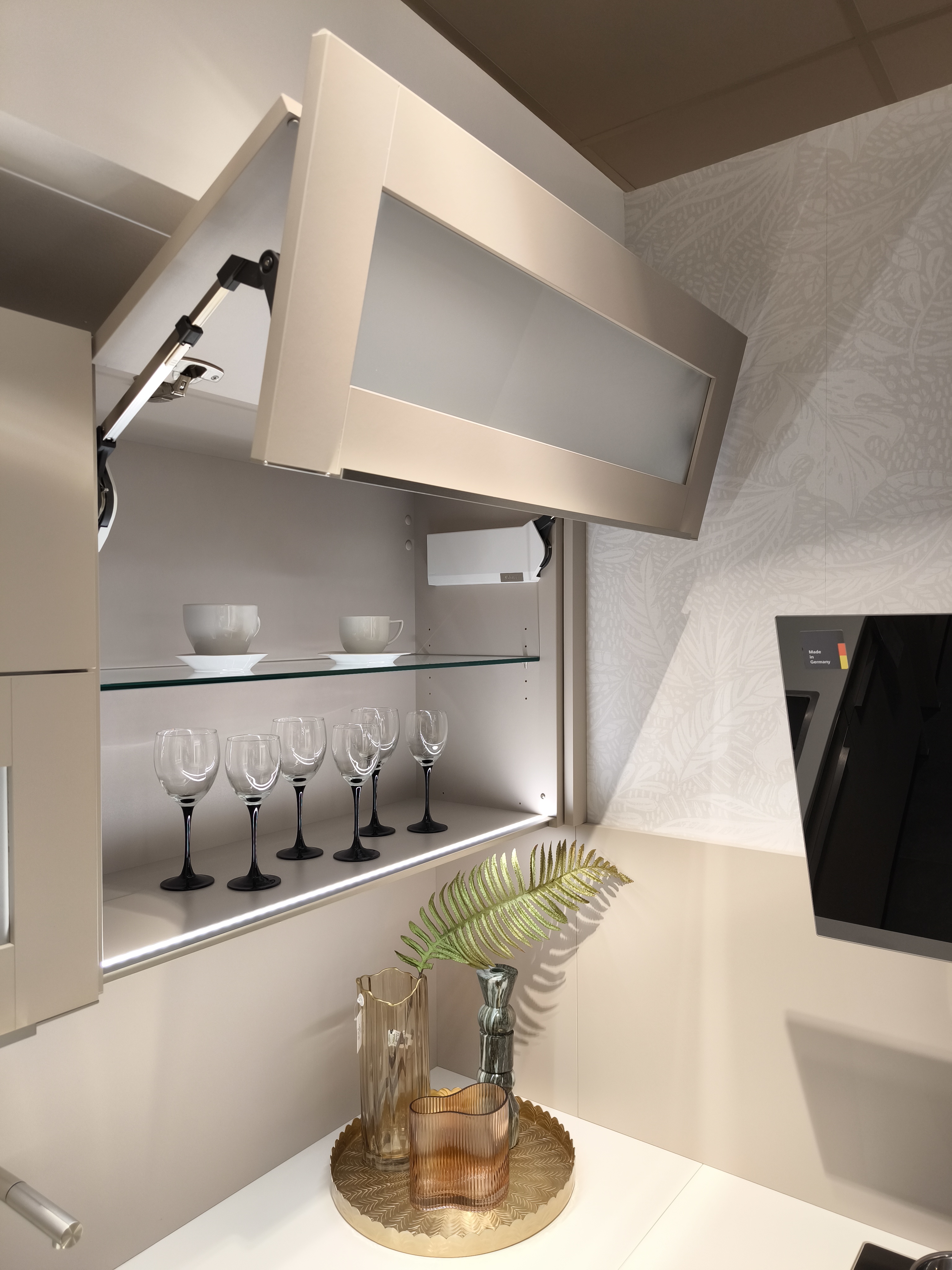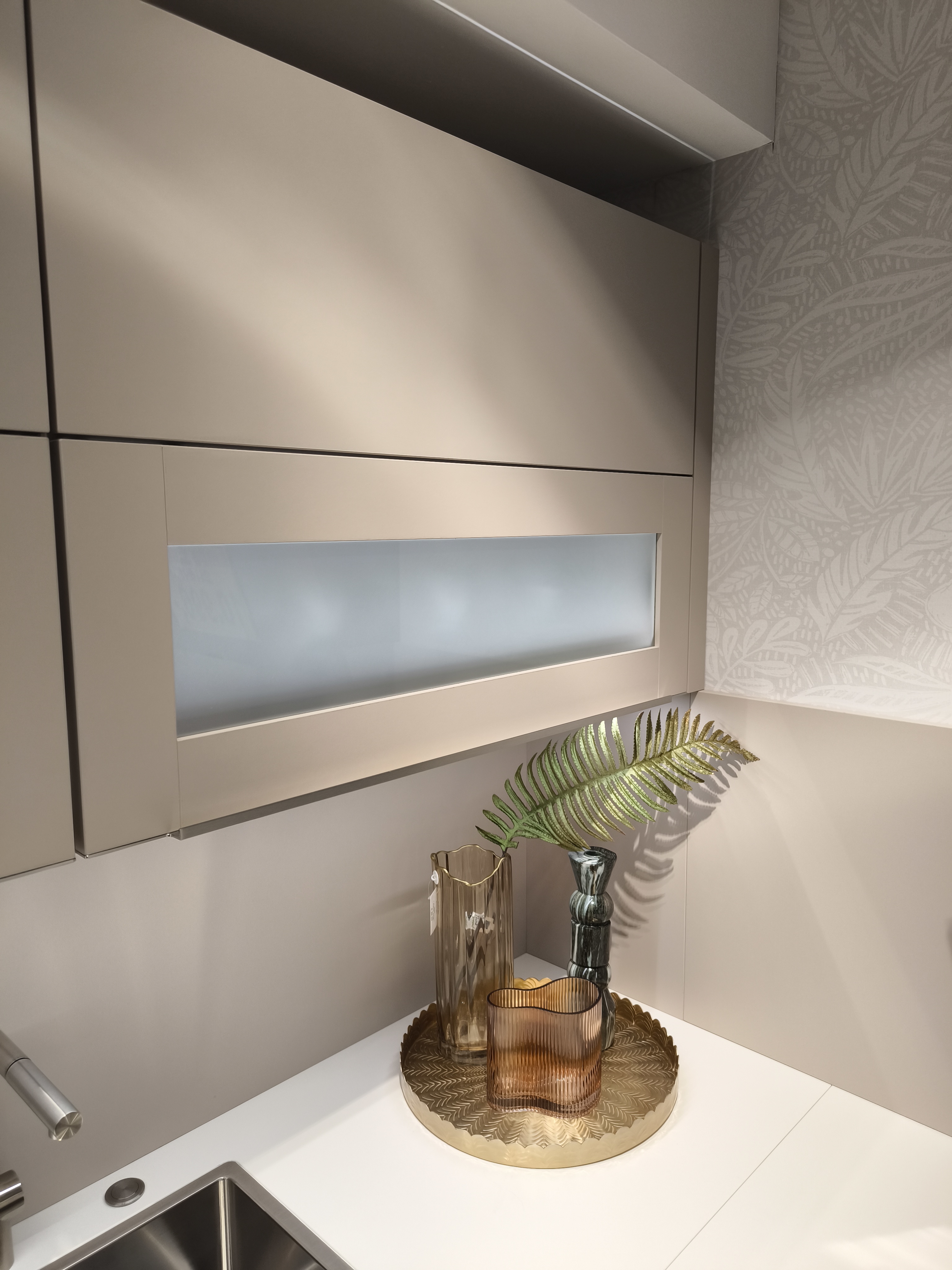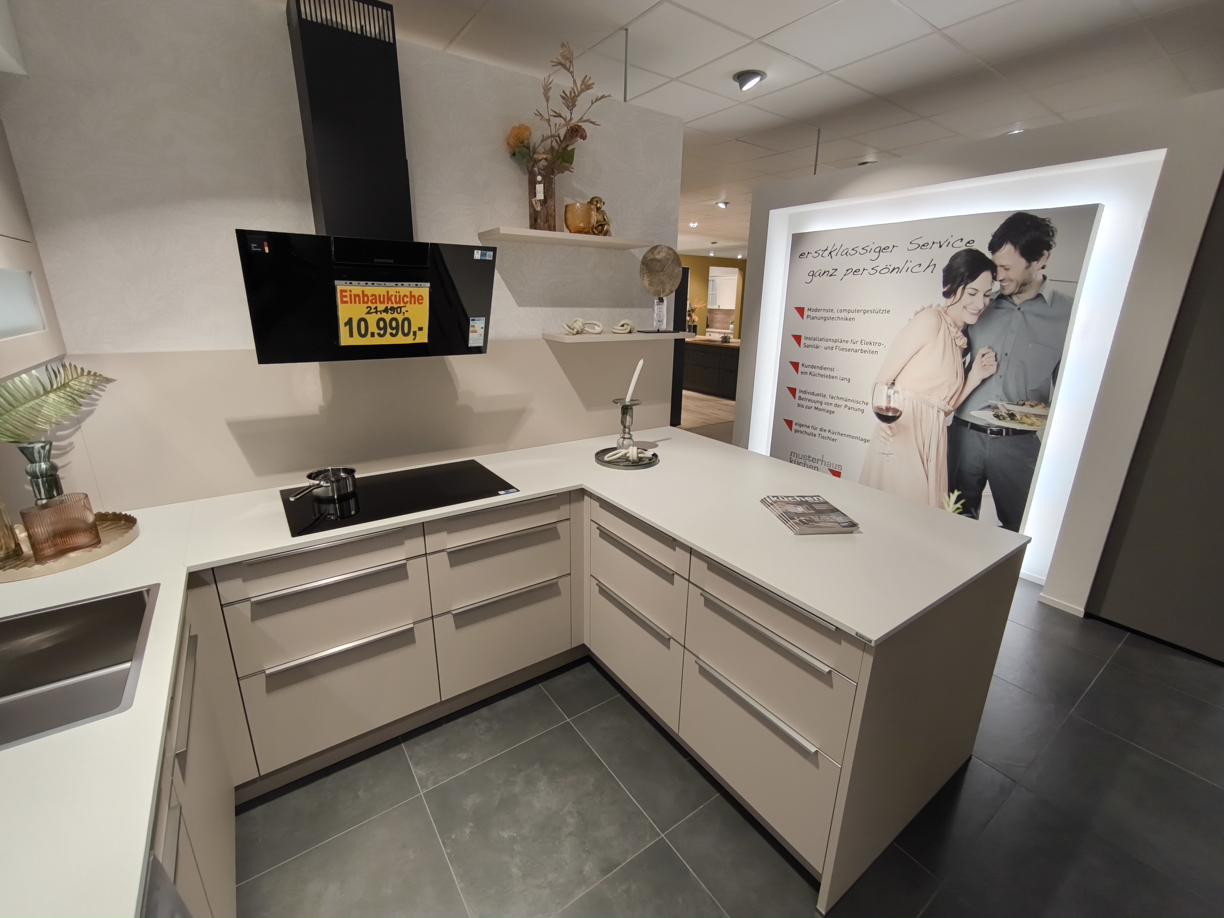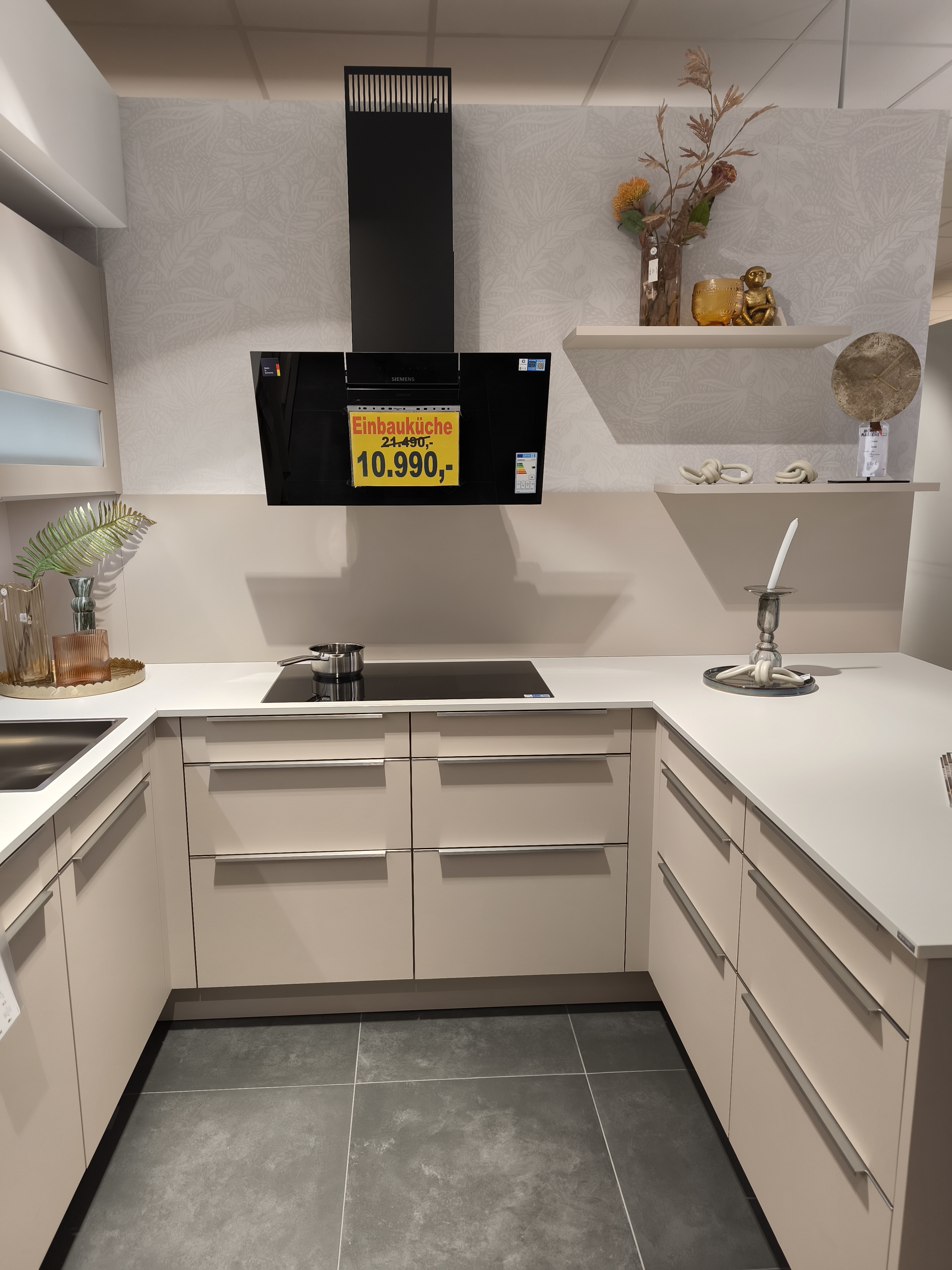 moderne ELEMENTA (HÄCKER) Musterküche in trendigen Farbton Kaschmir mit einer weißen Keramik-Arbeitsplatte.