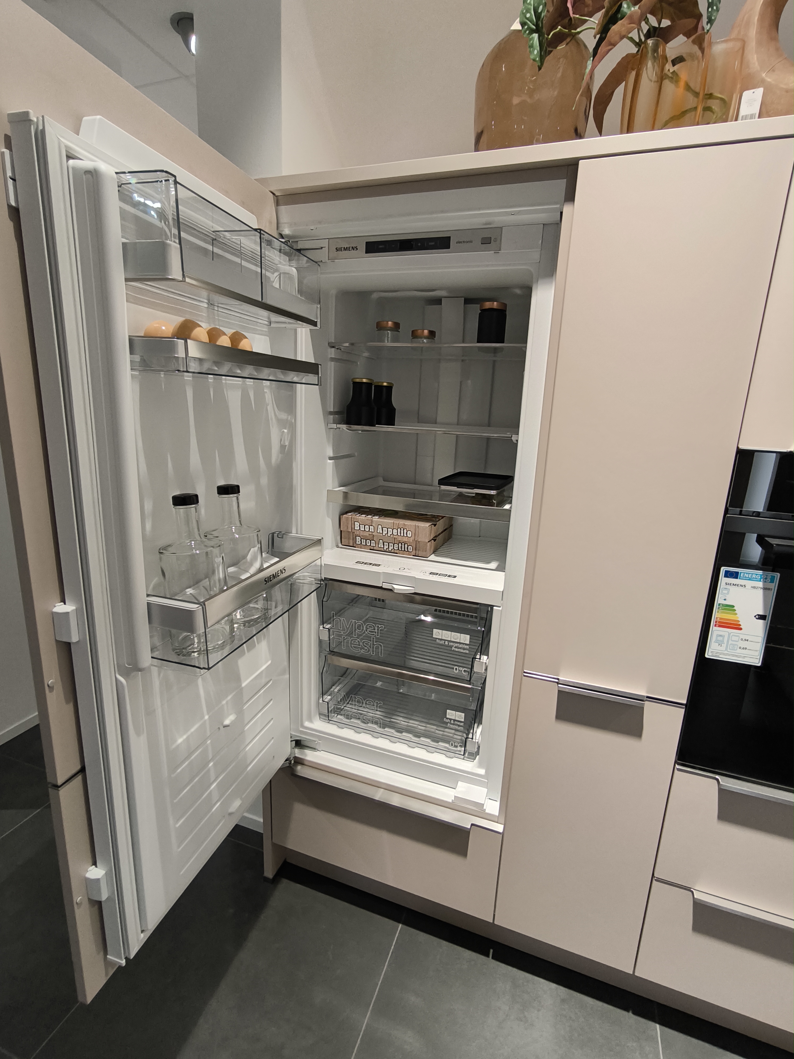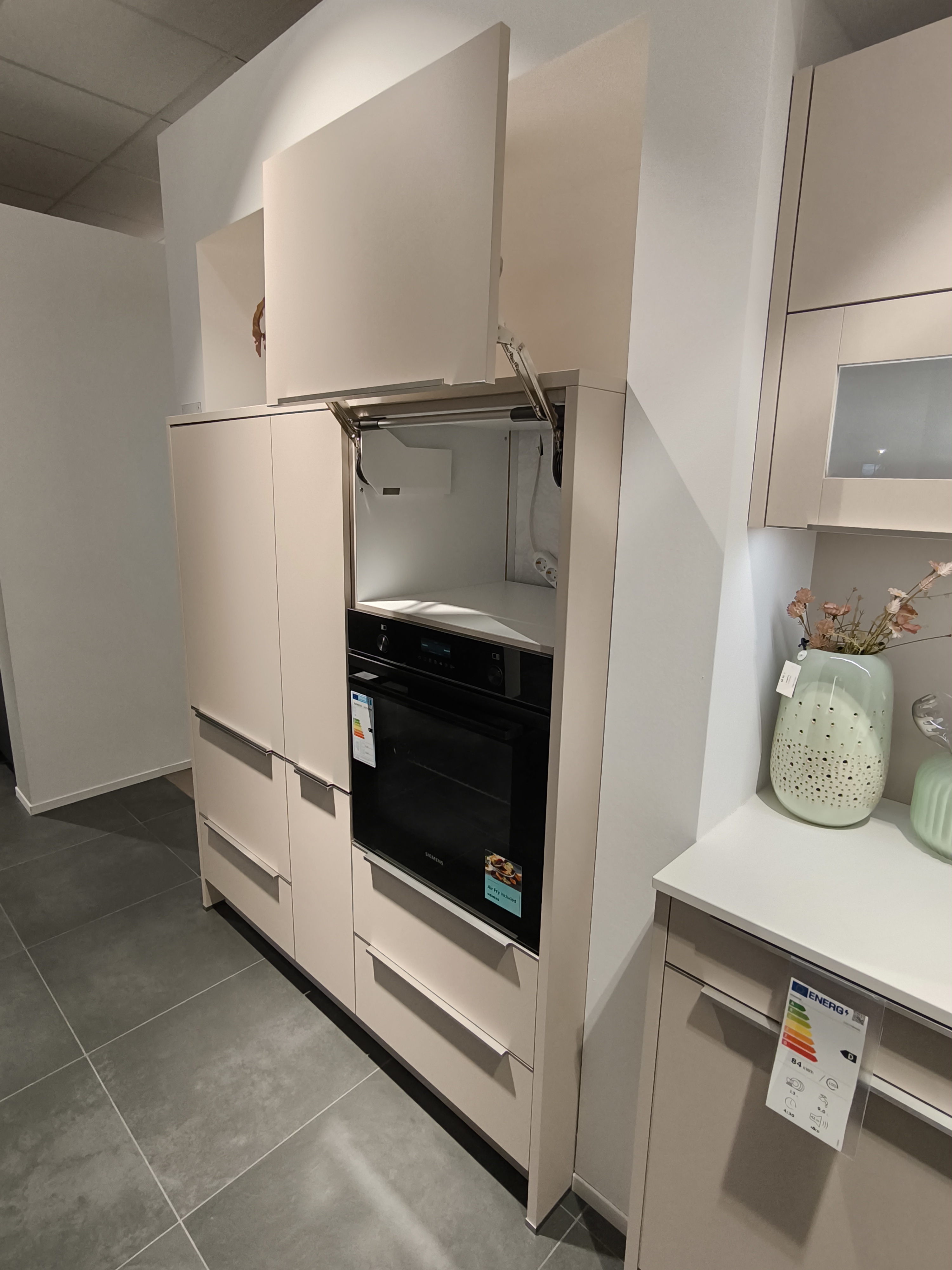 Die weiteren Highlights der Küche sind ein Backofen mit Air-Fryer Funktion, ein Kühlschrank mit 0°-Zone und ein Apothekerschrank für jede Menge Stauraum.