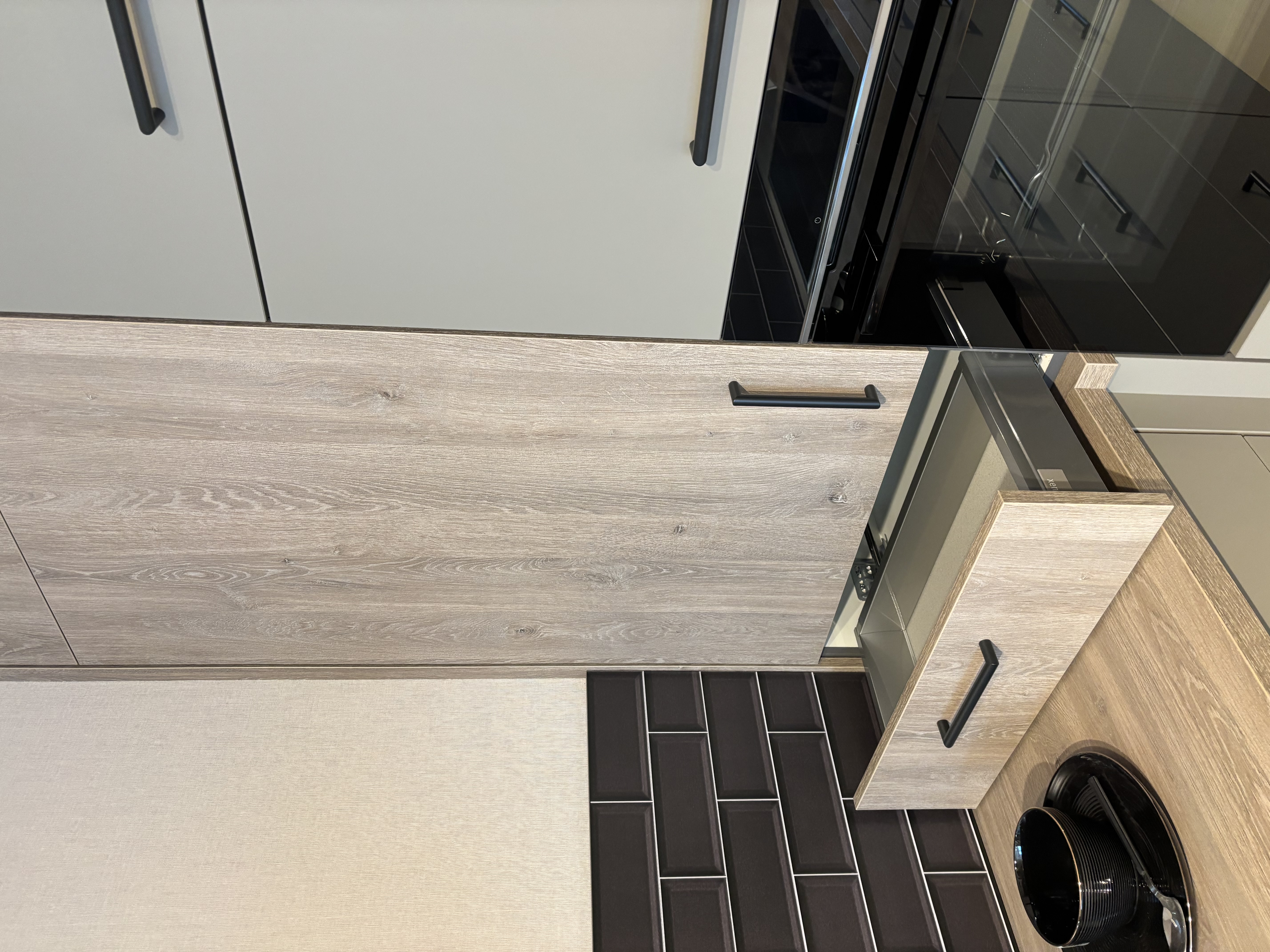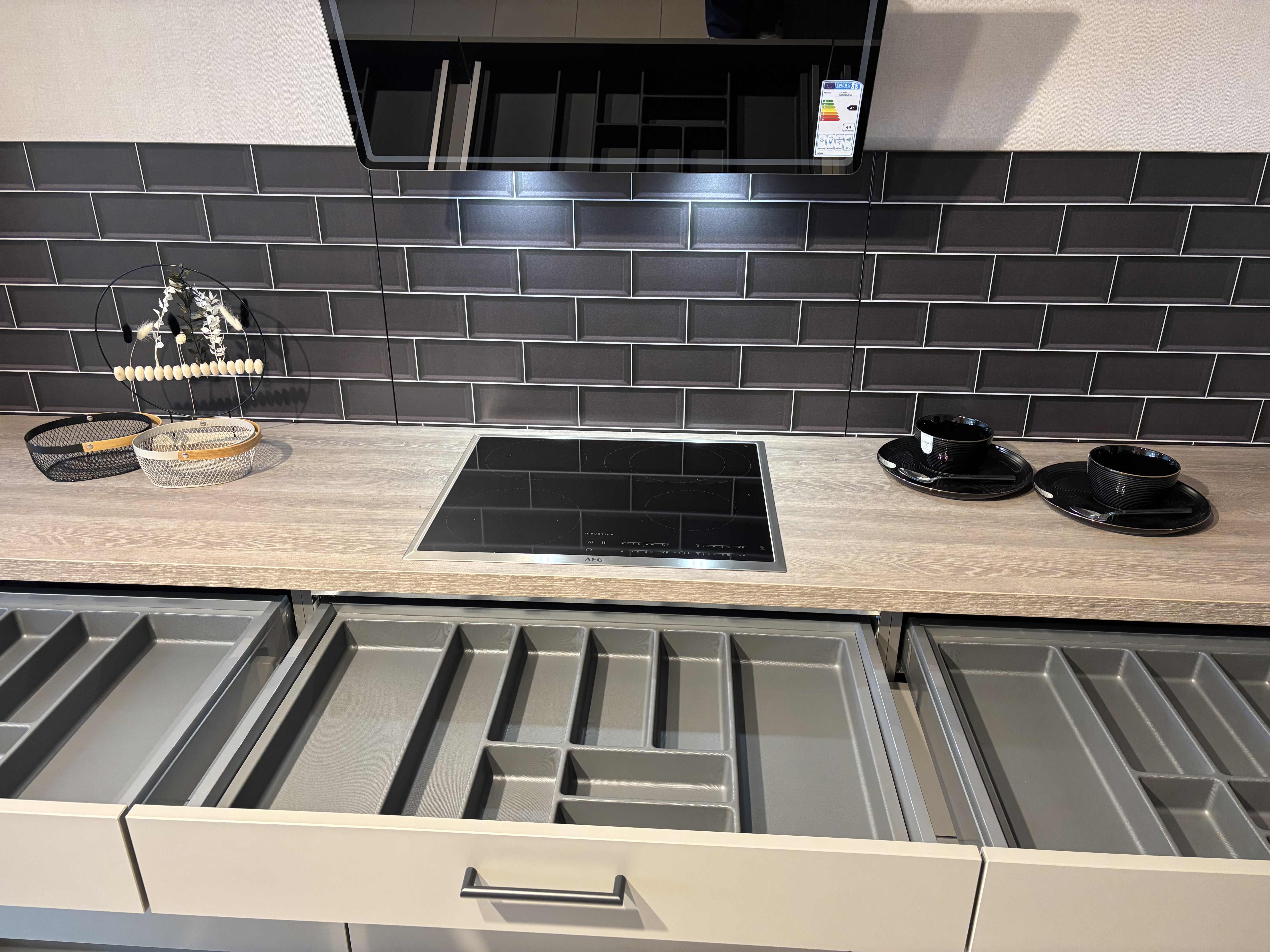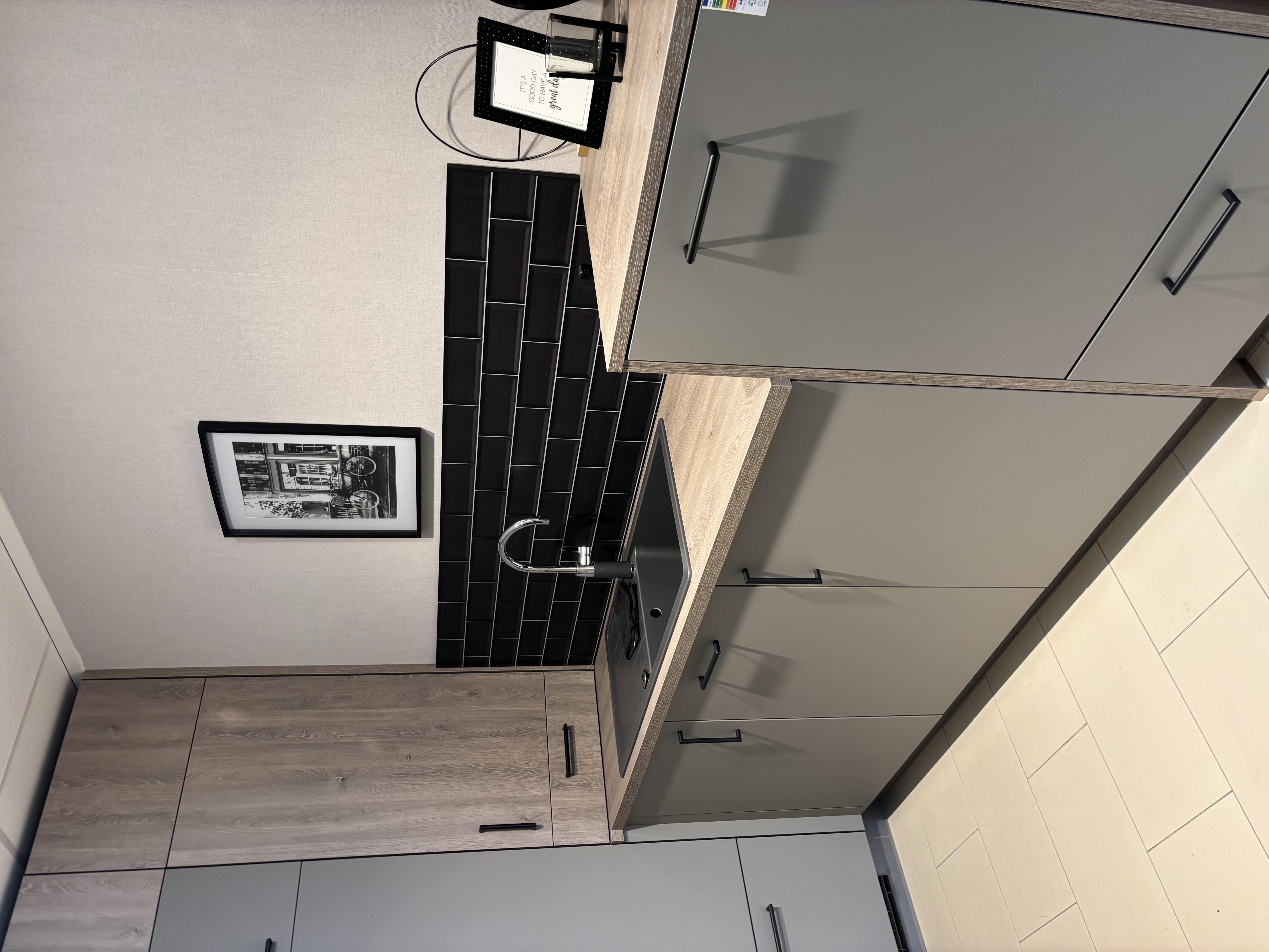 Die Spüle und Armatur in Silverstone fügen sich sehr gut ins Gesamtbild ein. Auch die schwarzen Griffe und die Nischenverkleidung im Metrofliesendekor lockern die Küche noch zusätzlich auf.