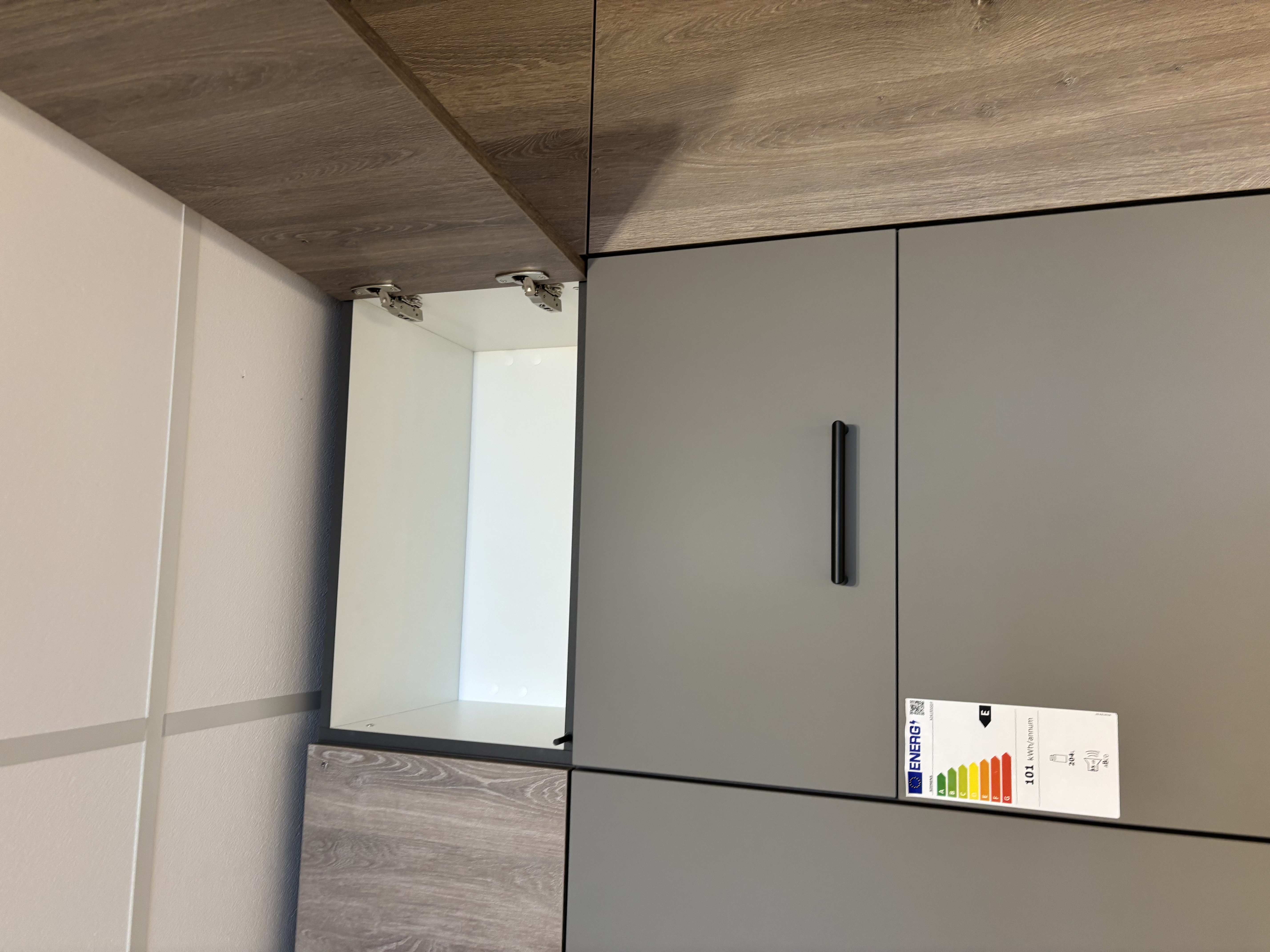 Diese deckenhoch geplante U-Küche in Kombination mit aktuellem Taupegrau und Eiche Bergamo bietet sehr viel Stauraum.
