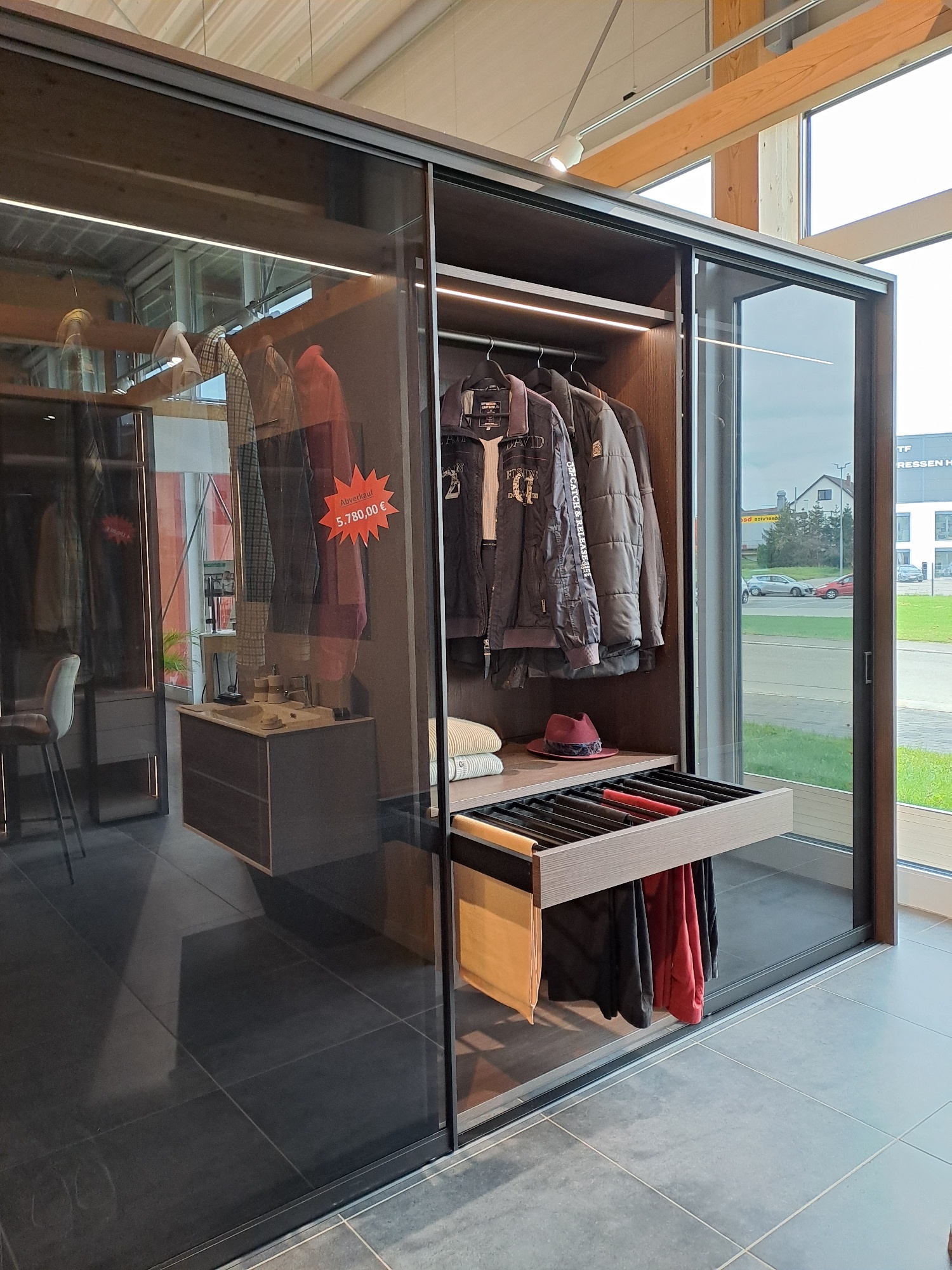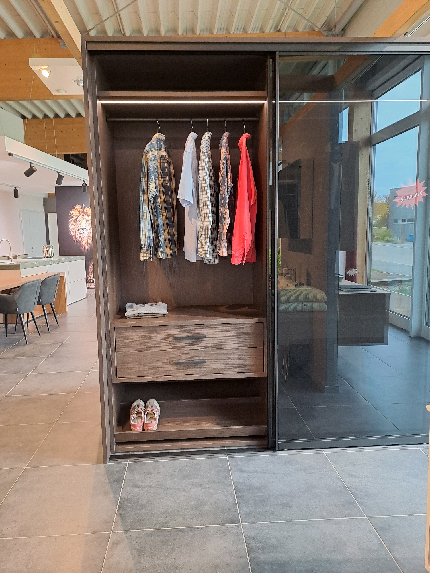 Am Boden ist dieser Schrankteil mit einem Schrägboden für Schuhe ausgestattet.