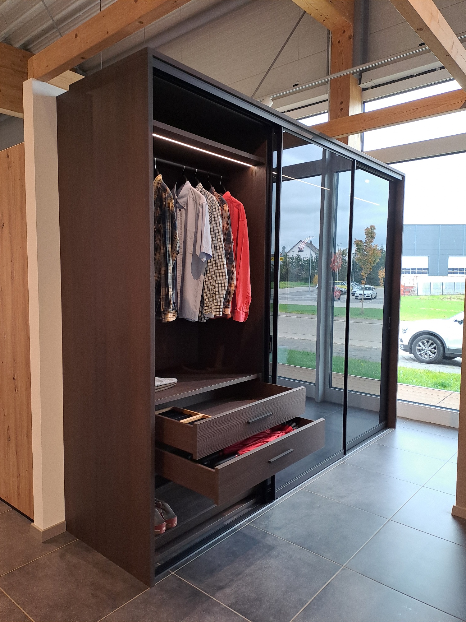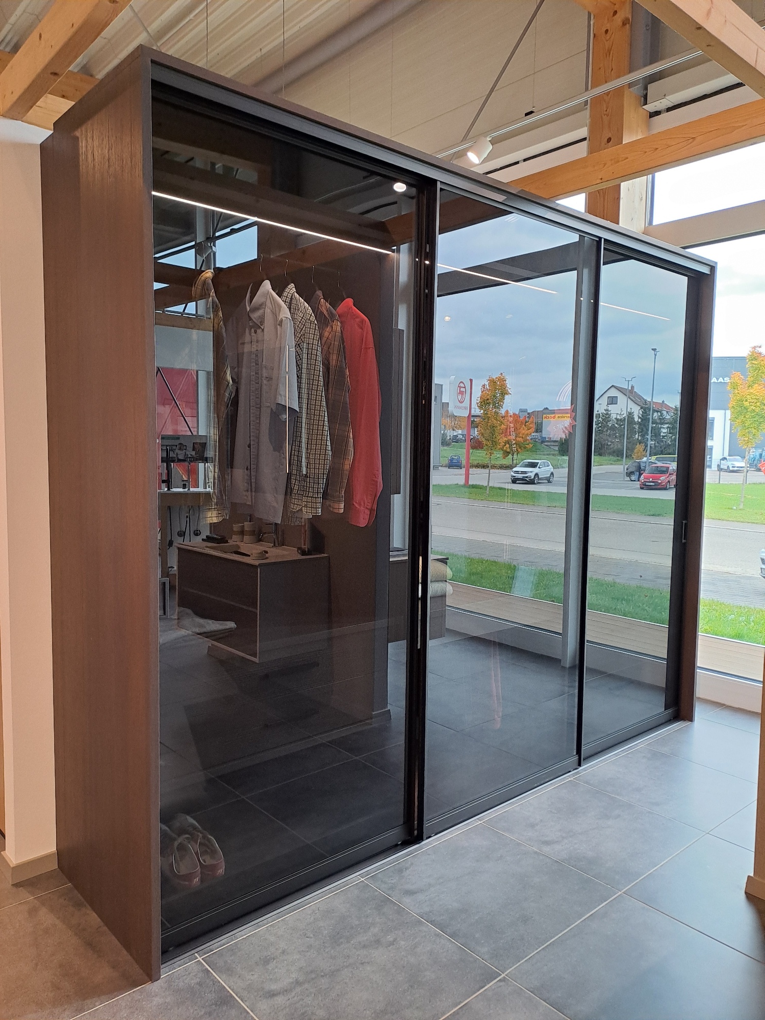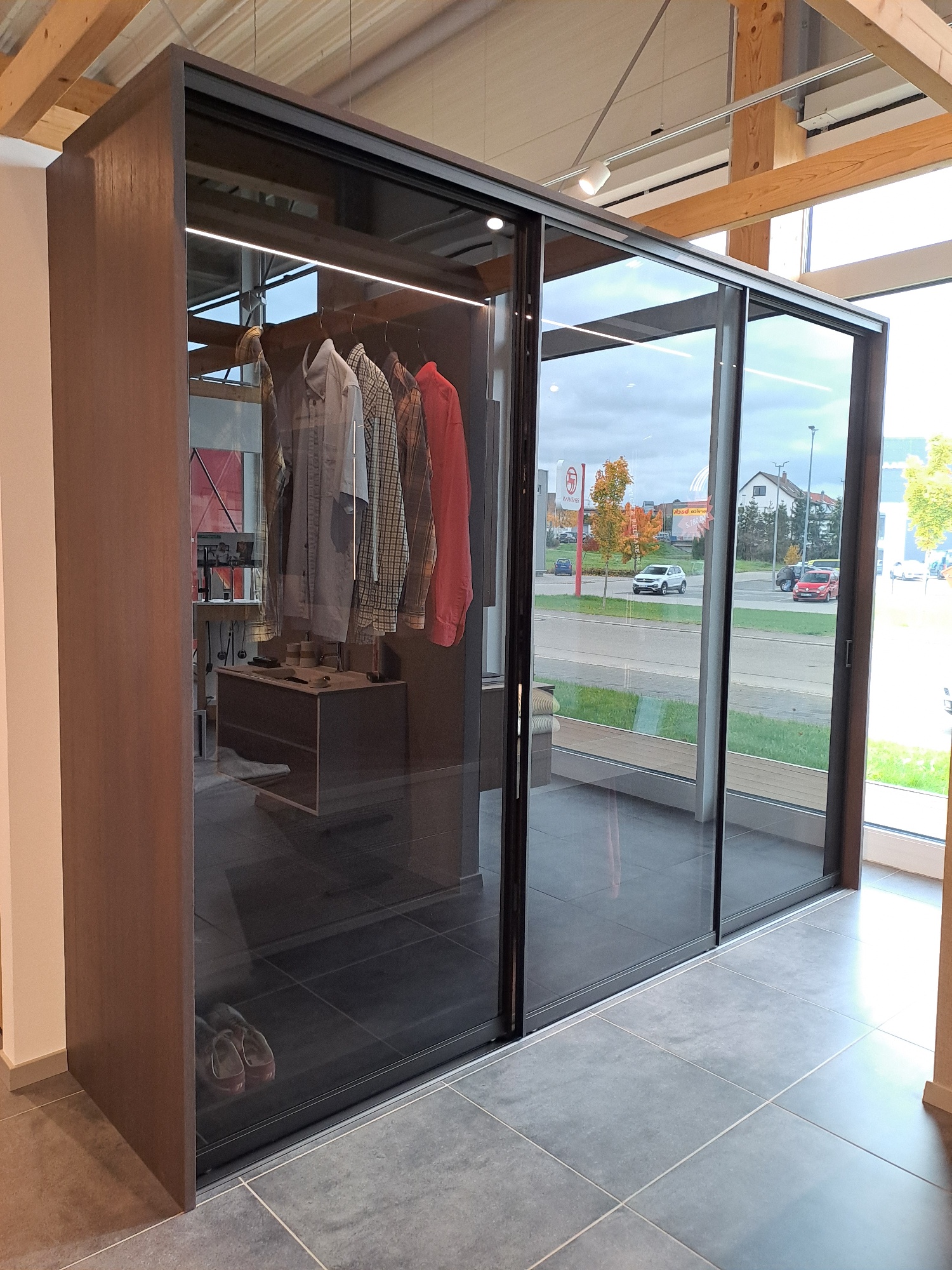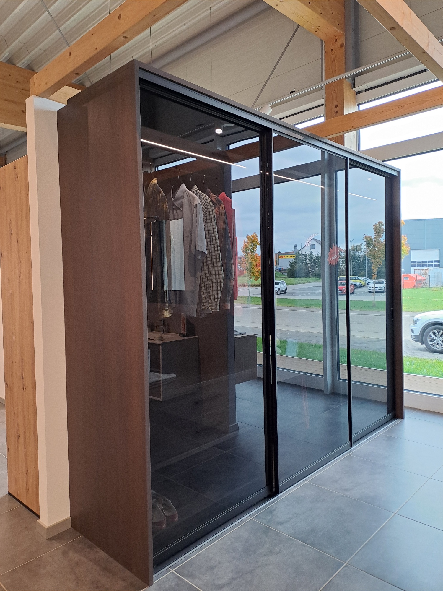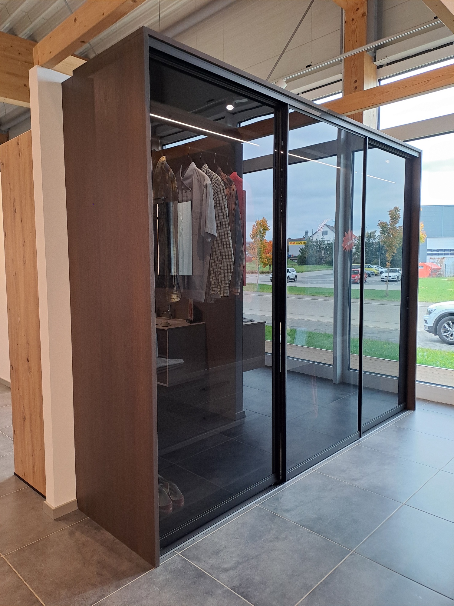Der Kleiderschrank mit Schiebe-/Gleittüren in dunklem Pinienholzdekor mit grauem Parsolglas und pulverbeschichtetem Profil in Schwarz matt mit beleuchteten LED-Fachböden verleiht jedem Schlafzimmer ein wohnliches Ambiente.