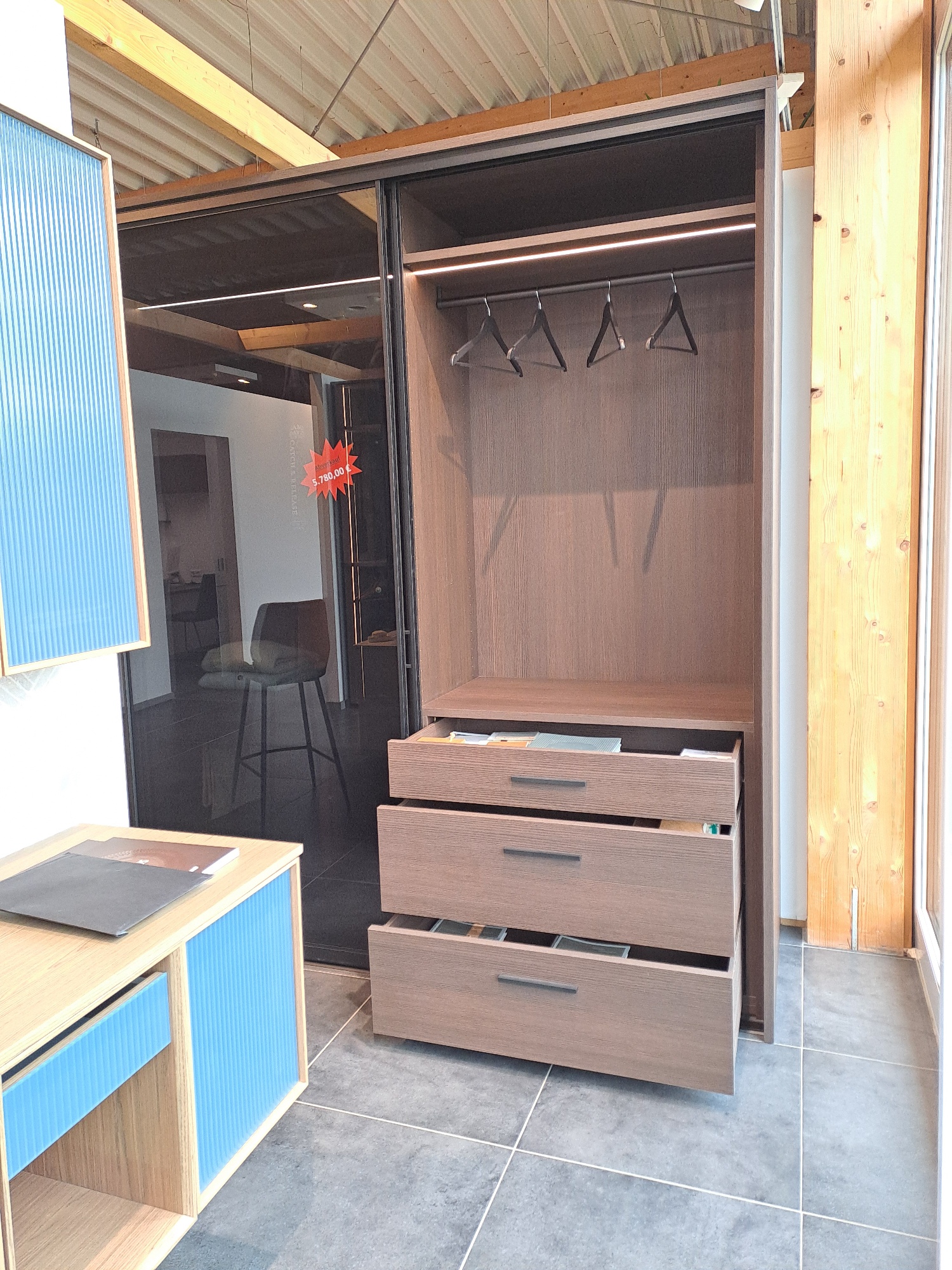 Die Schrankausstattung links besteht aus zwei Schubkästen in dunklem Pinienholzdekor.