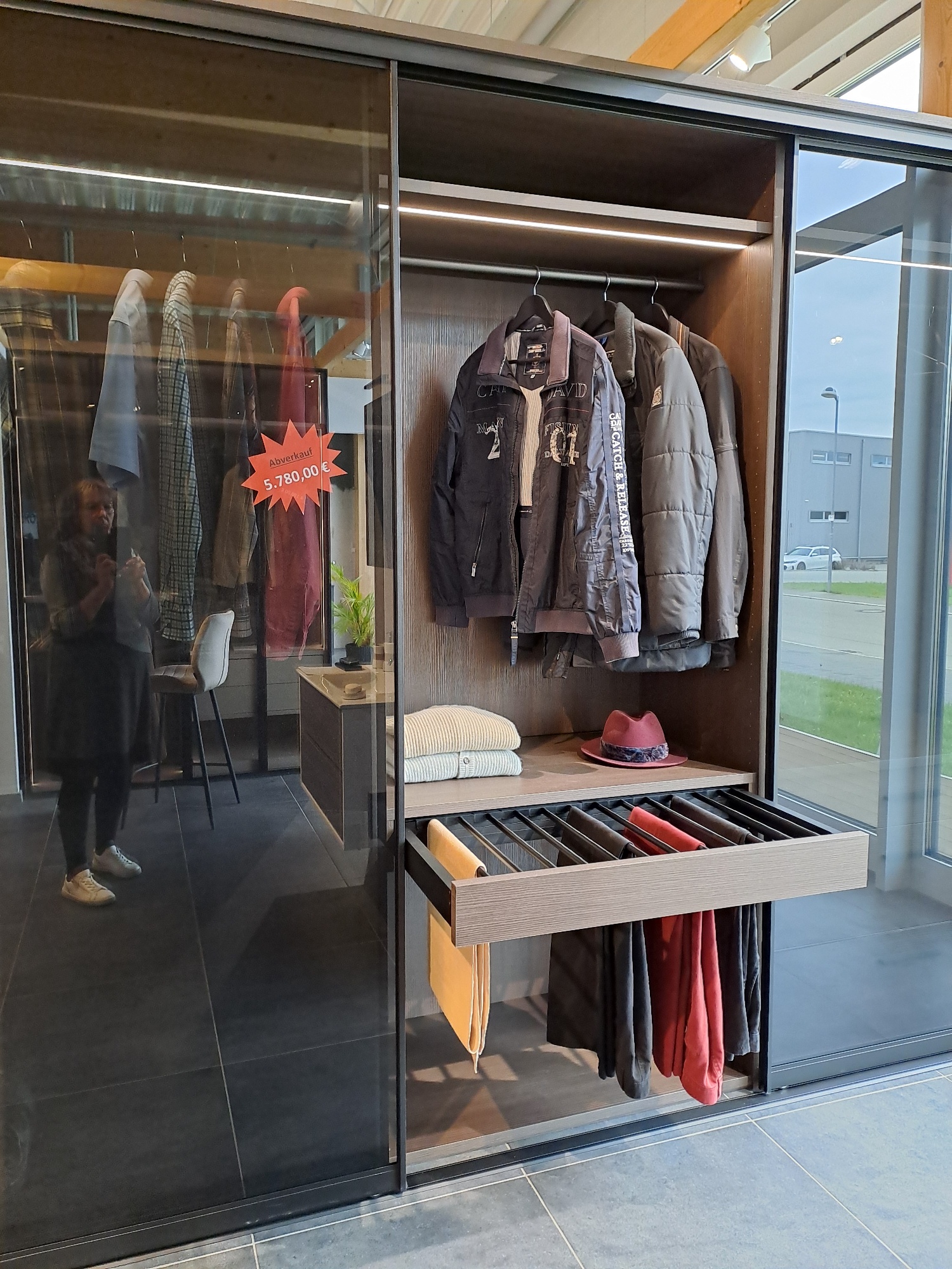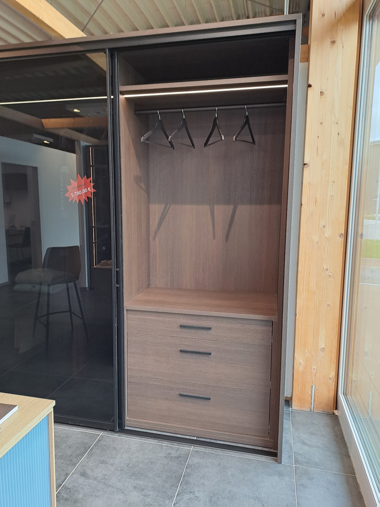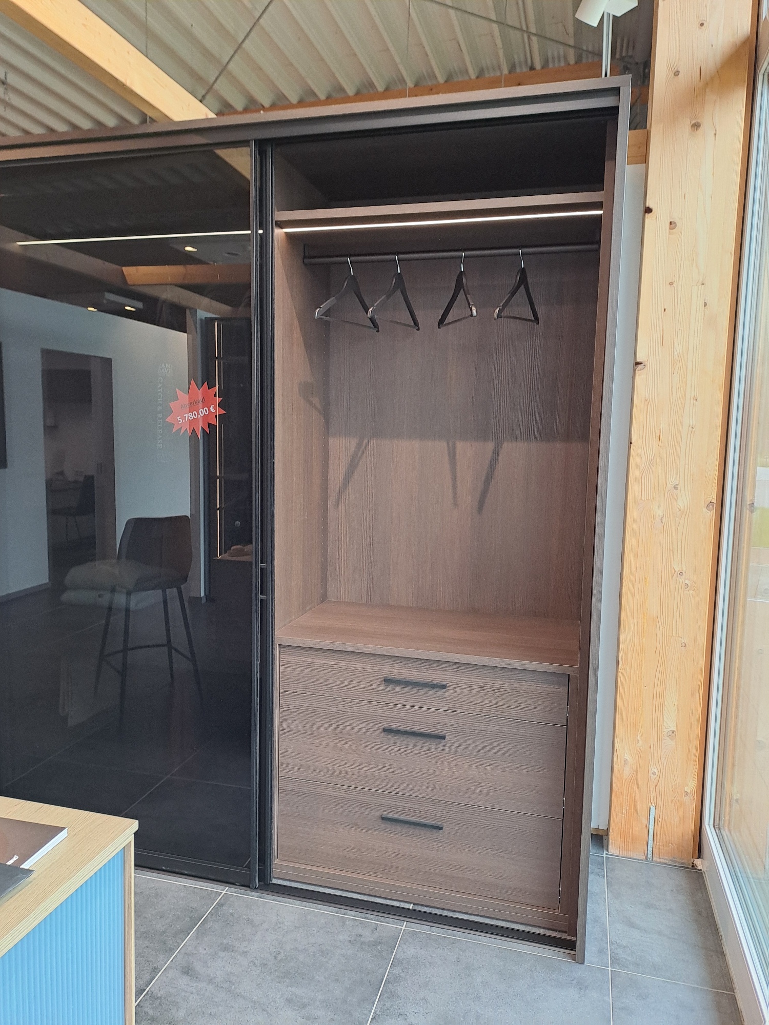 Darüber eine Kleiderstange und ein Fachboden in Pinie dunkel.