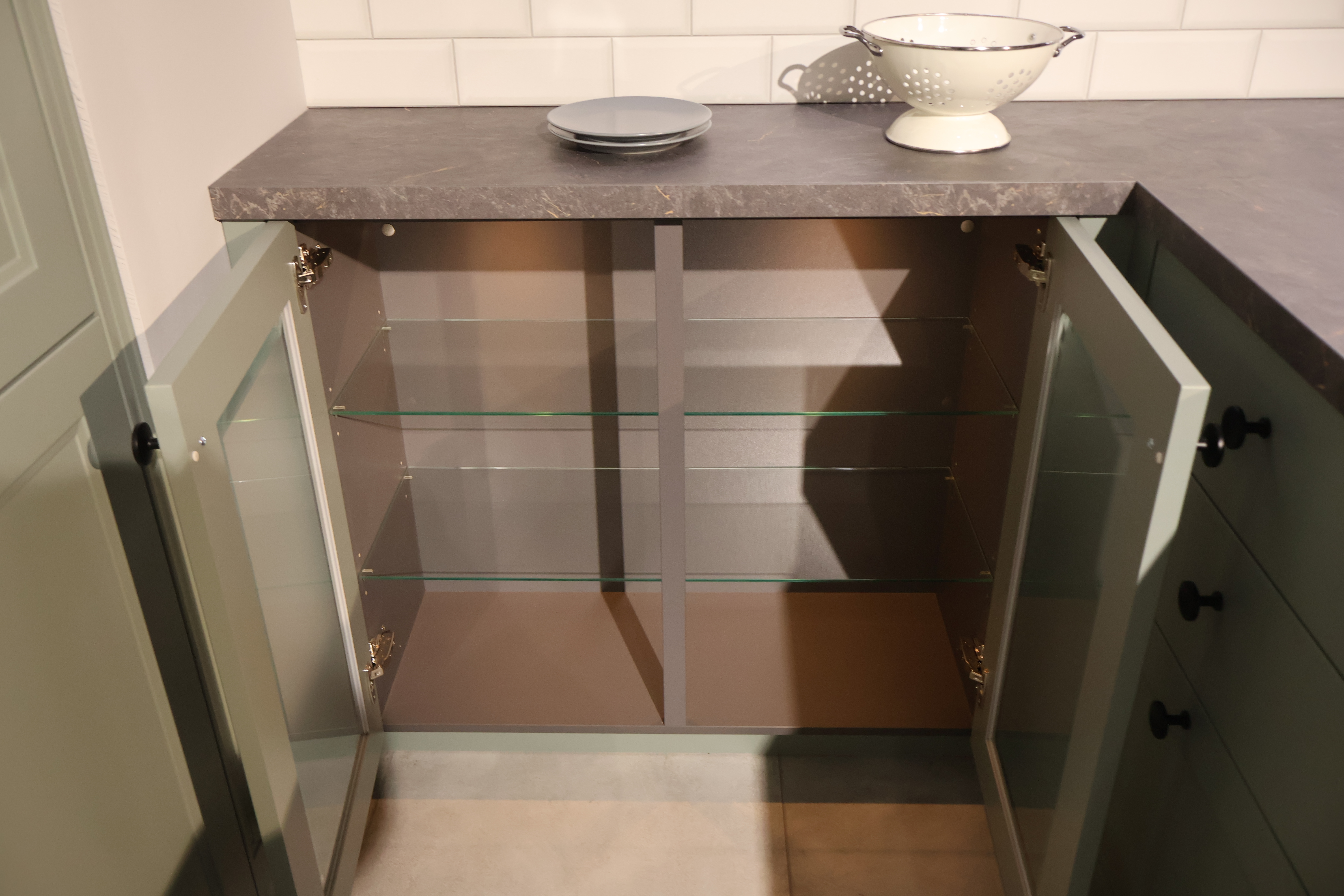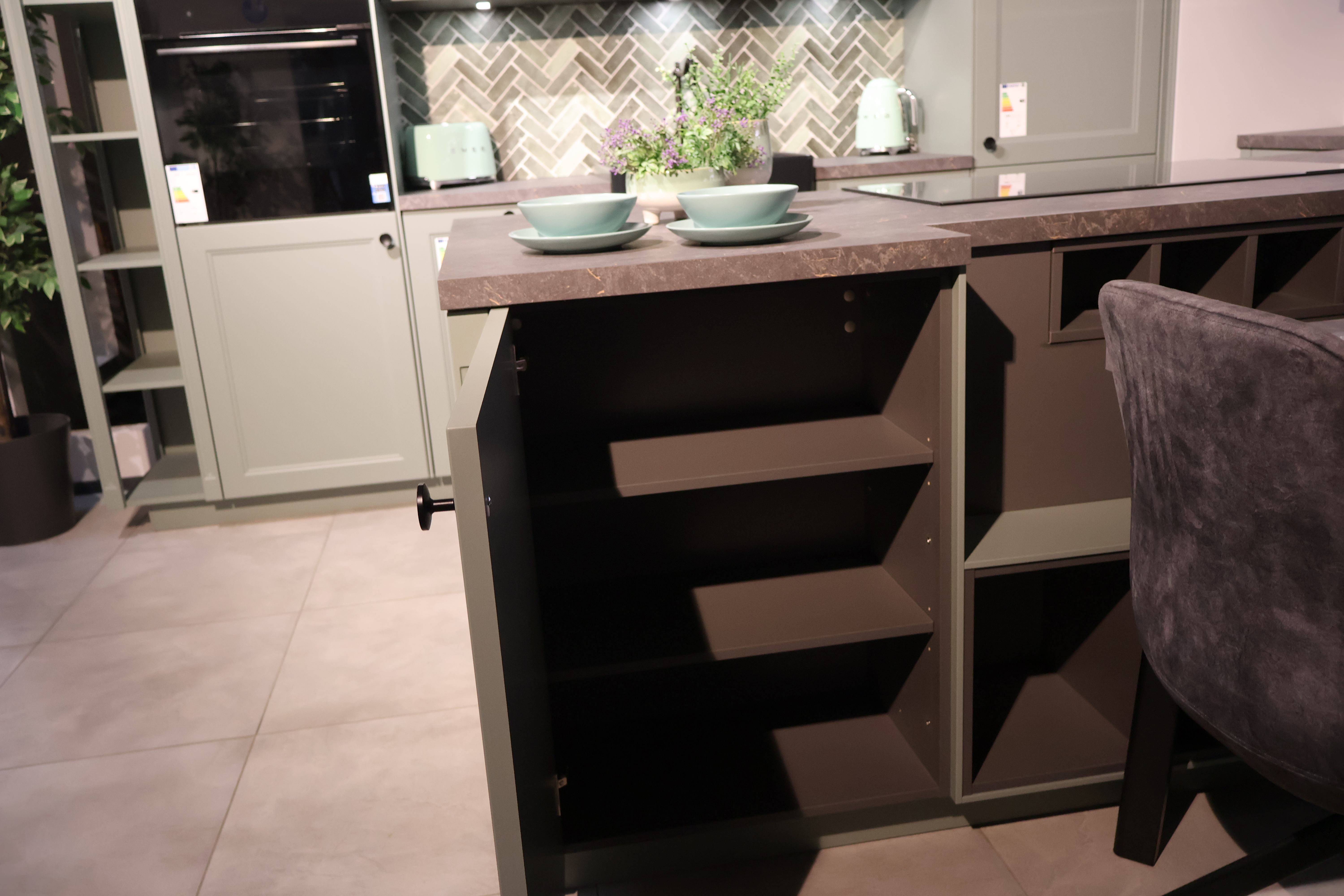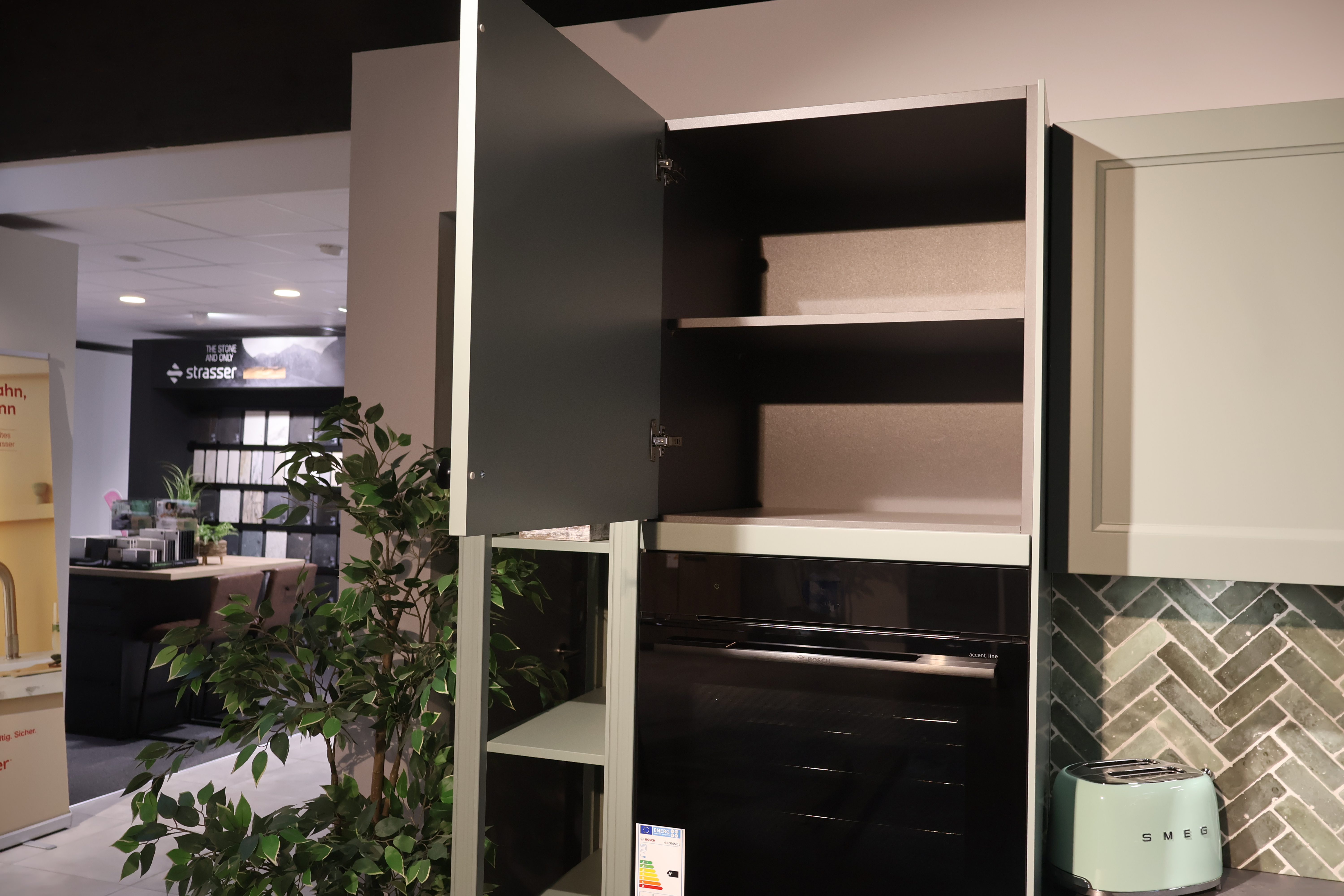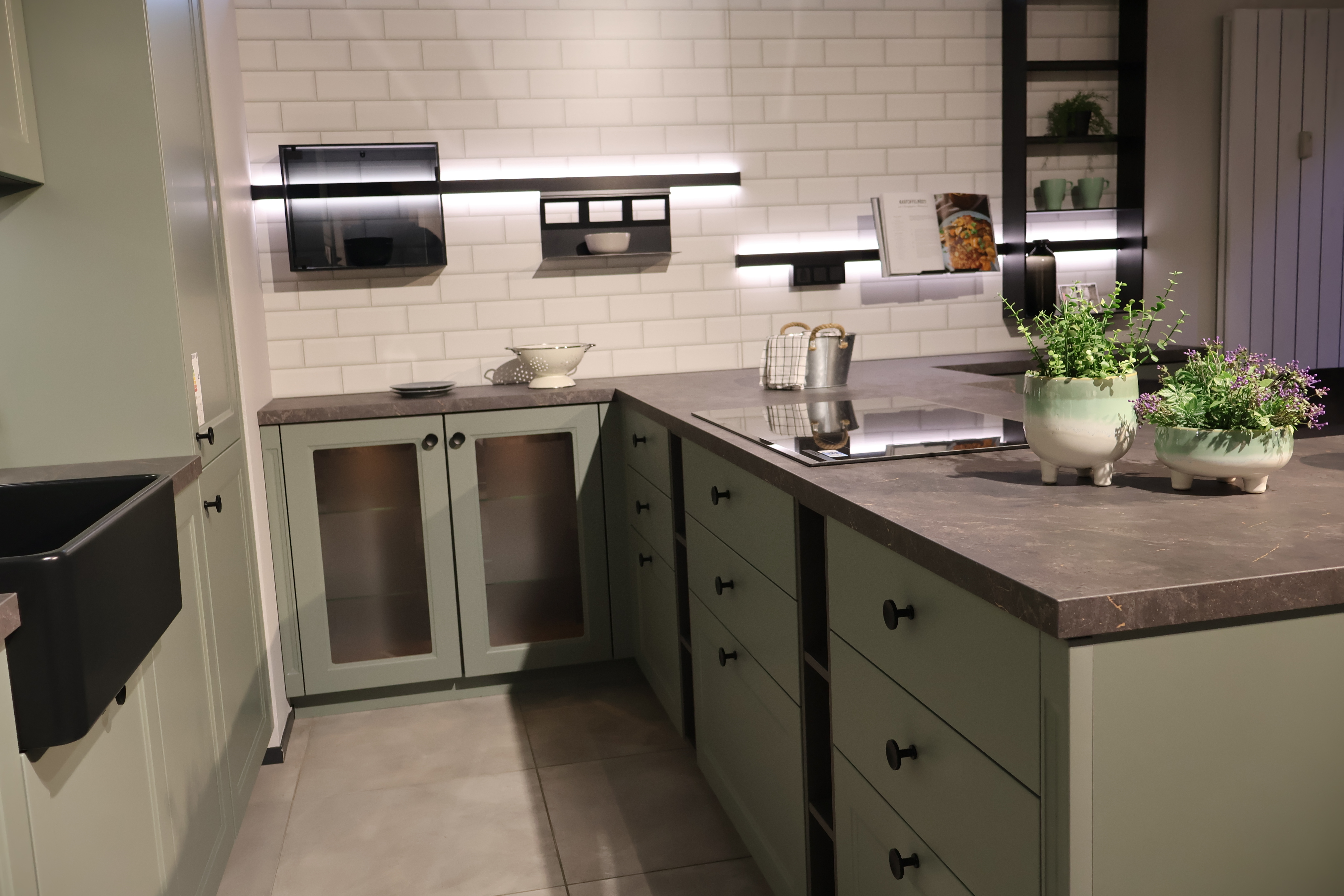 Diese Küche ist ein echtes Design-Statement für alle, die das Besondere suchen. In einem eleganten, matten Lacklaminat Schlif gehalten, kombiniert sie den gemütlichen Landhaus-Look mit einer klaren, modernen Linienführung. Die dunkle Arbeitsplatte in Schiefer-Optik und die kontrastreichen schwarzen Akzente verleihen der Küche eine hochwertige und zeitgemäße Note. Neben den klassischen Ober- und Unterschränken bietet ein offenes Seitenregal Platz für Kräuter, Kochbücher oder Dekoration. Diese Küche strahlt Ruhe und Natürlichkeit aus und ist der perfekte Mittelpunkt für ein stilbewusstes Zuhause.