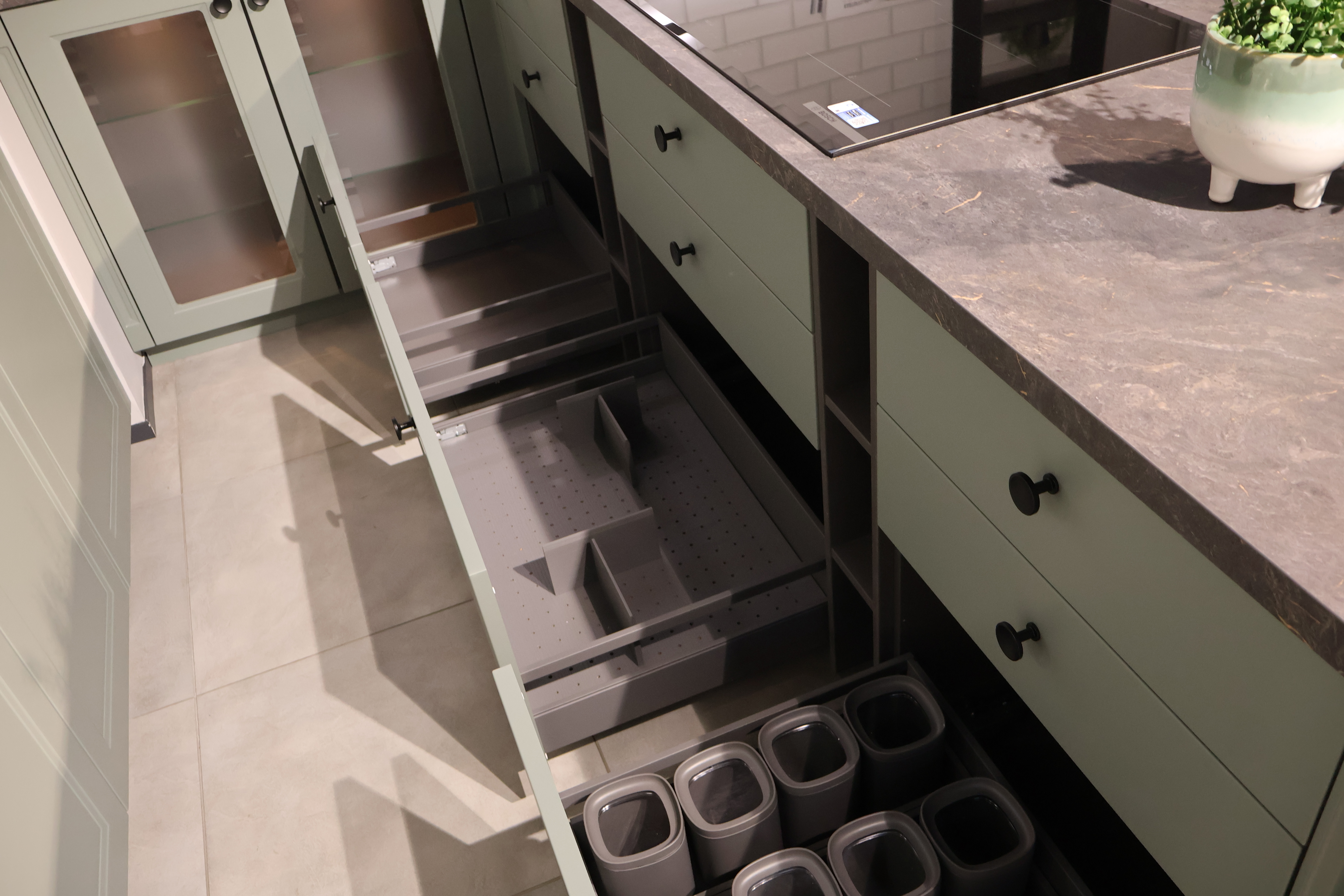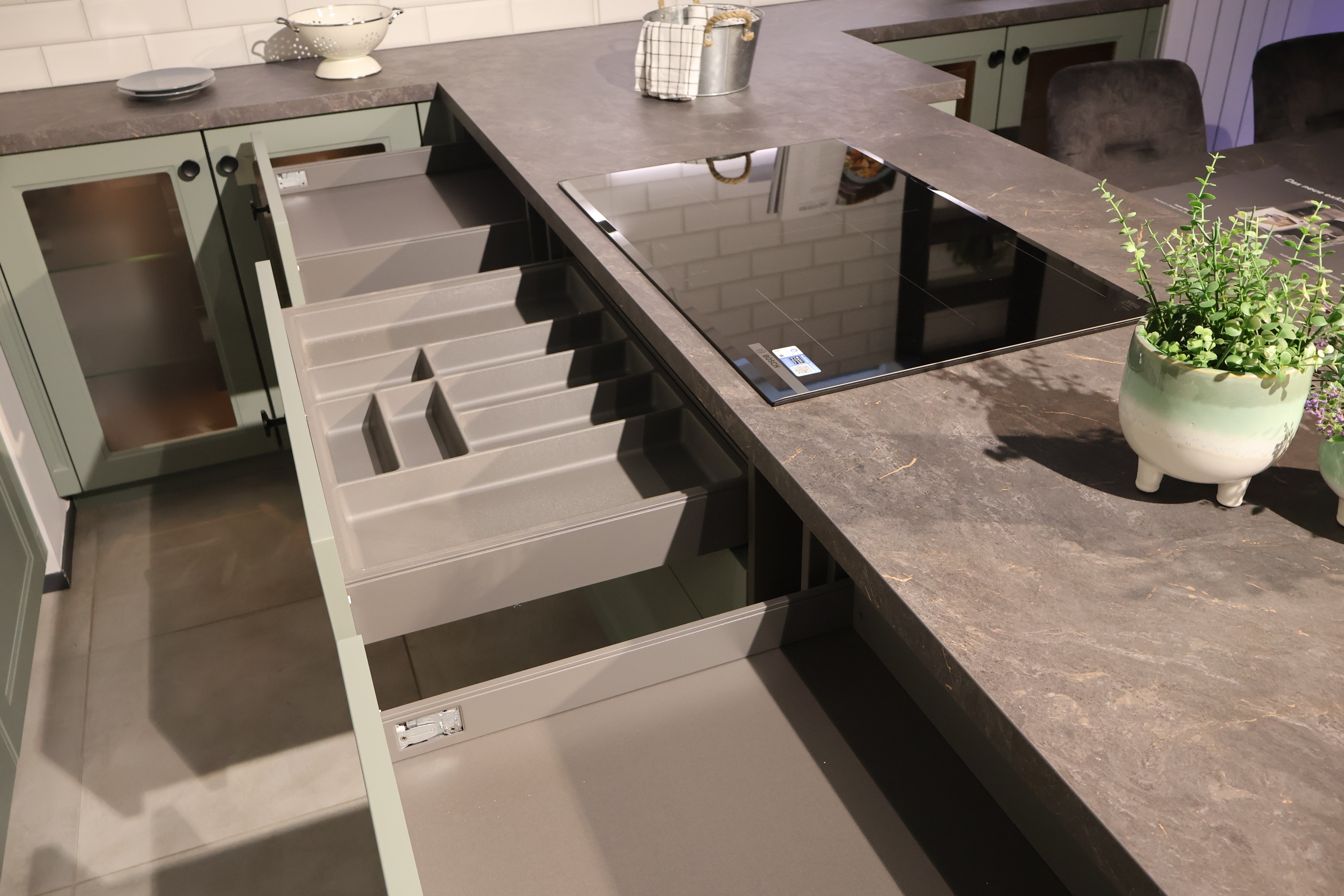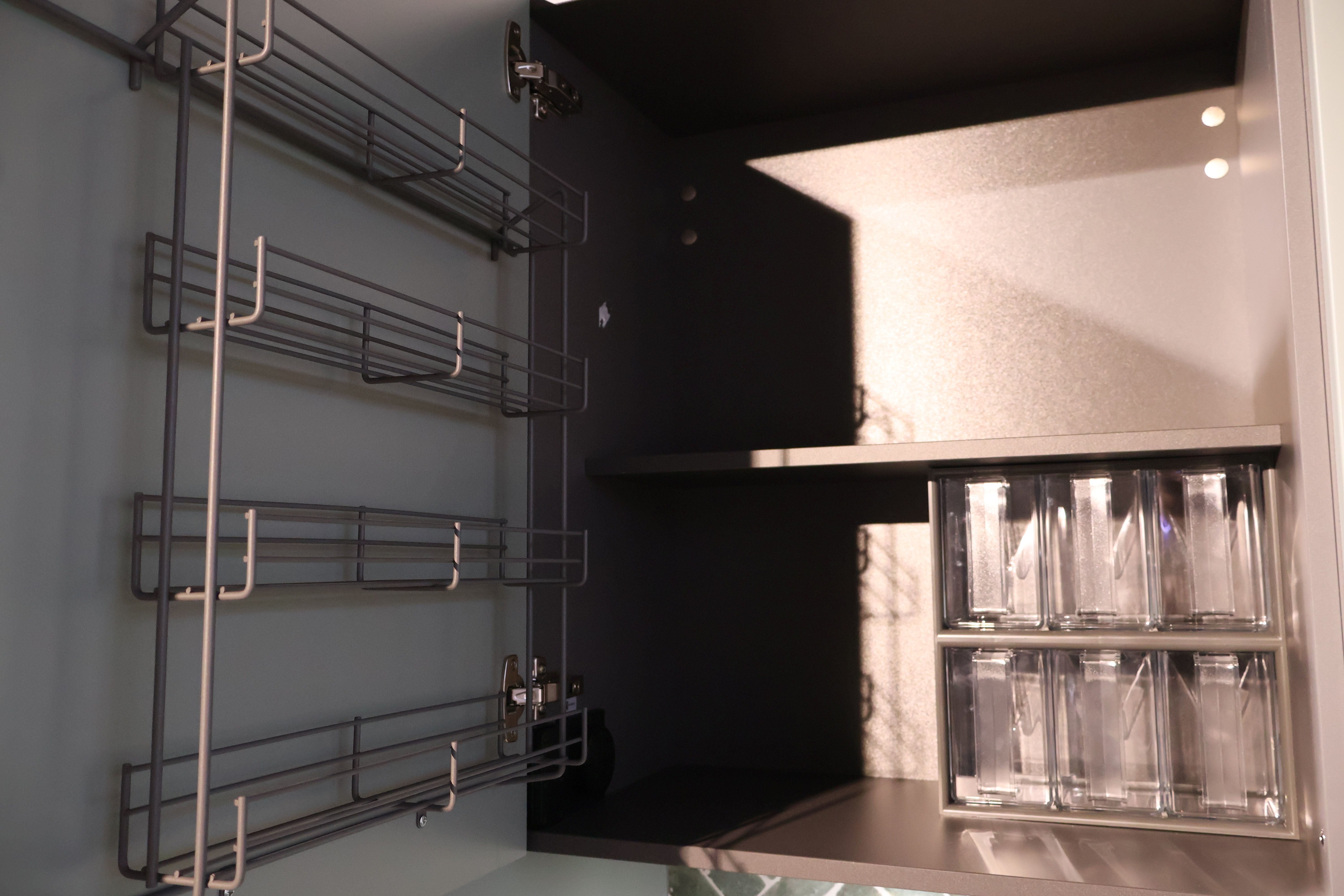 Diese Küche ist ein echtes Design-Statement für alle, die das Besondere suchen. In einem eleganten, matten Lacklaminat Schlif gehalten, kombiniert sie den gemütlichen Landhaus-Look mit einer klaren, modernen Linienführung. Die dunkle Arbeitsplatte in Schiefer-Optik und die kontrastreichen schwarzen Akzente verleihen der Küche eine hochwertige und zeitgemäße Note. Neben den klassischen Ober- und Unterschränken bietet ein offenes Seitenregal Platz für Kräuter, Kochbücher oder Dekoration. Diese Küche strahlt Ruhe und Natürlichkeit aus und ist der perfekte Mittelpunkt für ein stilbewusstes Zuhause.