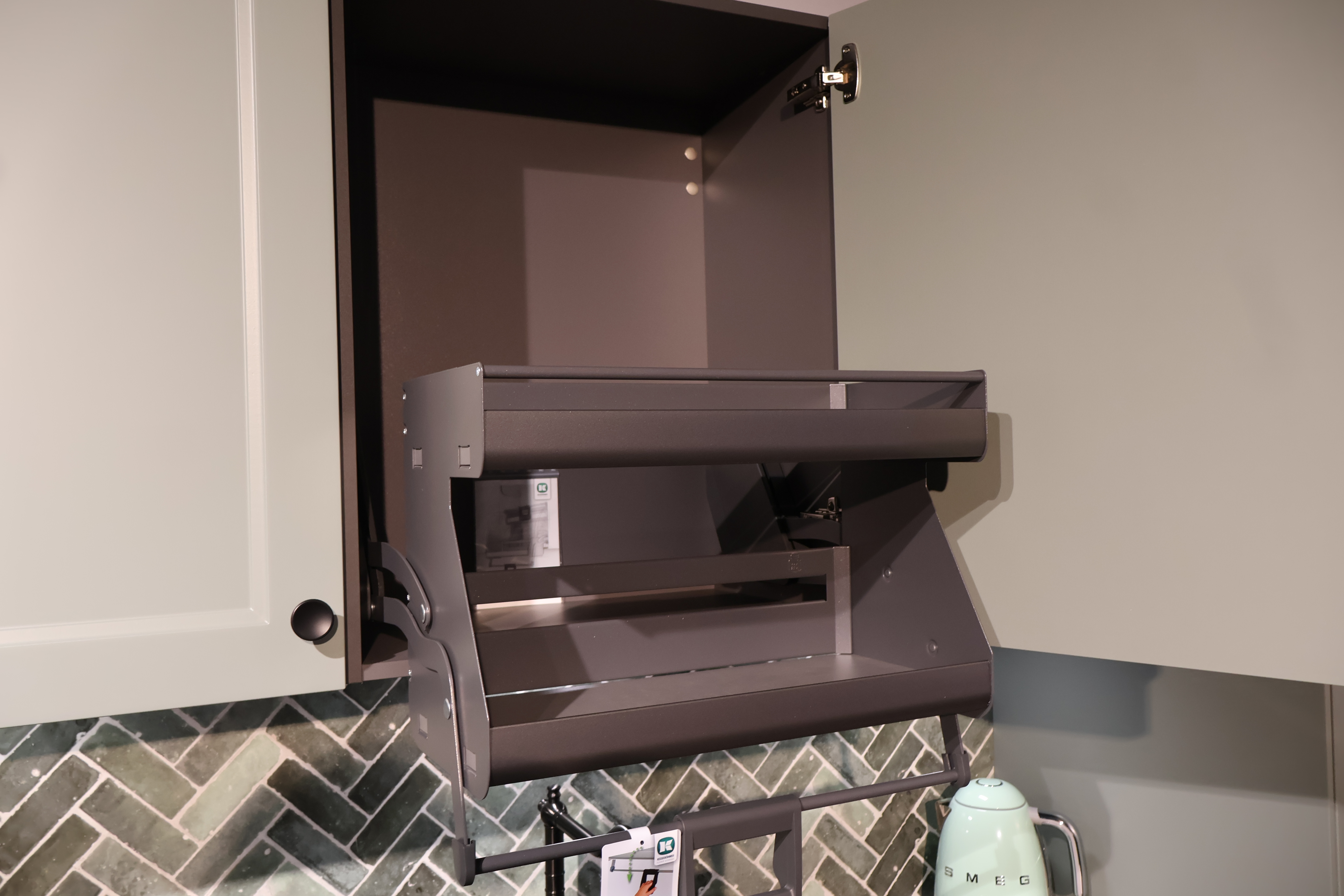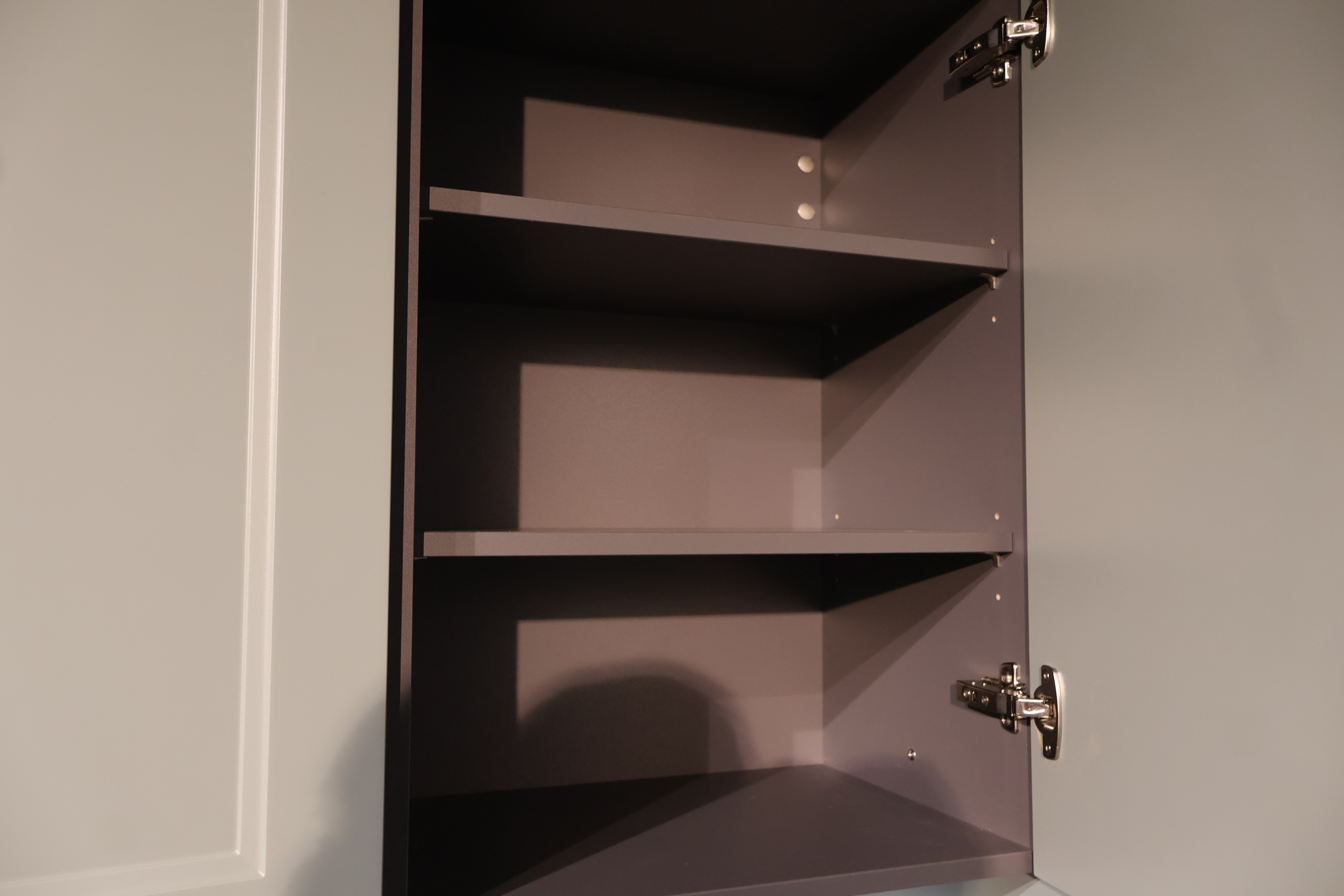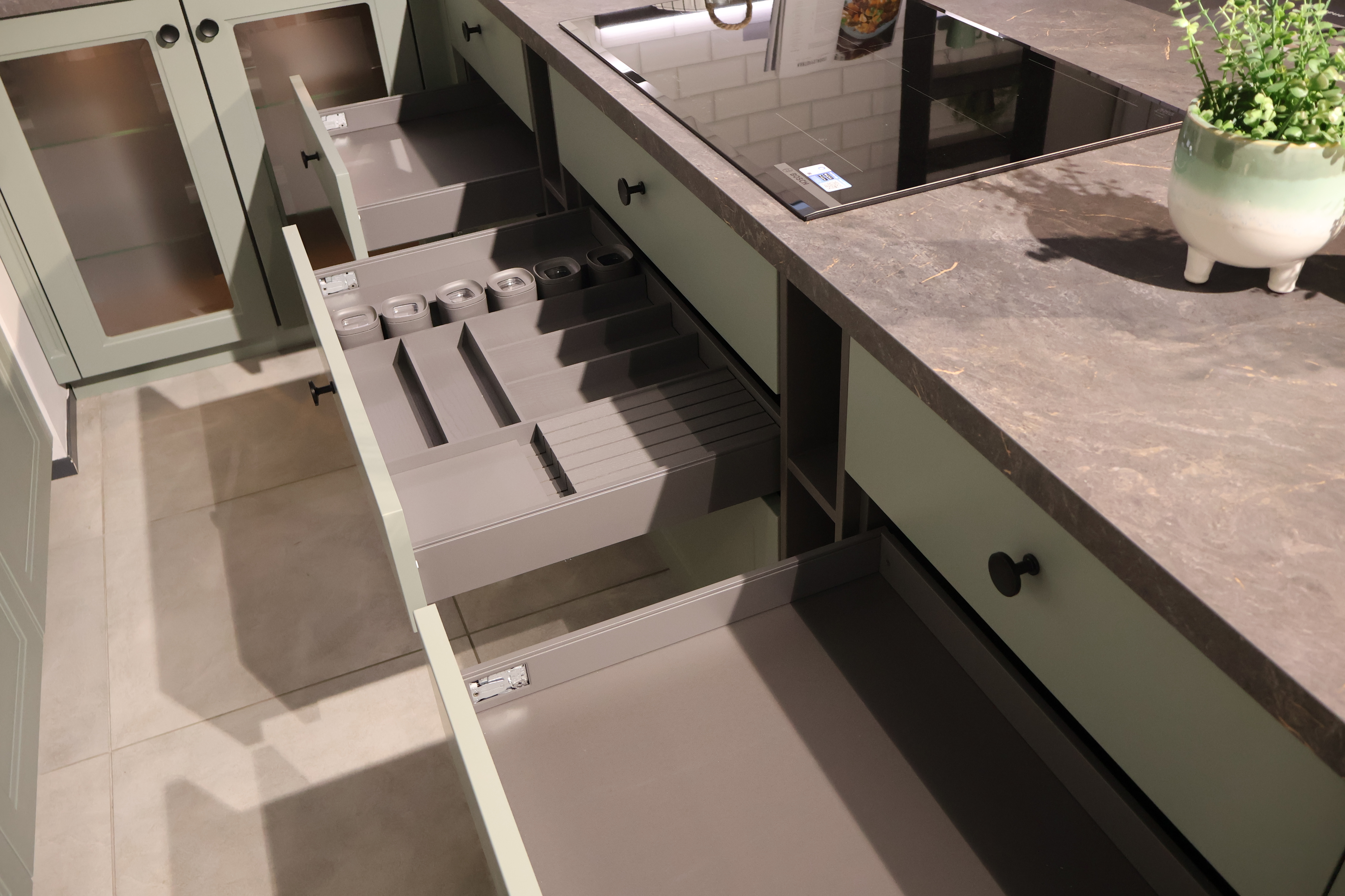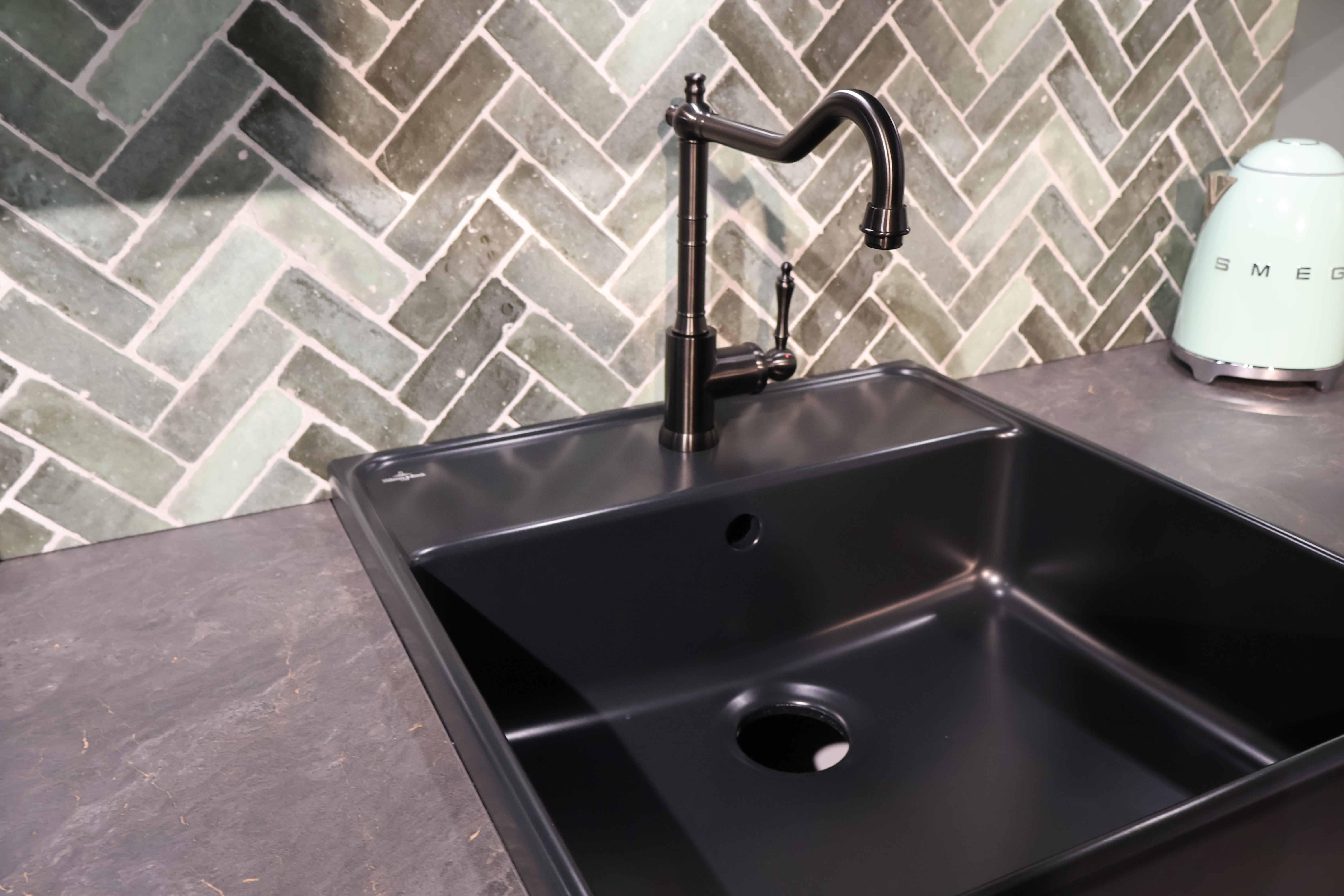 Diese Küche ist ein echtes Design-Statement für alle, die das Besondere suchen. In einem eleganten, matten Lacklaminat Schlif gehalten, kombiniert sie den gemütlichen Landhaus-Look mit einer klaren, modernen Linienführung. Die dunkle Arbeitsplatte in Schiefer-Optik und die kontrastreichen schwarzen Akzente verleihen der Küche eine hochwertige und zeitgemäße Note. Neben den klassischen Ober- und Unterschränken bietet ein offenes Seitenregal Platz für Kräuter, Kochbücher oder Dekoration. Diese Küche strahlt Ruhe und Natürlichkeit aus und ist der perfekte Mittelpunkt für ein stilbewusstes Zuhause.
