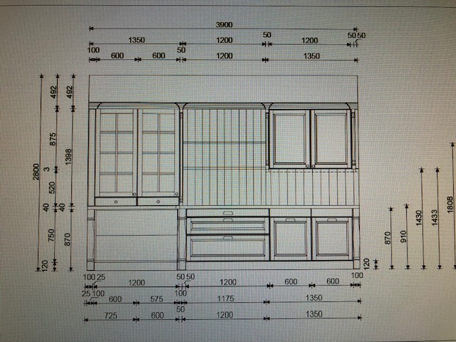 Angeboten wird eine Küche in grau / Eiche bestehend aus einer ca. 3,90m breiten Einheit mit Vitrinenschrank, Rückwandbuffet und Hängeschrank, einer 2,50m breiten Einheit mit Hoch- und Geräteschränken sowie einer ca. 2,00 x 1,00m großen Kücheninsel mit Esse und angrenzendem Essbereich für drei Personen.