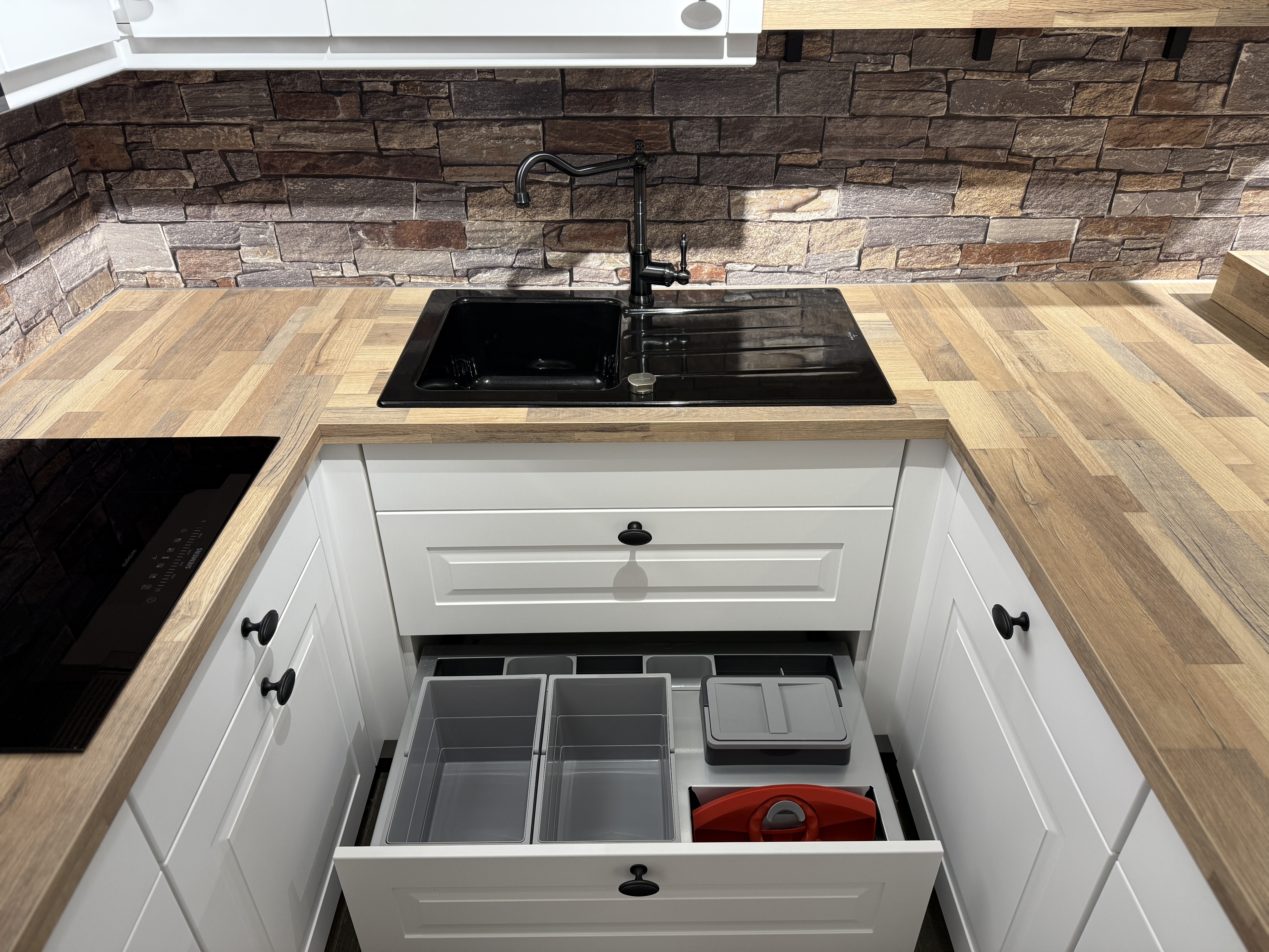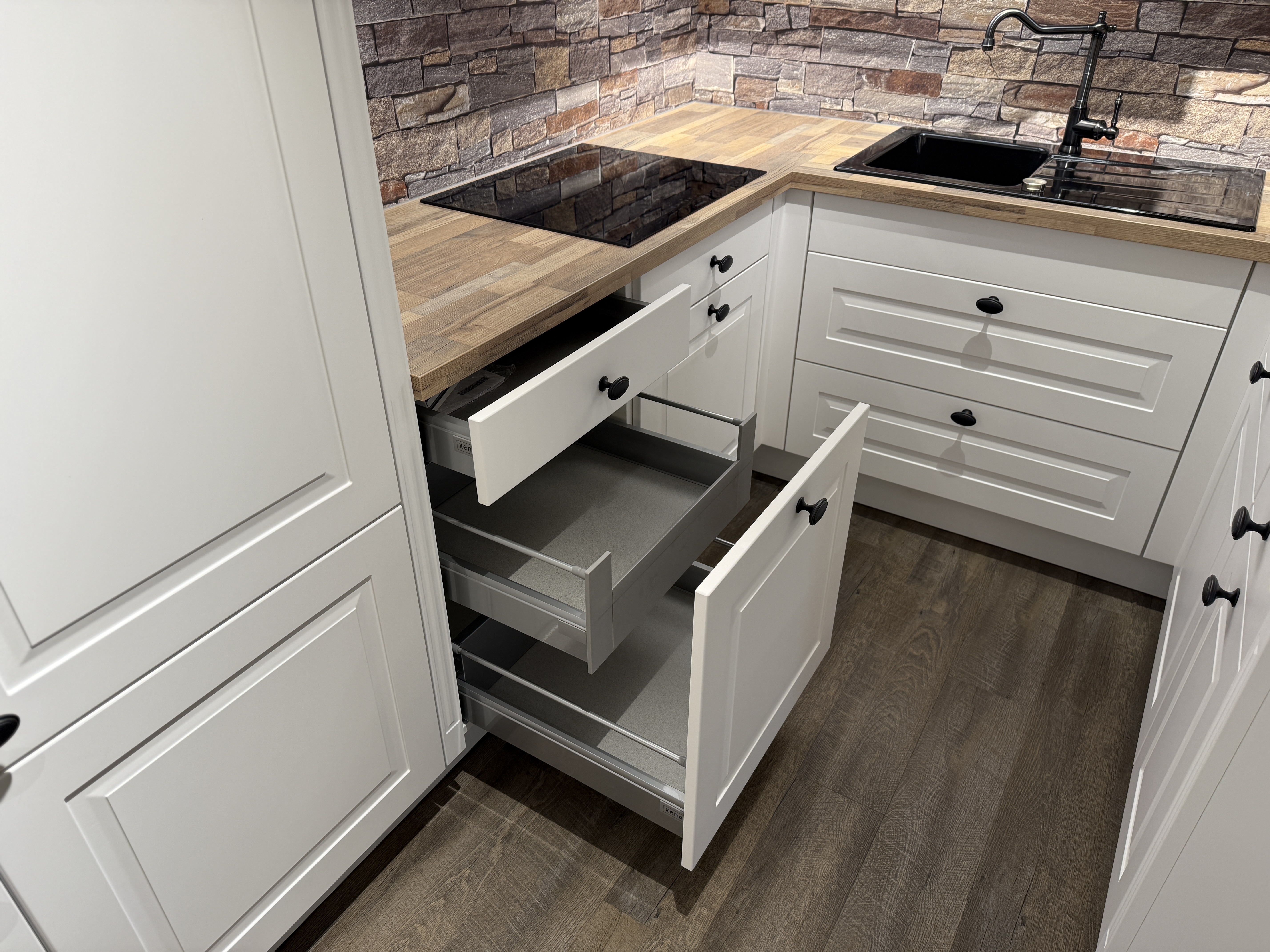 Diese wunderschöne Einbauküche im klassischen Landhausstil verbindet zeitloses Design mit moderner Funktionalität. Die weißen Fronten mit edlen Kassettenrahmen und die Holzarbeitsplatte verleihen der Küche eine warme, gemütliche Ausstrahlung.