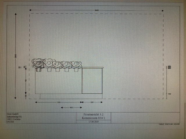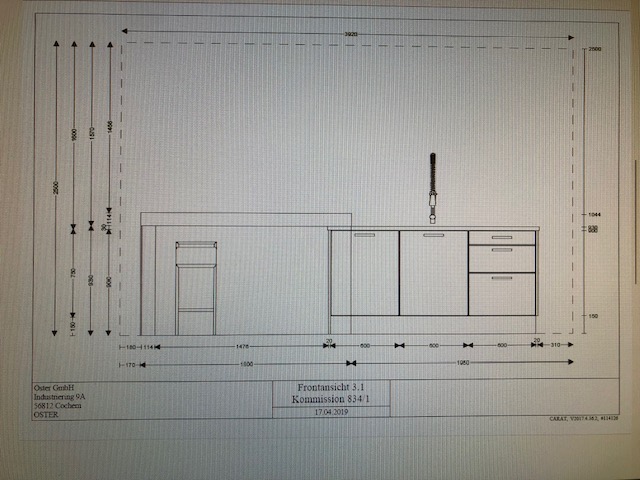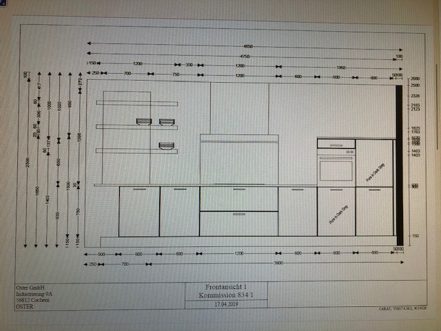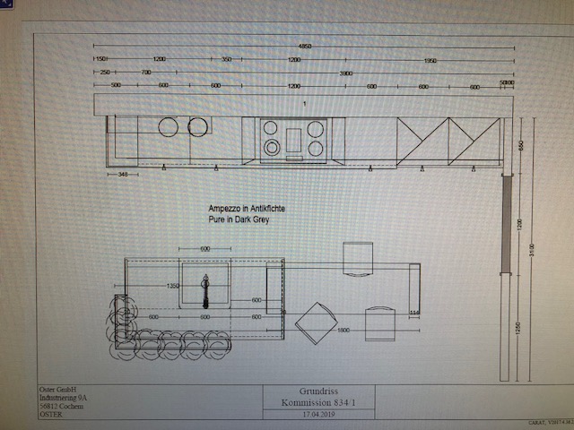 Es handelt sich um eine 4,60m breite Rückwandeinheit mit zwei halbhohen Geräteschränken, einer Regaleinheit sowie einer 1,20m breiten Kochstelle mit Schubschränken.