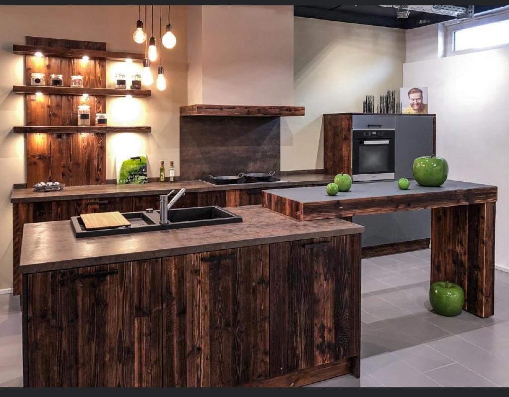 Angeboten wird eine wunderschöne und stilvolle Massivholzküche Modell Ampezzo Antikfichte mit einigen Fronten in Metallausführung "grey"